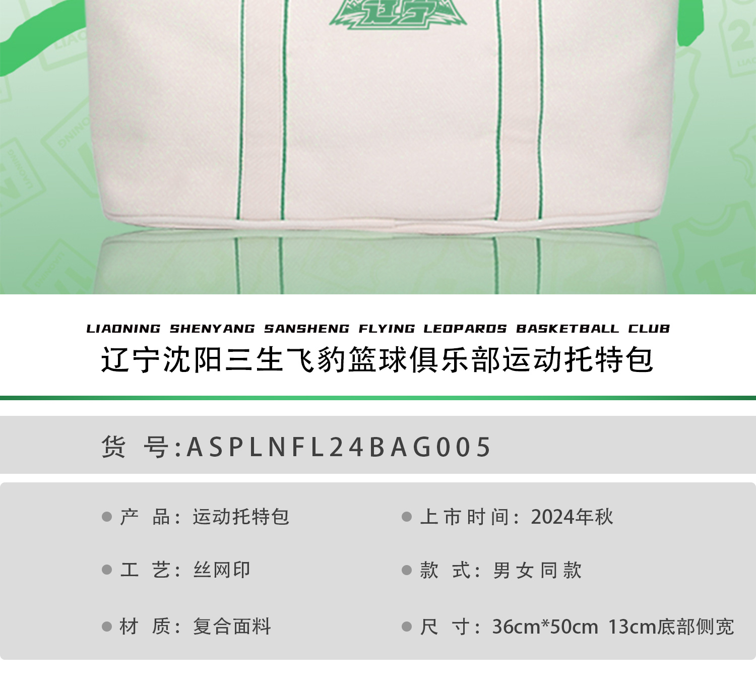 【官方正版】辽宁飞豹男篮 | 白绿运动托特包大容量帆布挎包