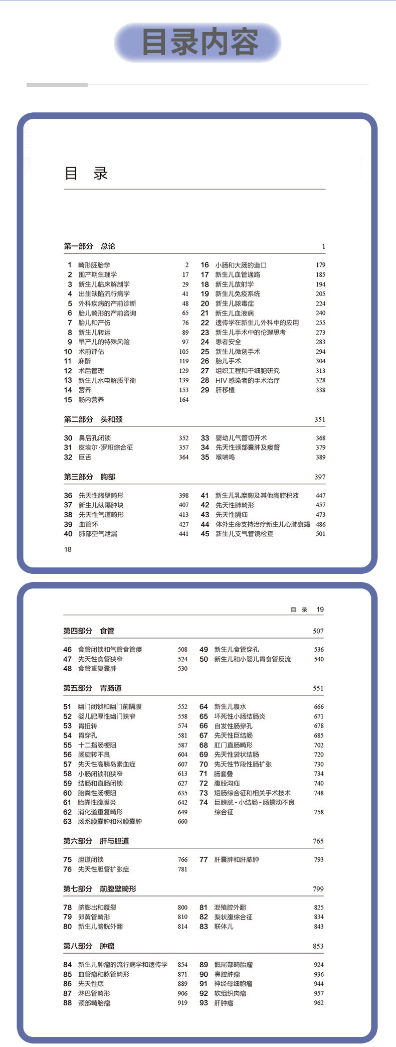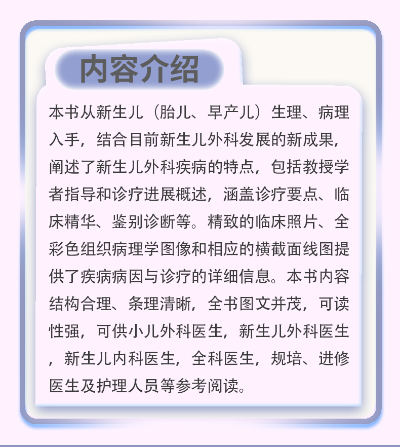 本书从新生儿(胎儿、早产儿)生理、病理入手,结合目前新生儿外科发展的**成果,阐述了新生儿外科疾病的特点,包括专家指导和诊疗进展概述,涵盖诊疗要点、临床精华、鉴别诊断等。精致的临床照片、全彩色组织病理学图像和相应的横截面线图提供了疾病病因与诊疗的详细信息。本书内容结构合理、条理清晰,全书图文并茂,可读性强,可供小儿外科医生,新生儿外科医生,新生儿内科医生,全科医生,规培、进修医生及护理人员等参考阅读。