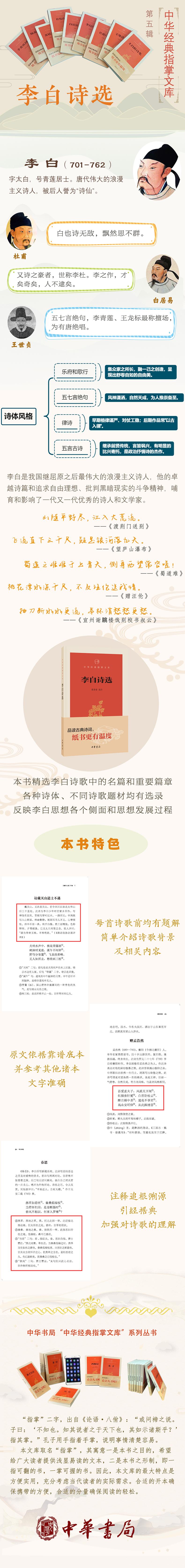 葛景春选注的这本《李白诗选》所选的基本上都是李白诗歌中的名篇和重要篇章。以乐府歌行和绝句为主。同时,为反映李白思想各个侧面和思想发展过程,各类诗都适当地选一些,各个时期的诗也都有所照顾。从诗歌题材上讲,李白的诗是以写友谊和山水见长,特别是他一些歌颂祖国大好河山的诗,尤为读者所喜爱,适当地多选录一些。