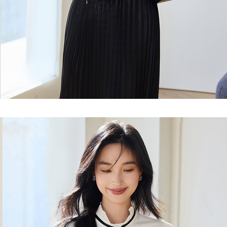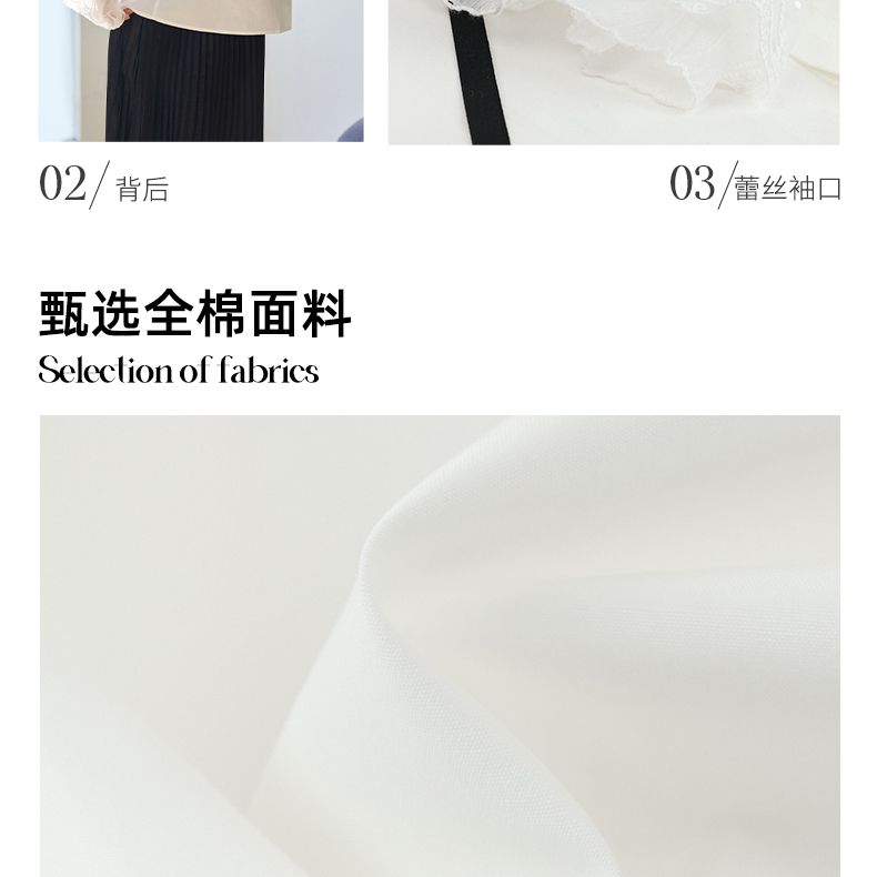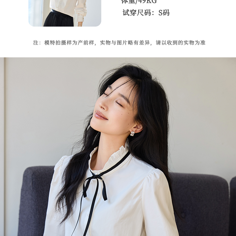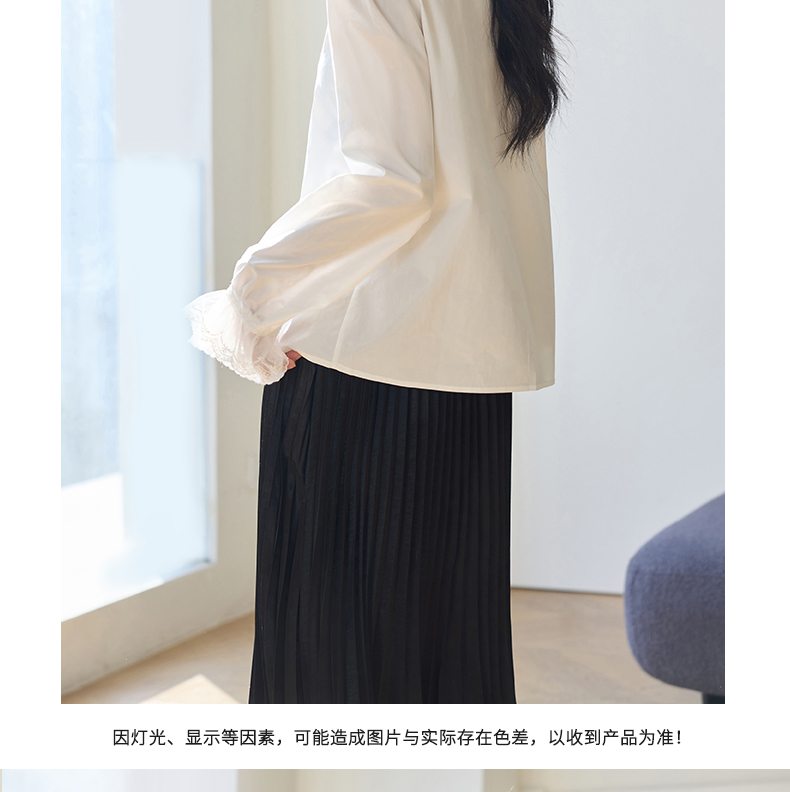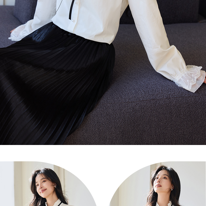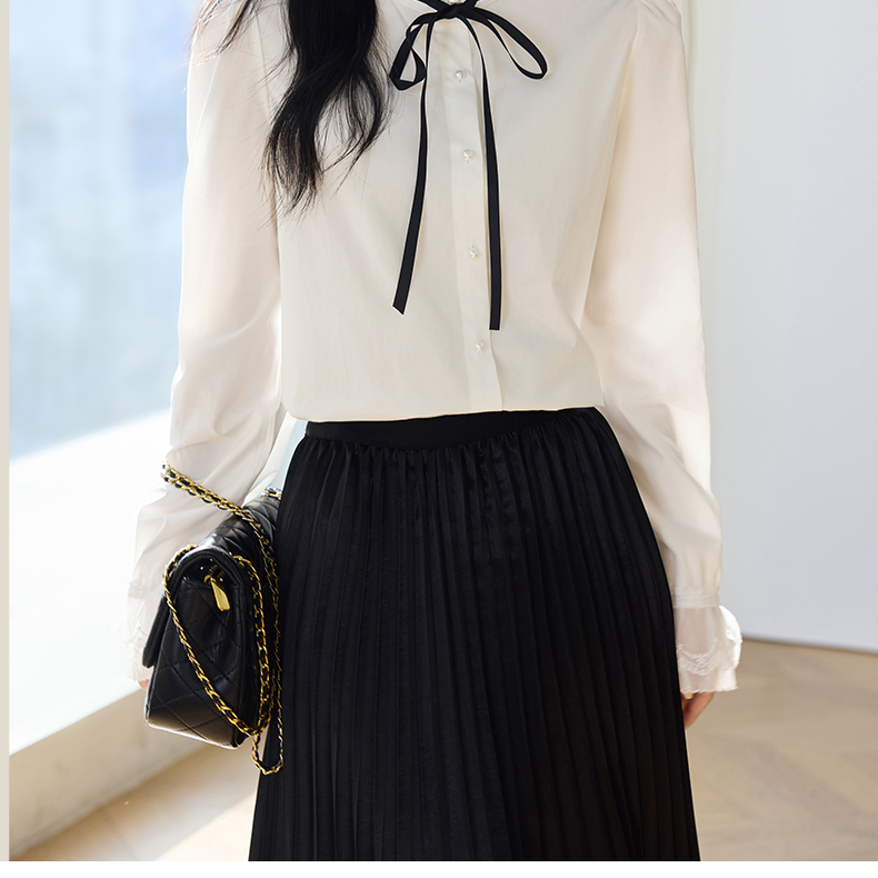 VICTORIA&VERA春季“优雅赴春日”系列全棉亲肤春游日立领黑色绑带蕾丝袖衬衫
