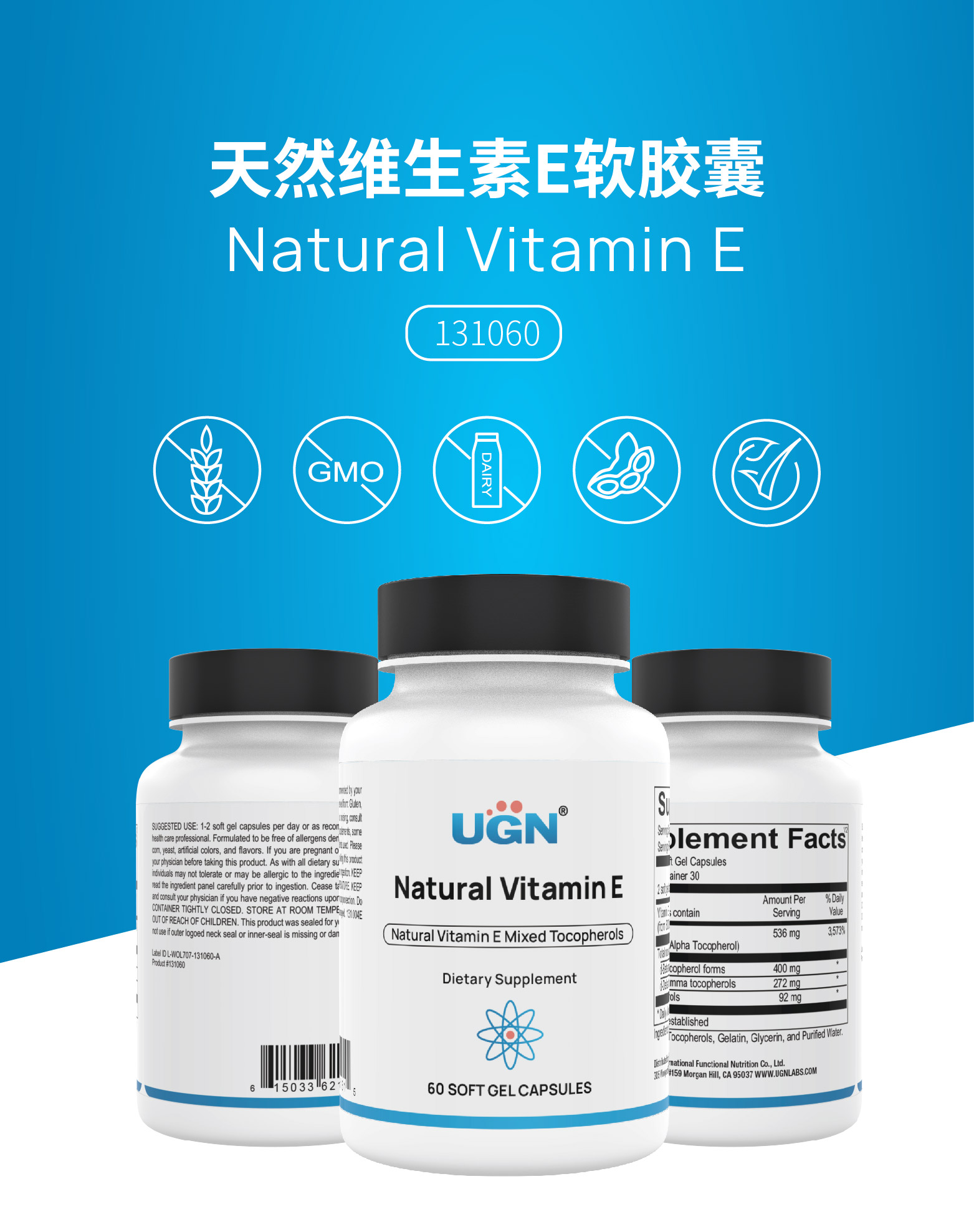 UGN(优健安)提供的Natural Vitamin E软胶囊是一款高含量、天然、全谱脂溶性维生素E膳食补充剂产品。配方包括四种(α、β、γ 和 δ)不同形式的维生素E,是维生素E补充的极佳选择。