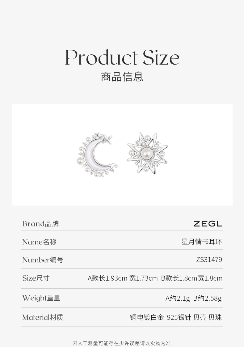 ZEGL设计师秋夜甜梦系列星月耳钉女2022年新款潮贝壳耳环银针耳饰