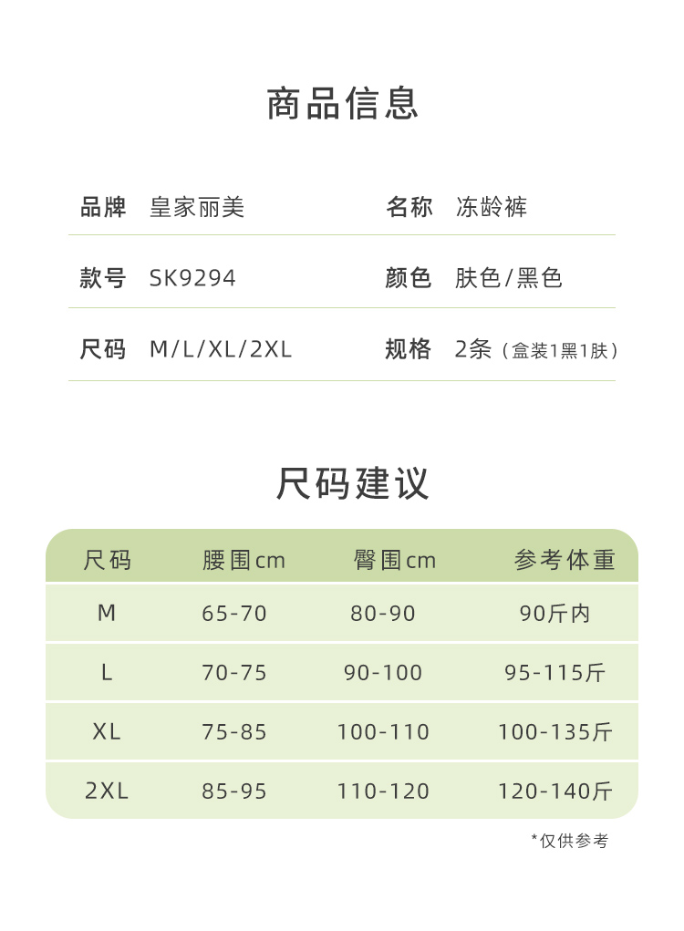 皇家丽美明星款高腰养护型冻龄裤无痕提臀收腹薄款夏季安全打底裤2条装SK9392SK9394SK9397SK9398