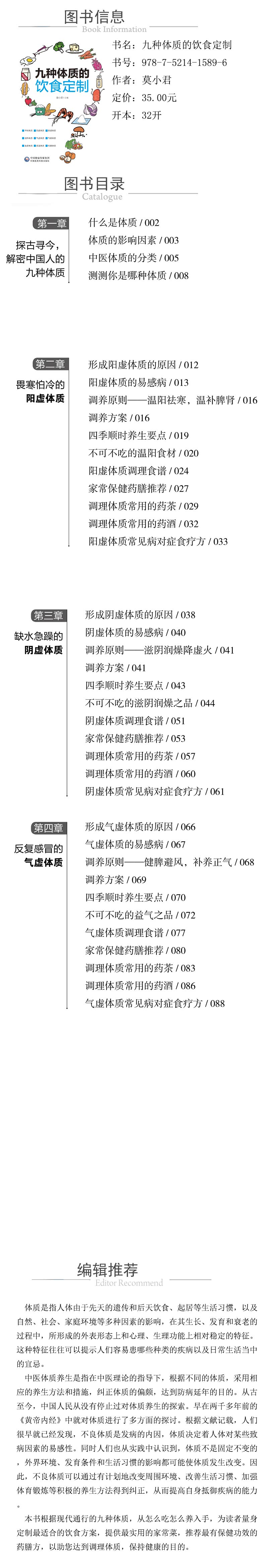 中医体质养生是指在中医理论的指导下,根据不同的体质,采用相应的养生方法和措施,纠正体质的偏颇,达到防病延年的目的。本书根据《黄帝内经》中的九种体质,从怎么吃怎么养入手,为读者量身定制*适合的饮食方案,为他们提供*日常的家常菜,*有保健功效的药膳方,调理体质,达到保健健康的目的。