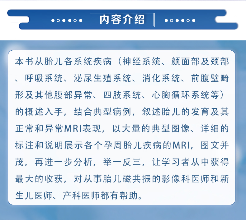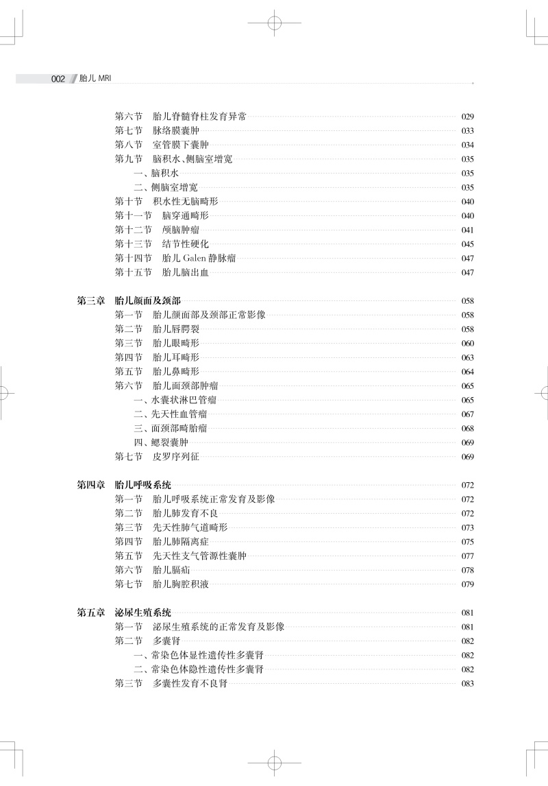 本书从胎儿各系统疾病(神经系统、颜面部及颈部、呼吸系统、泌尿生殖系统、消化系统、前腹壁畸形及其他腹部异常、四肢系统、心胸循环系统等)的概述入手,结合典型病例,叙述胎儿的发育及其正常和异常MRI表现,以大量的典型图像、详细的标注和说明展示各个孕周胎儿疾病的MRI,图文并茂,再进一步分析,举一反三,让学习者从中获得最大的收获,对从事胎儿磁共振的影像科医师和新生儿医师、产科医师都有帮助。