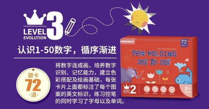芙蓉天使的控笔训练卡源自欧美早教机构的运笔理念。分为适合3岁的阶段1(线条练习)、适合4岁的阶段2(描点成线)、适合5岁的阶段3(数字连线)。