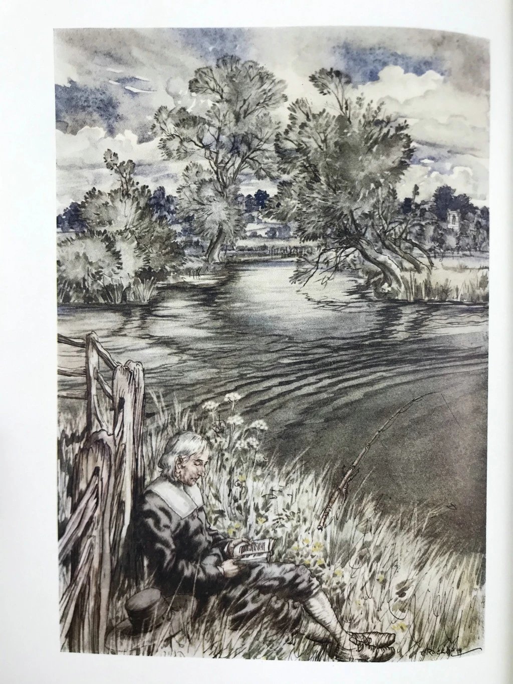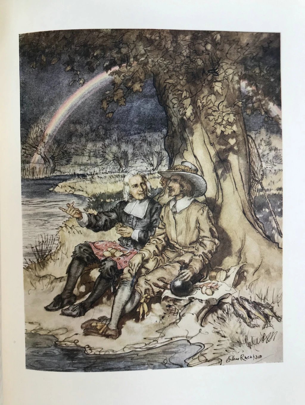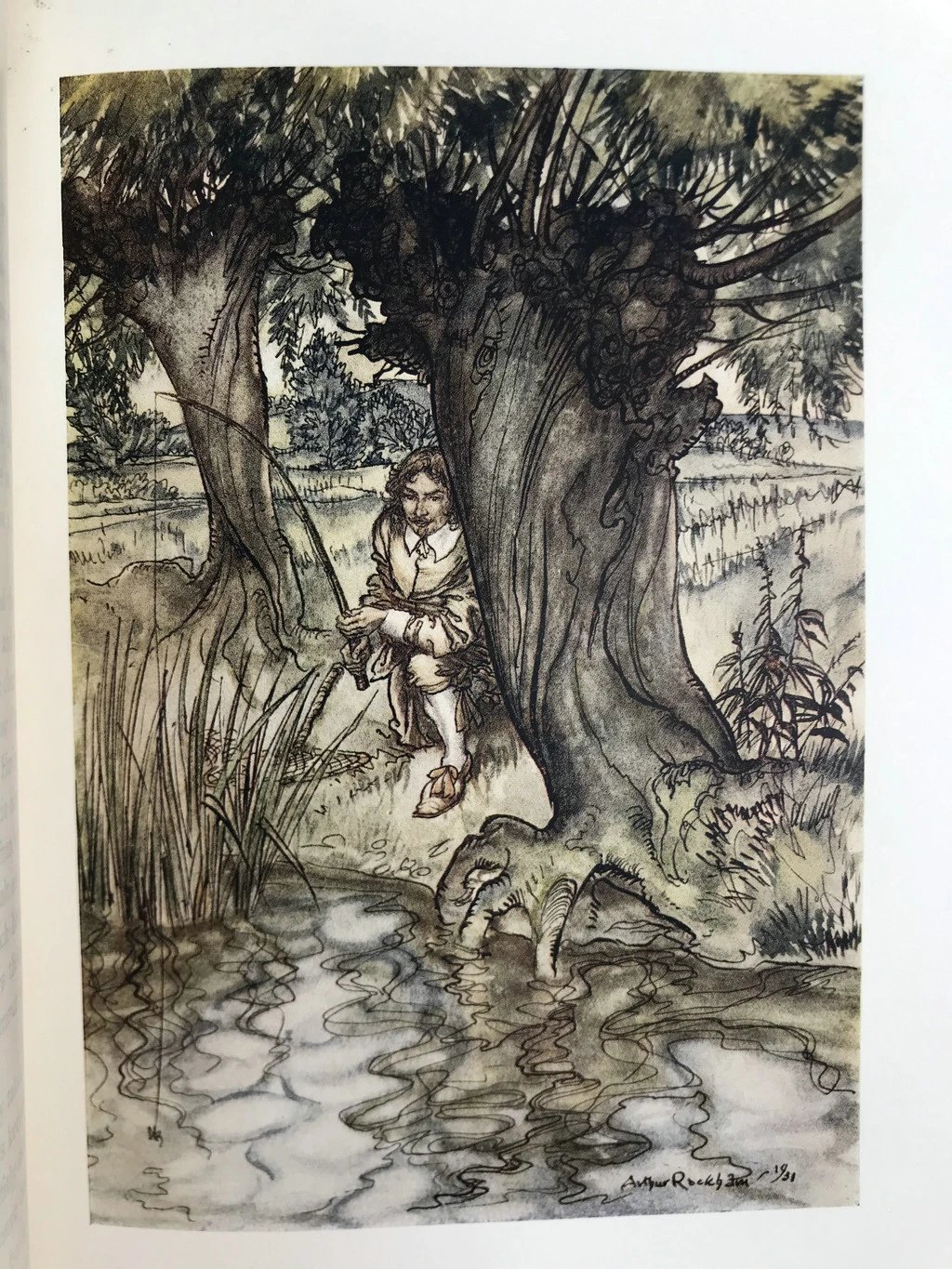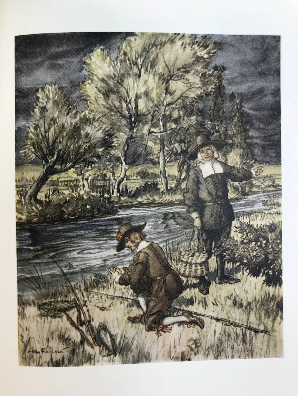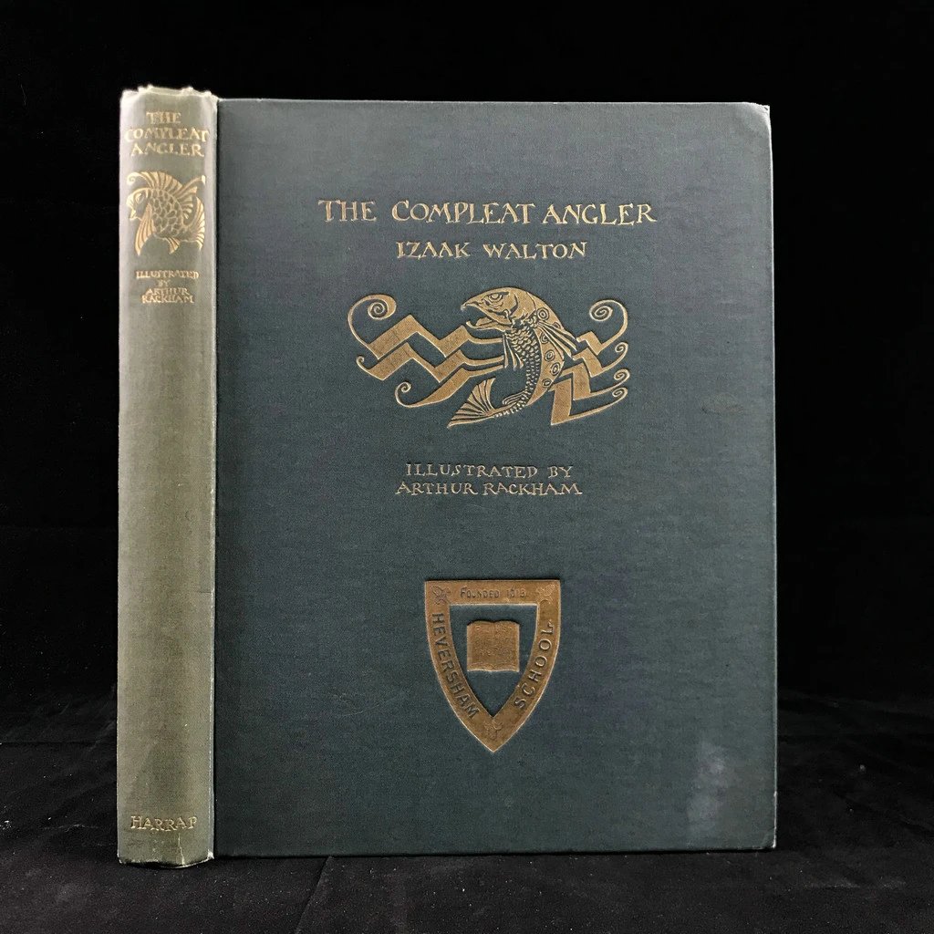 鬼才拉克姆12幅彩色手工贴图!1931年 沃尔顿《钓客清话》 漆布精装16开