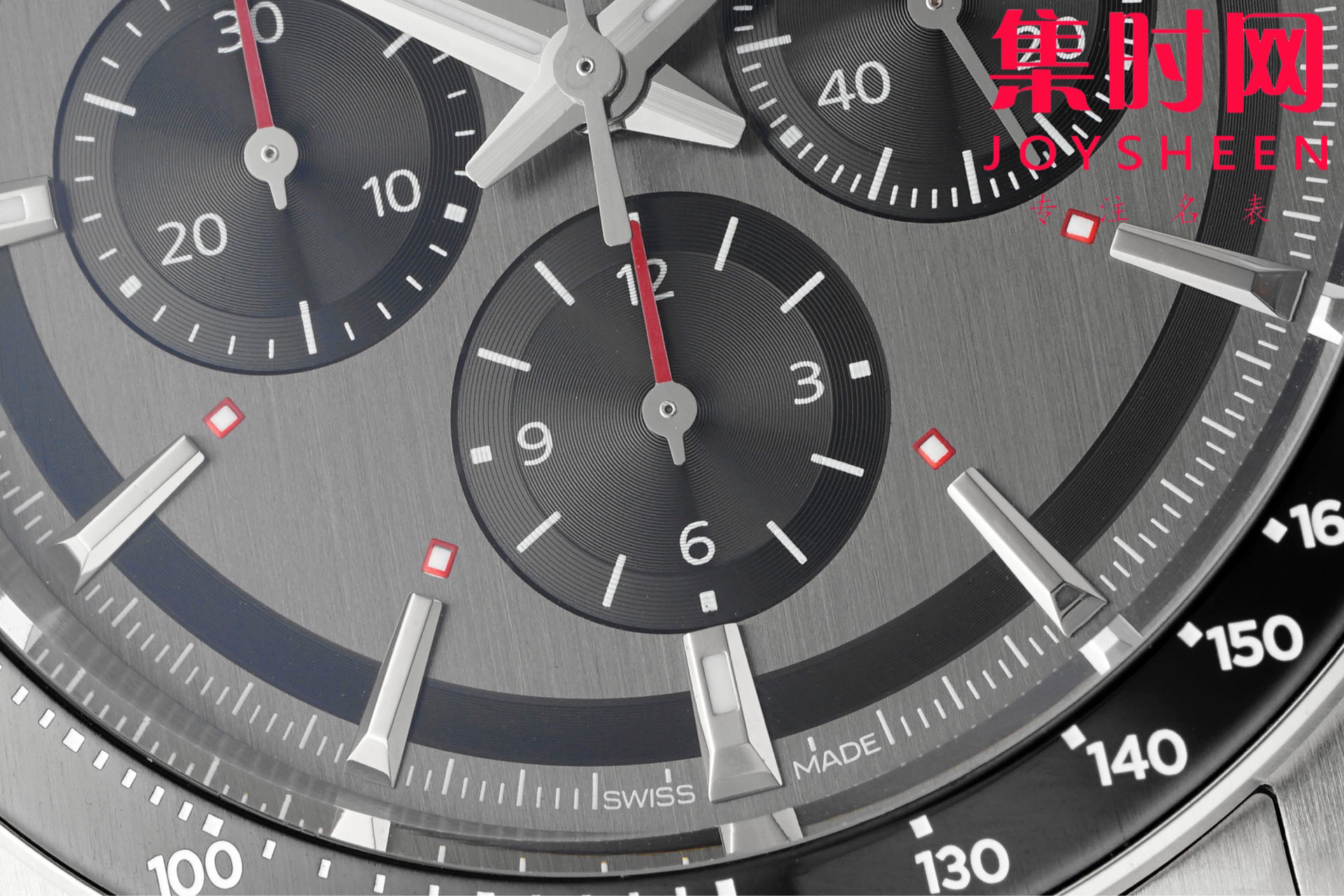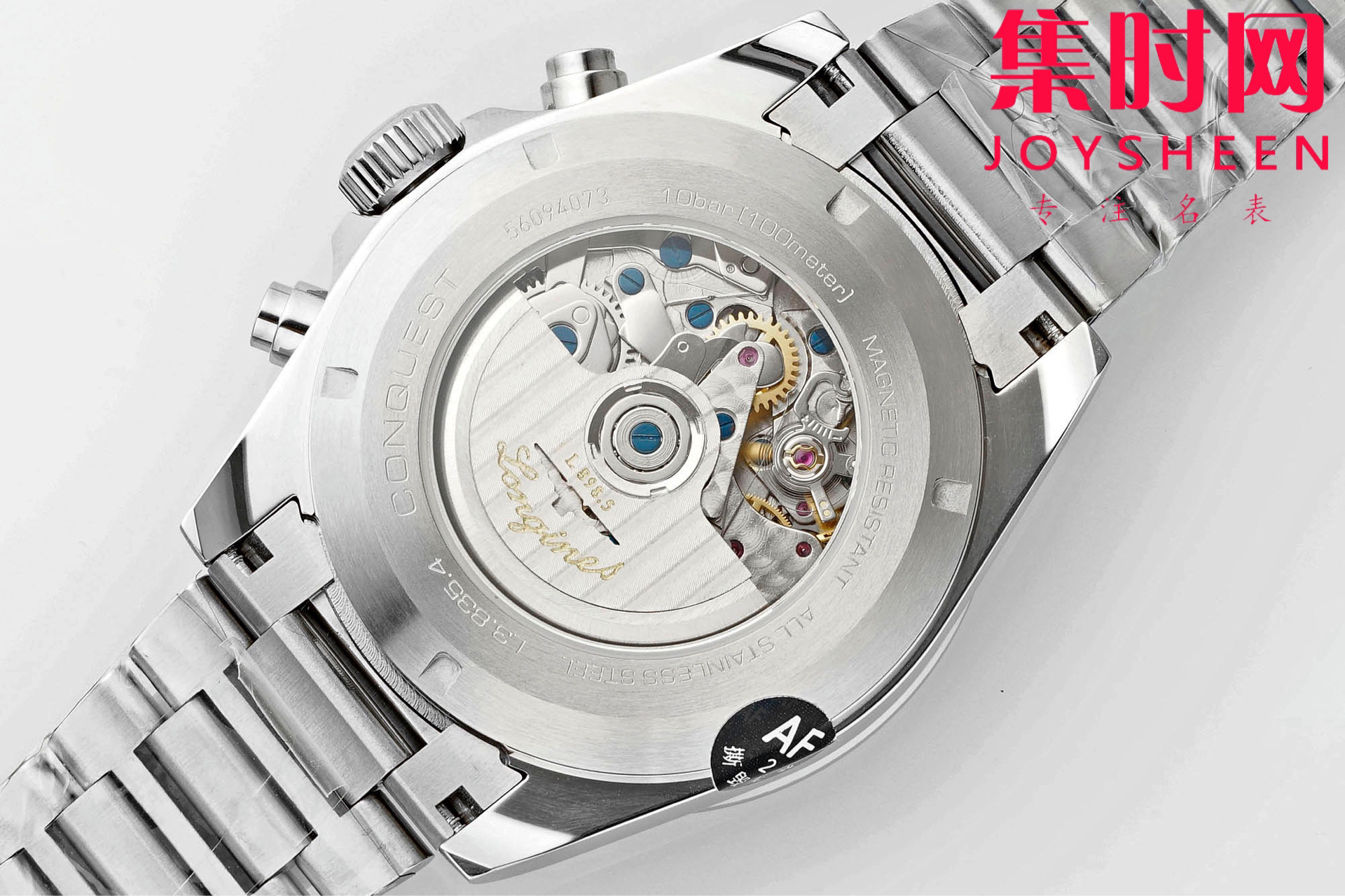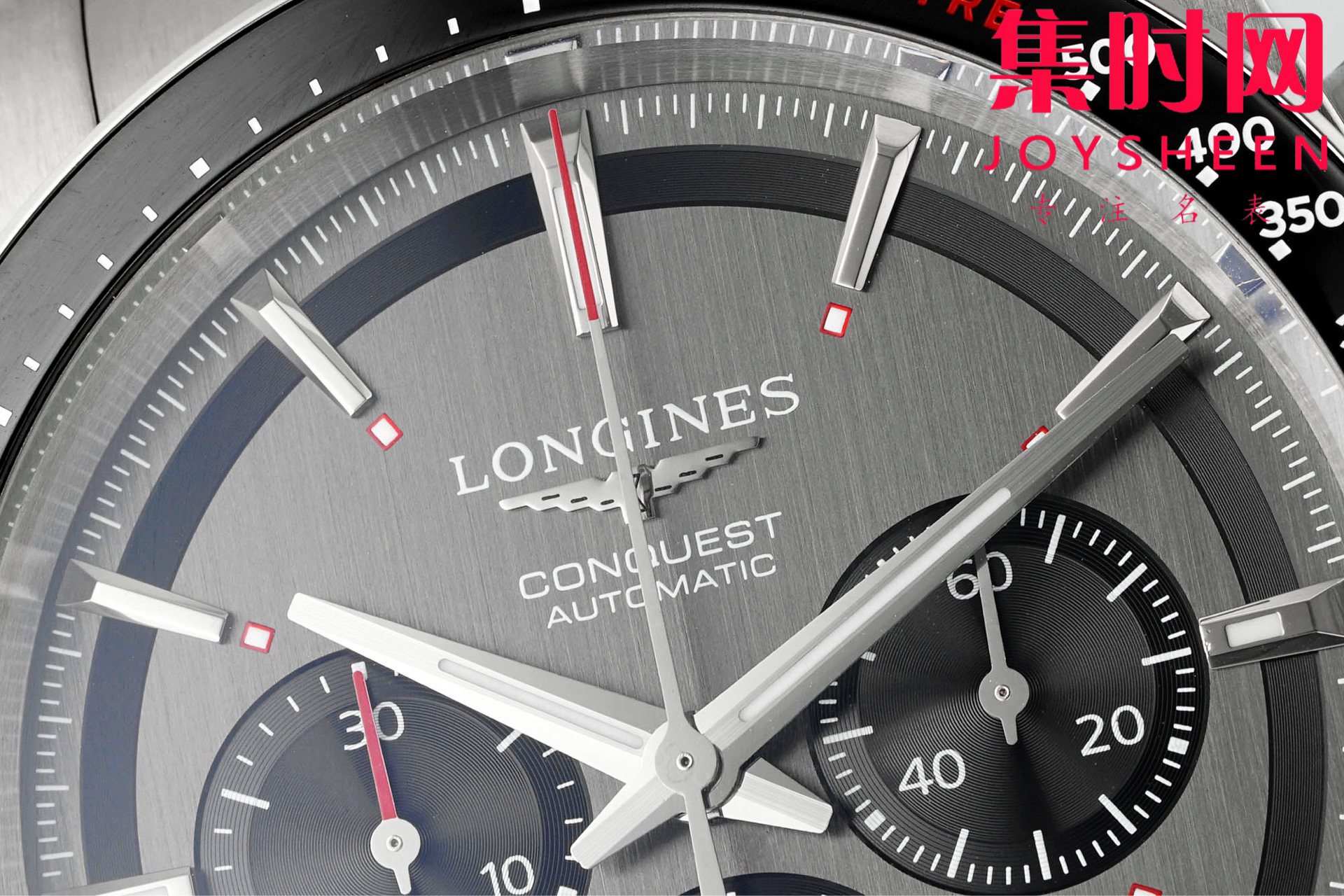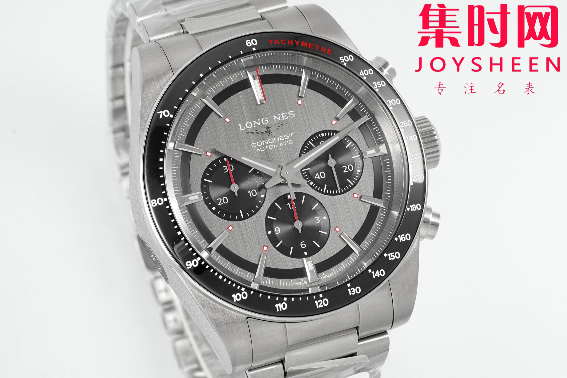 AF浪琴康卡斯计时系列 康卡斯悦动计时 男士腕表 钢带款 表径42mm,使用陶瓷表圈,表圈上有有测速圈,并有红字点缀。
