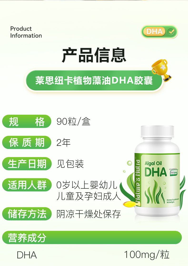 【保税仓发货 包邮包税 新生儿可用】莱思纽卡DHA婴幼儿宝宝儿童孕妇海藻油胶囊90粒/瓶