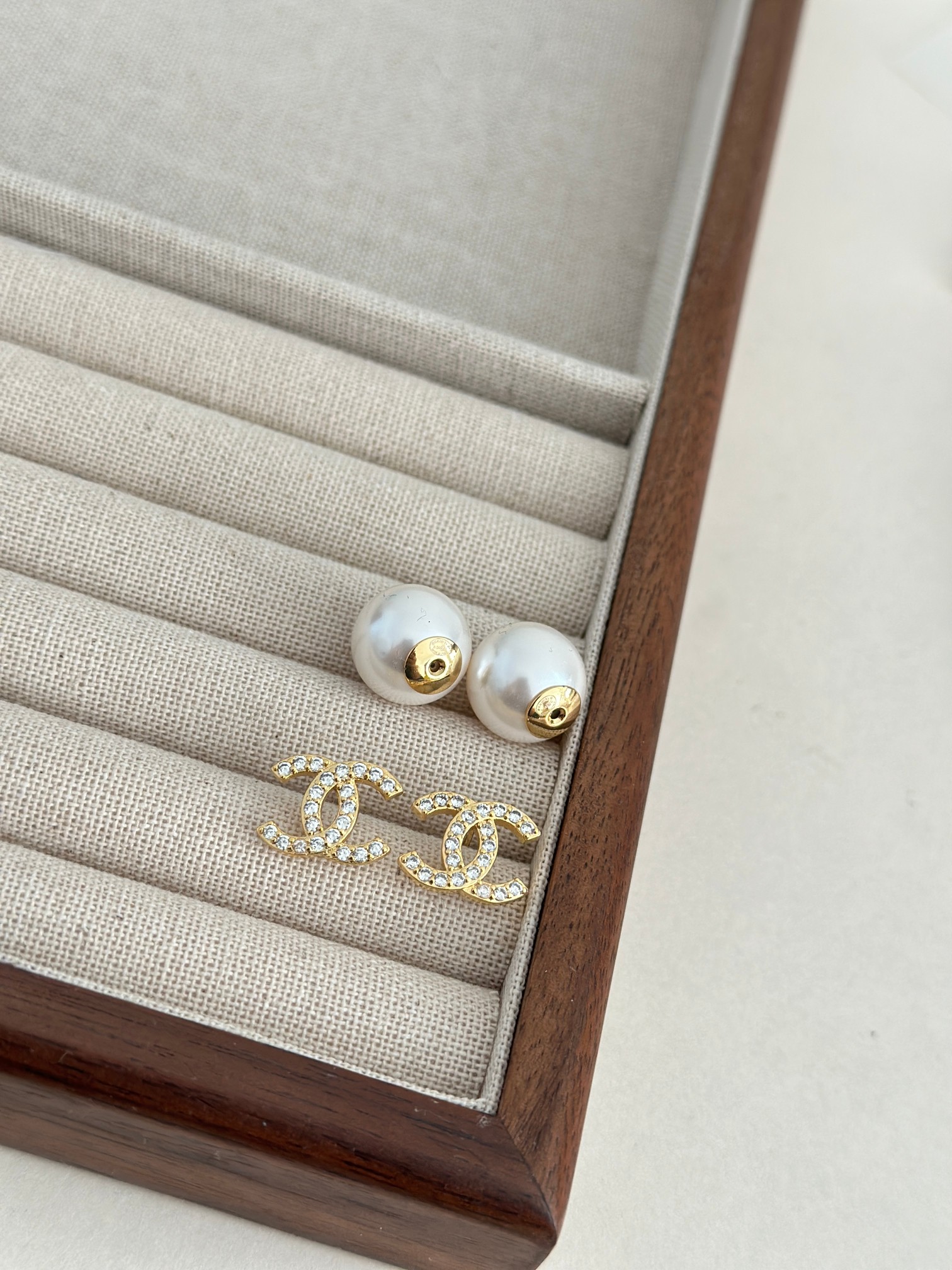 经典双C镶嵌施华洛世奇水晶,搭配珍珠耳堵,简约高级百搭,百看不厌!这个大小不管什么场合都不显得夸张,优雅又不张扬,很知性的感觉!通勤百搭款!