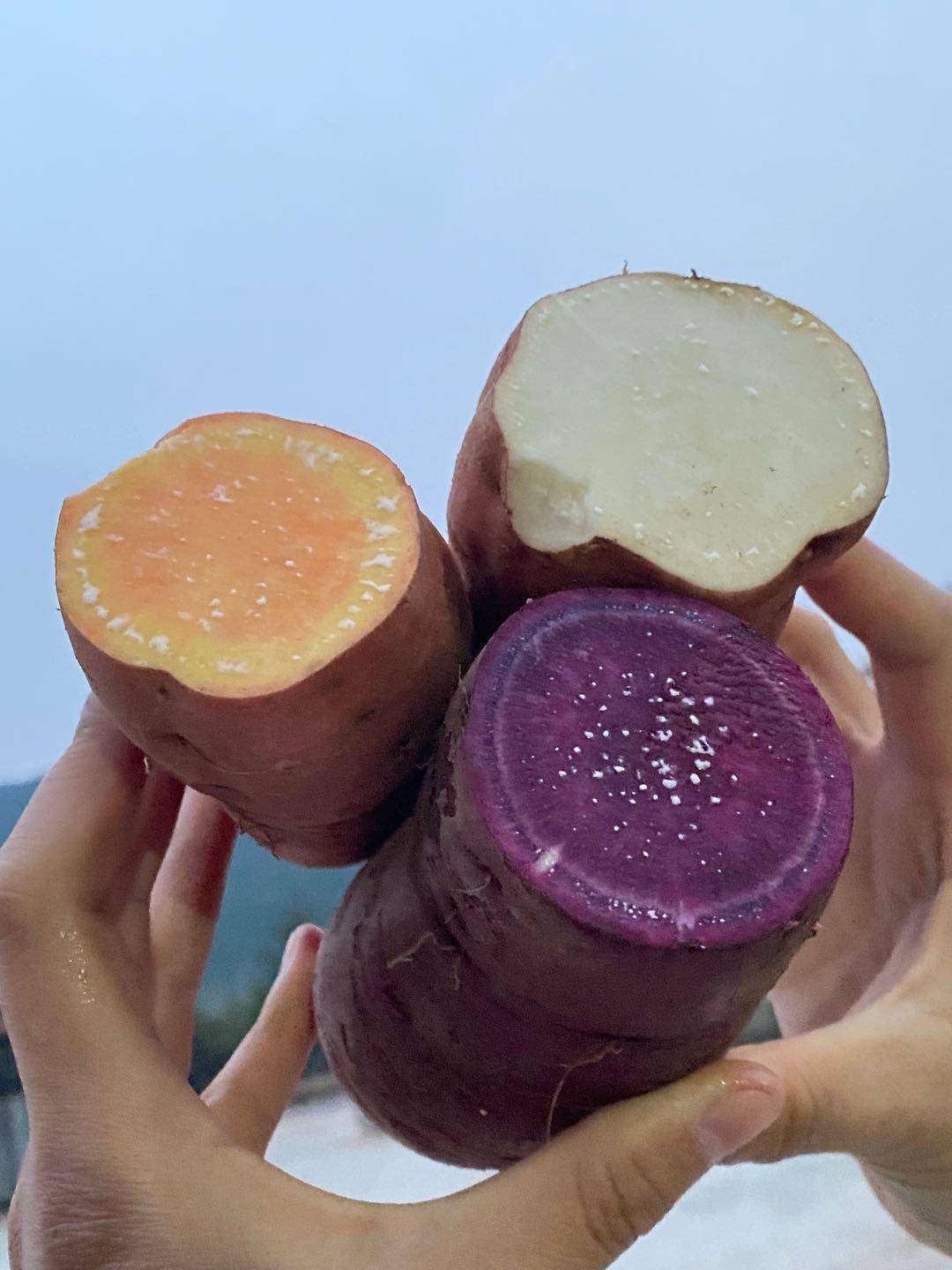 形状呈纺锤形,表皮多呈紫红色,橘红色的瓜瓤,表皮很薄,果肉厚实细腻,含水量比普通烟薯更大,甜度更高,蒸、煮、烤、炸随你造~