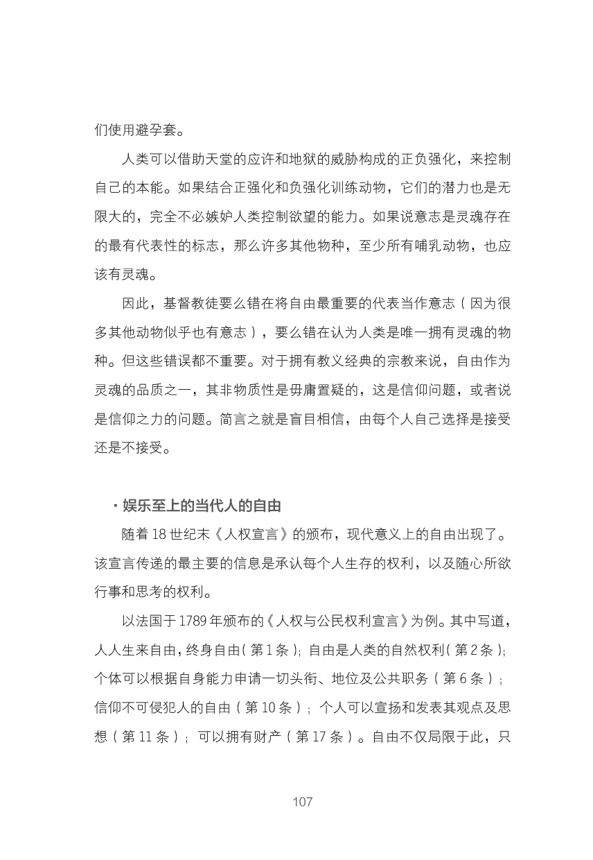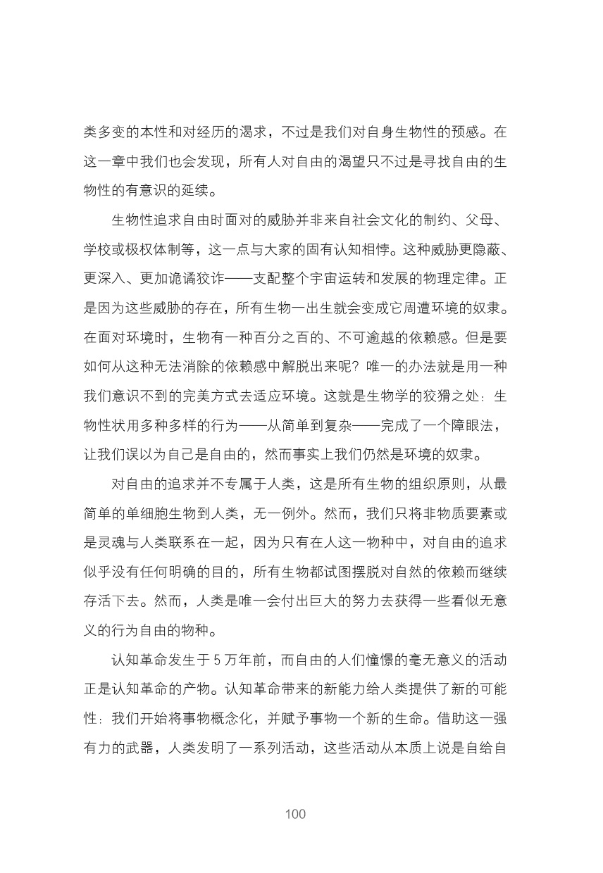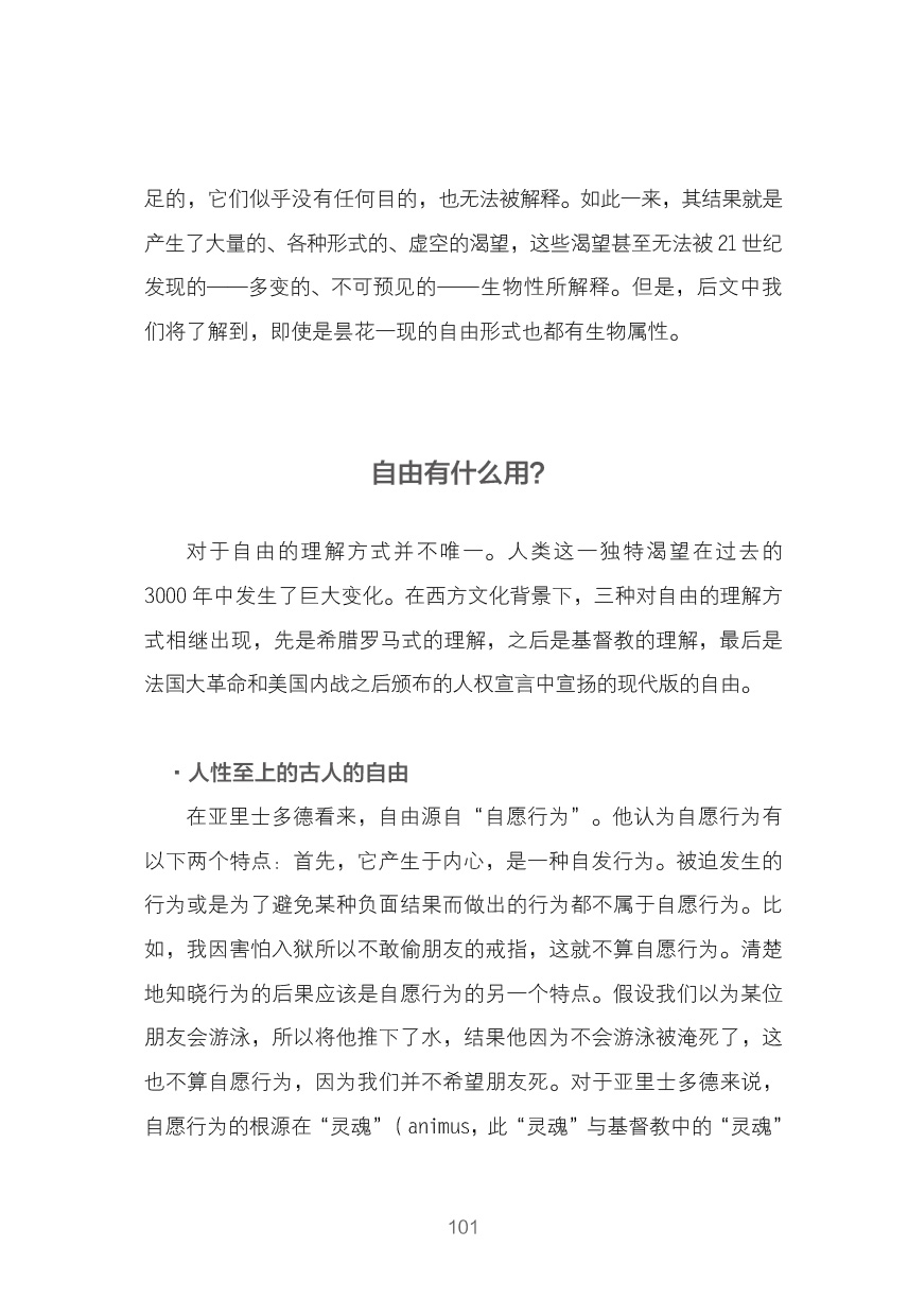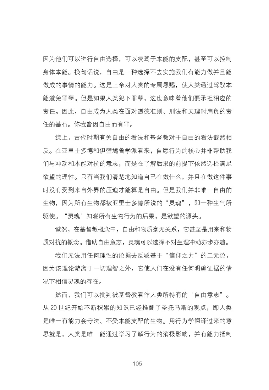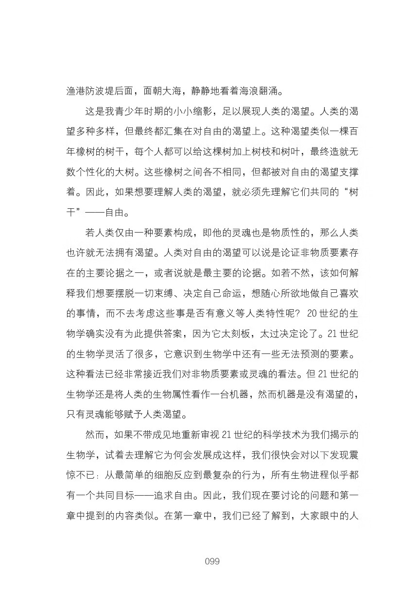 答案其实非常简单:""非物质要素""是我们能够找到的,解释我们对自身认知的最好也是最有说服力的说法。诚然,宗教在人类对这一非物质要素的信仰上做出了不可磨灭的贡献,人文和社会科学也推波助澜。但归根结底这只是一个常识问题。你我都能感受到,人类是一种难以把握的存在,我们始终处在变化之中,我们无所不能,我们在经验中锤炼自己,我们被成千上万种矛盾的愿景激励着,但这些愿景通常都是虚妄无稽的。人类的上述特点与环绕我们的物质世界的运转模式完全不同。物质世界严格遵照精准的法则运行,这使它具有可被预测的特点。由于我们需要一个不同于物质的要素来解释人类的存在,就捏造了一个非物质的东西--灵魂。
