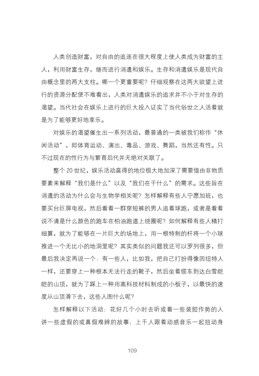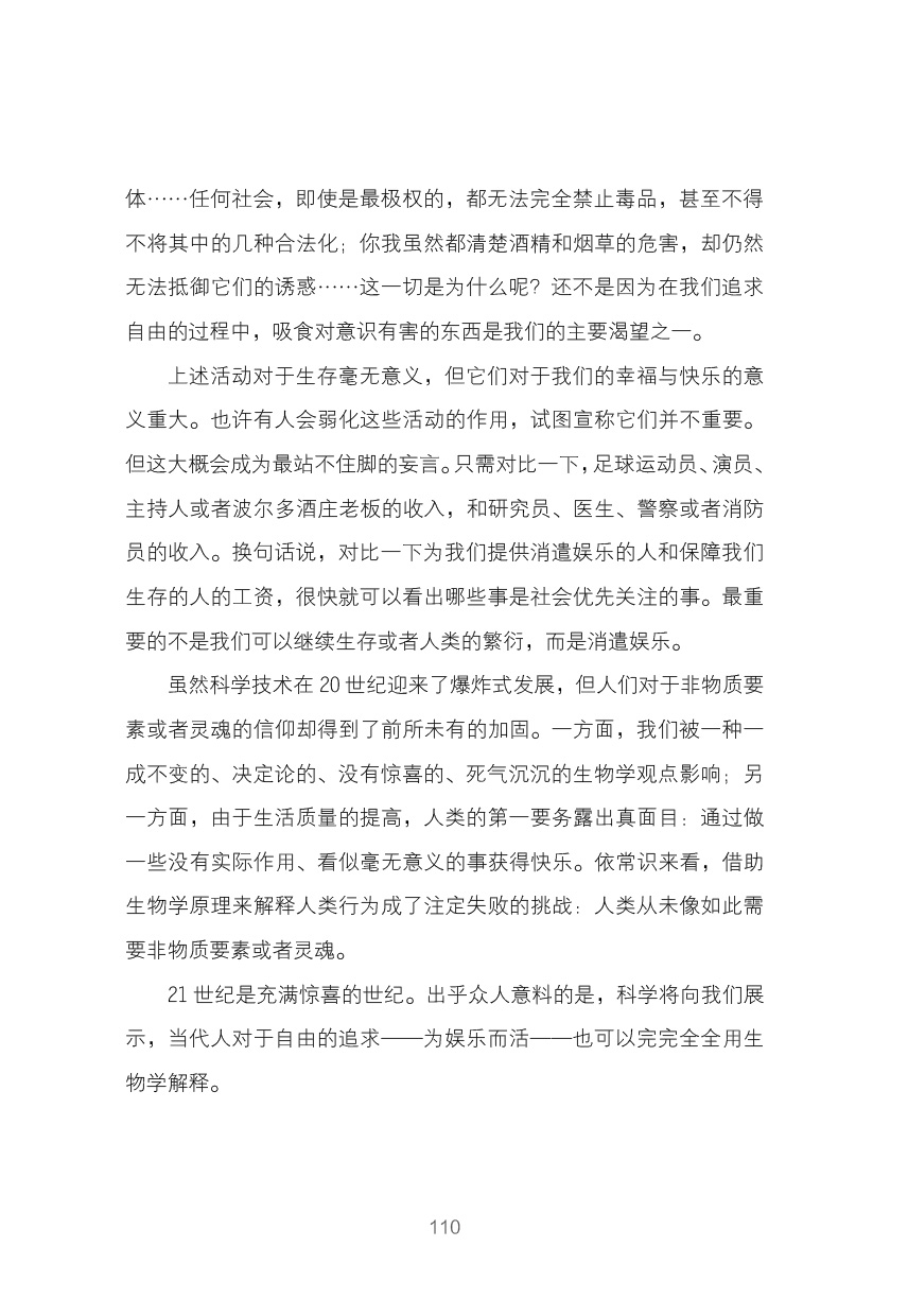 到了21世纪,生物学研究让人们意识到,过去那种一成不变的、决定论的人性学理论不再适用,一种运用物质来解释人类本质、帮助人类认识并了解自己的全新观点出现了。正如作者所说,现在我们可以更好地解释多变的人性,解释我们有时候肤浅无聊的期许,以及我们越来越明显的放纵行为。