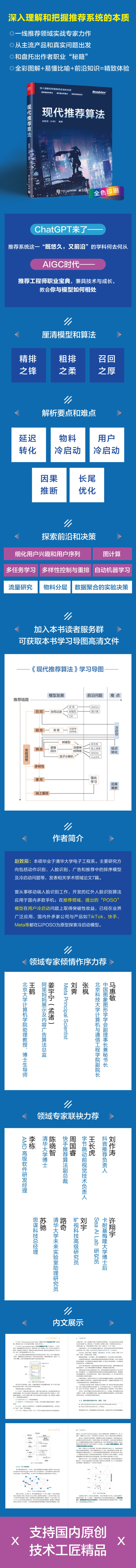 本书深入全面地讲解了现代推荐算法,同时兼顾深度和广度,介绍了当下较前沿、先进的各类算法及其实践。本书从总览篇开始,介绍推荐系统的基本概念及工作环节。在模型篇中,除了梳理推荐系统的发展史,本书还重点讲解面向工业实践的选择及改进,为读者打下推荐系统的算法基础;进而带着读者进阶到前沿篇、难点篇,面对推荐系统中的各式问题,给出解决方案;最后在决策篇中,从技术原理和用户心理出发,解释一些常见决策背后的依据,从而帮助读者从执行层面进阶到决策层面,建立大局观。本书力求用简洁易懂的语言说清核心原理,对已经有一定机器学习概念和数学基础的学生和相关领域的从业者非常友好,特别适合推荐系统、计算广告和搜索领域的从业者及学生拓展新知和项目实战。