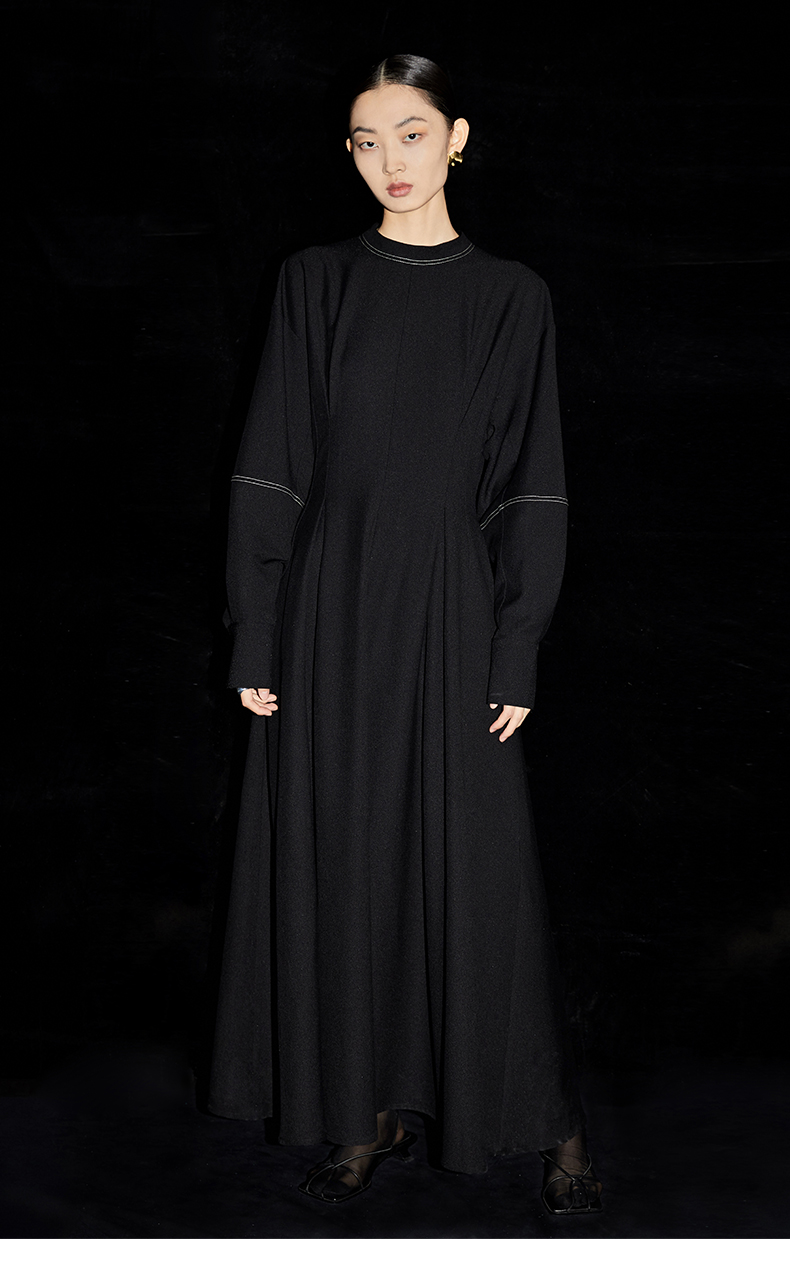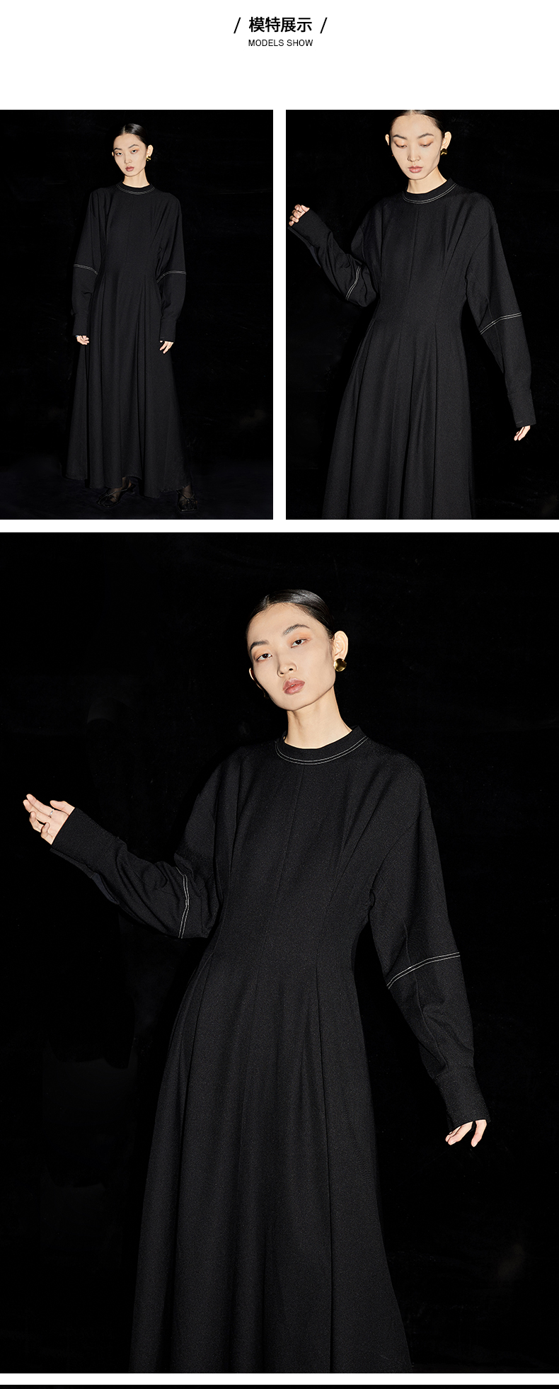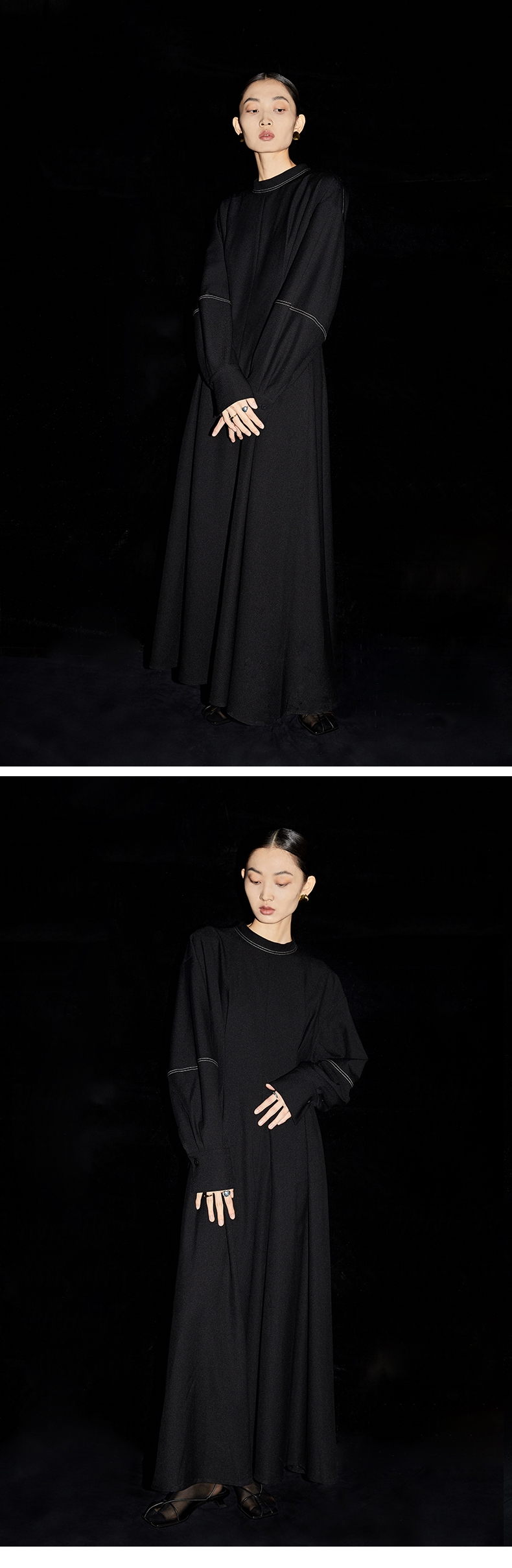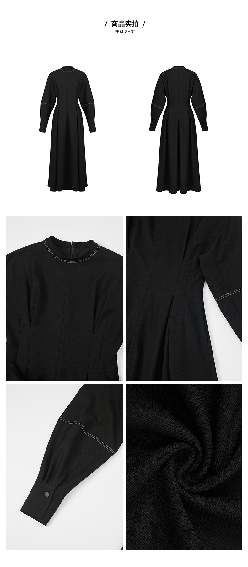 HIDEMI 黑色明线设计感廓形袖收腰显瘦连衣长裙