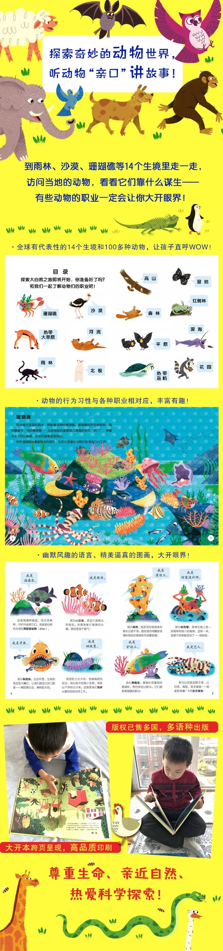 你准备好了吗?和我们一起了解动物们的职业吧!这次旅行,我们要去参观14种不同的生境;参观完每个生境,我们还要采访当地的8种动物。接受访问的动物们都出现在所属生境的首页里,而且呈现的是工作时的面貌,你能找到它们吗?