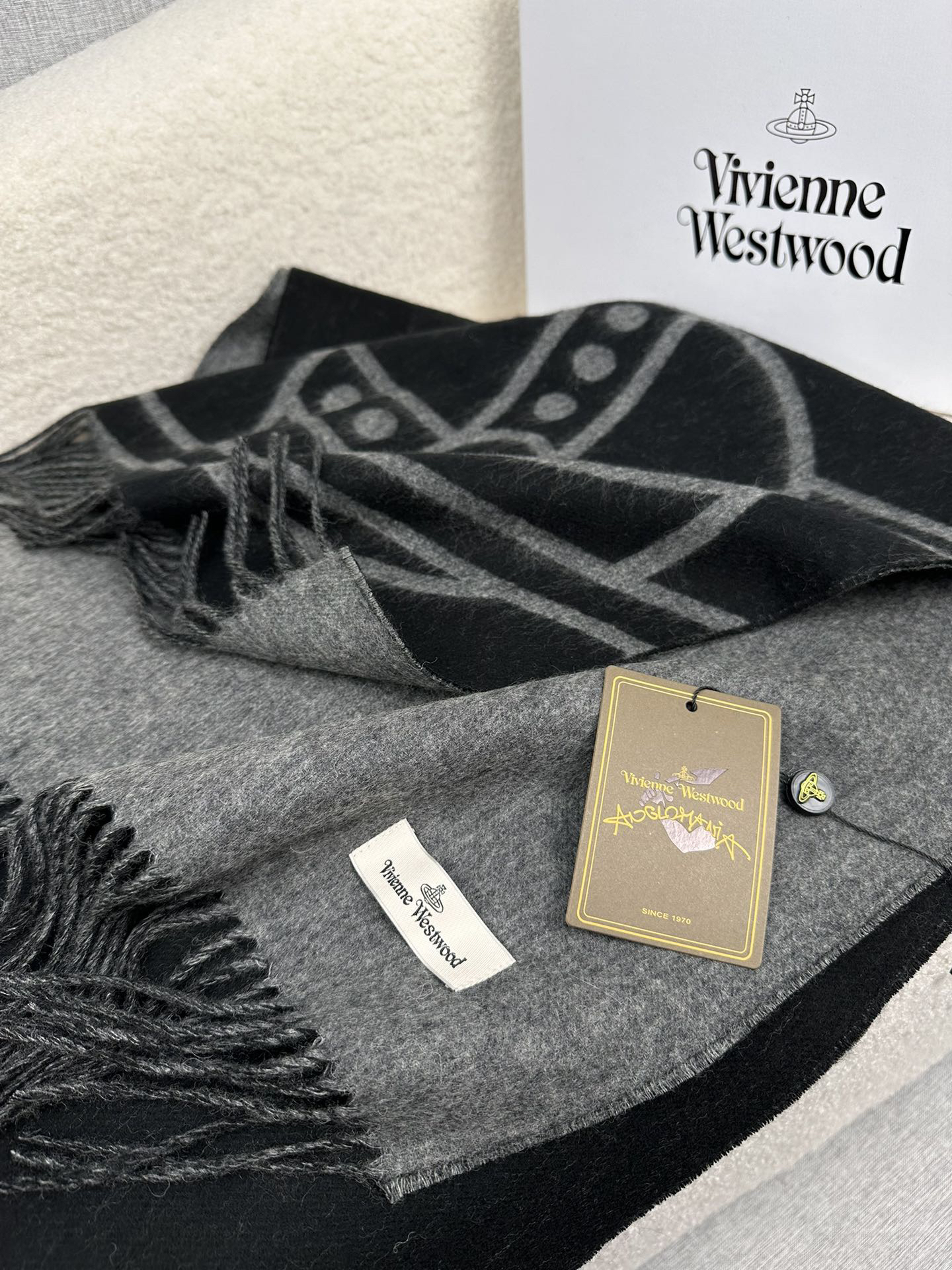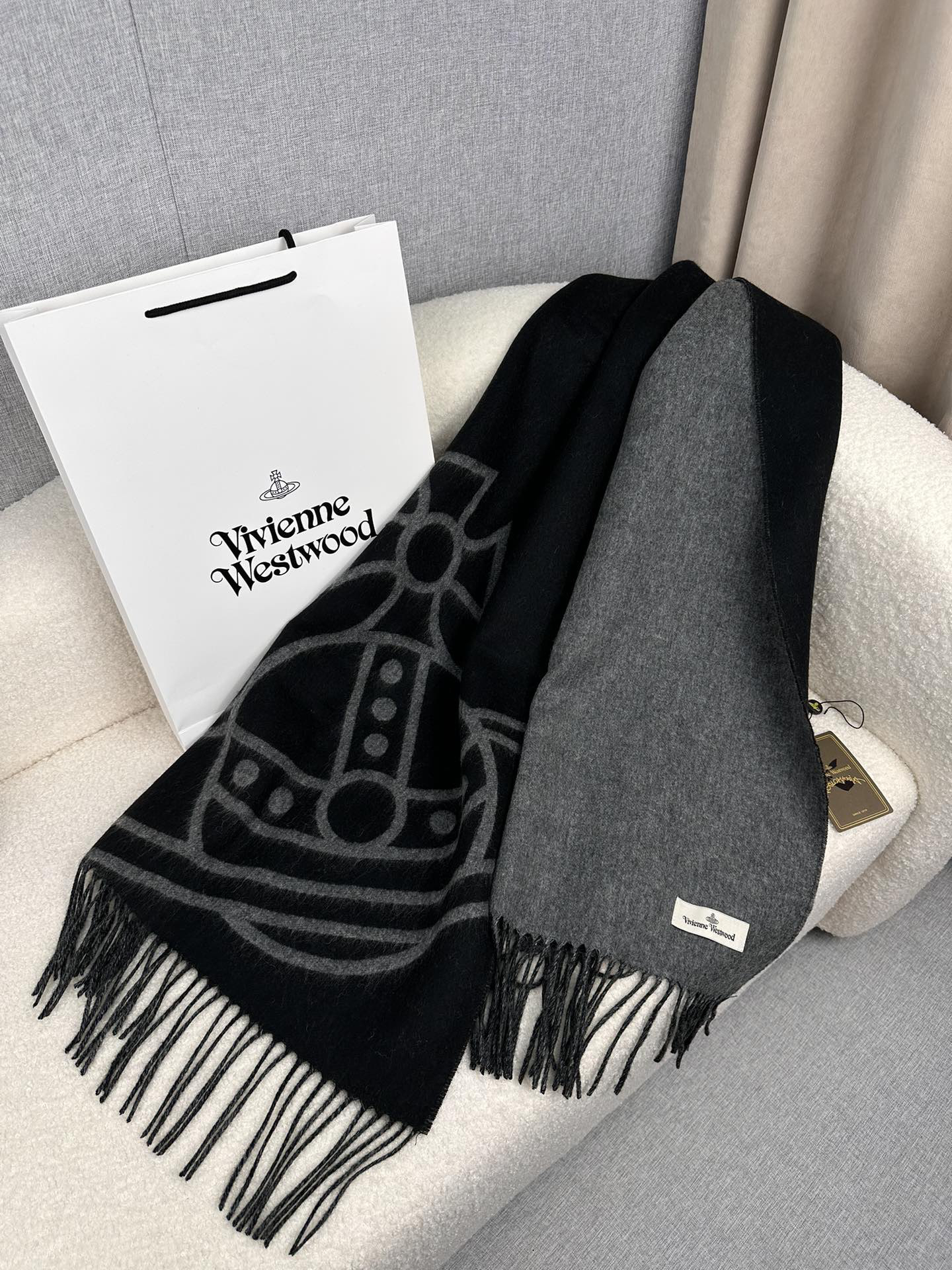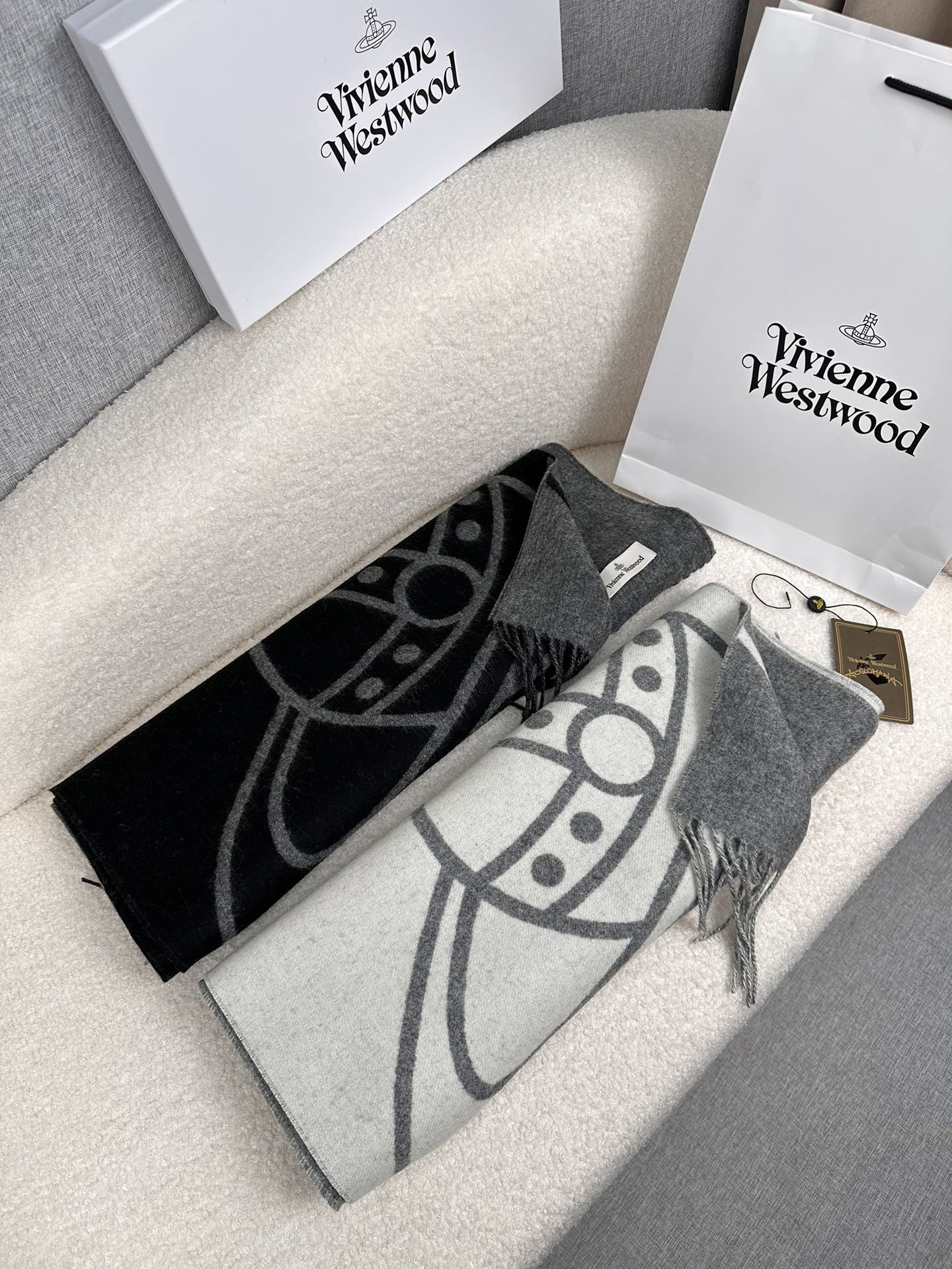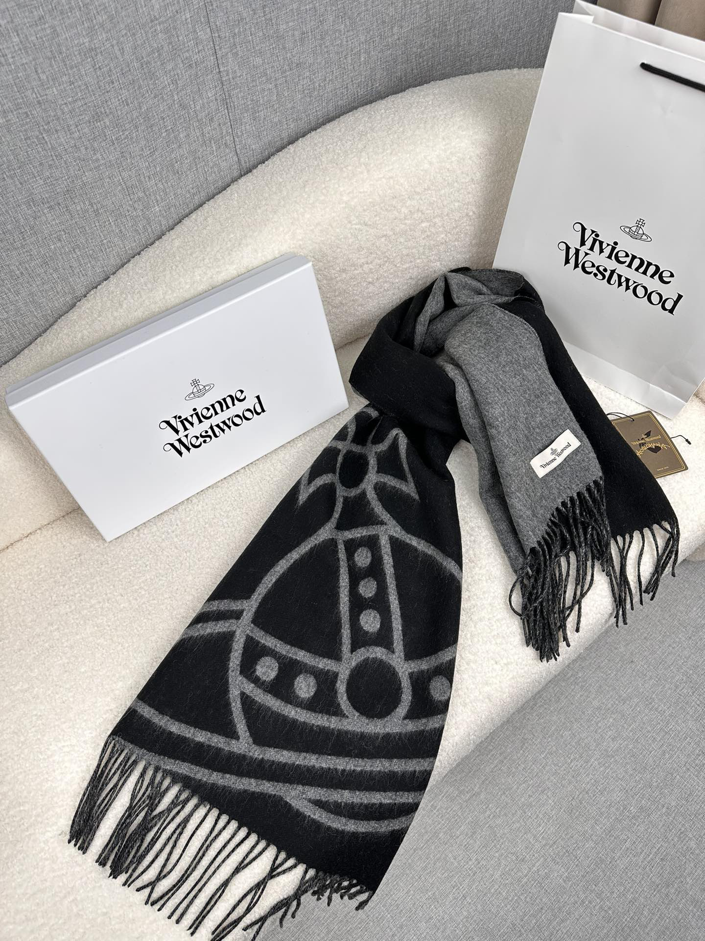 秋冬特惠💰280 英国朋克教母 西太后围巾 Vivienne Westwood”最爱的土星❗❗从精神上,Vivenne Westwood才是最能代表英国人的时尚品牌.本季强推的一款产品.❗大“土星”Logo提花,土星的意义也是和西太后的设计理念是一致的.面料采用了95%最具张力羊毛,5%羊绒.尺寸:200*50cm,双面设计,手感柔软不扎手,超级受追捧的爆款!