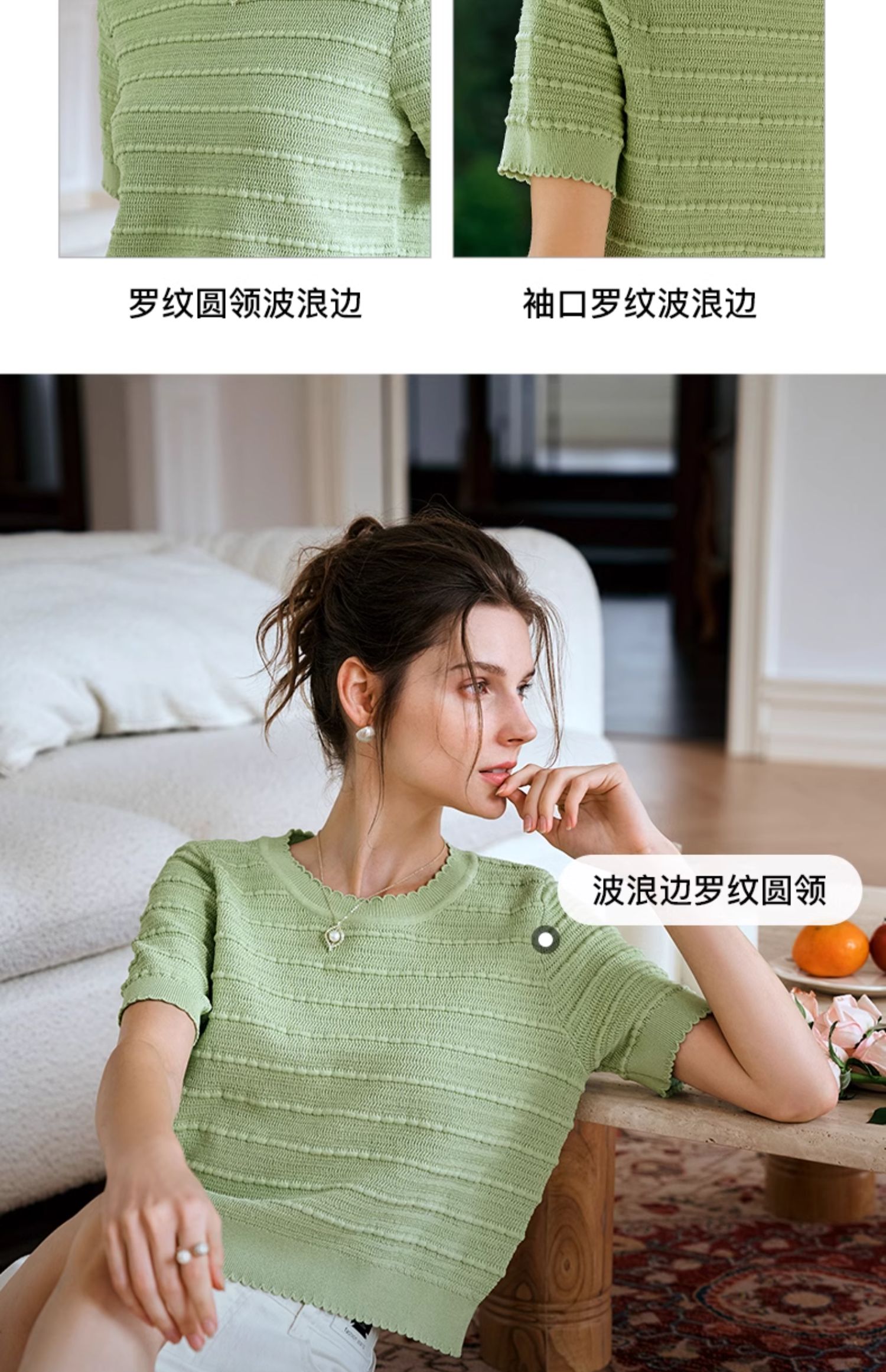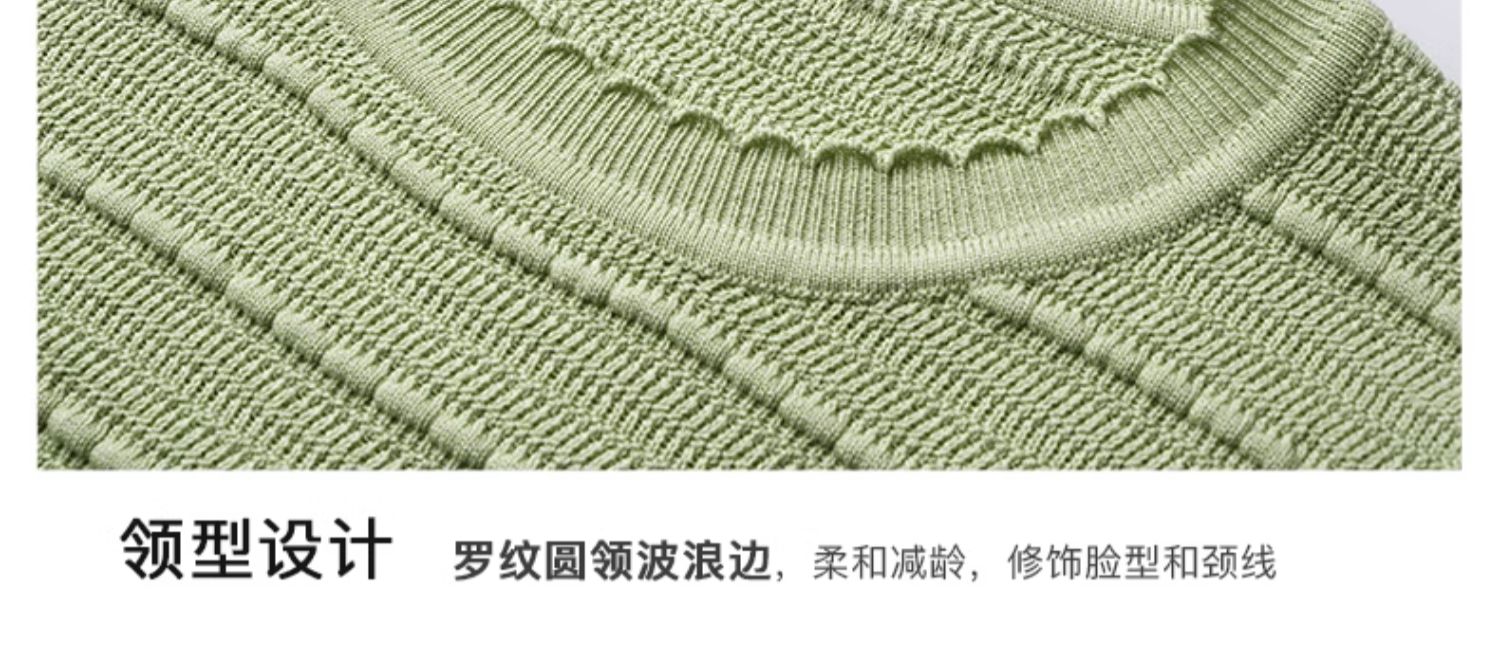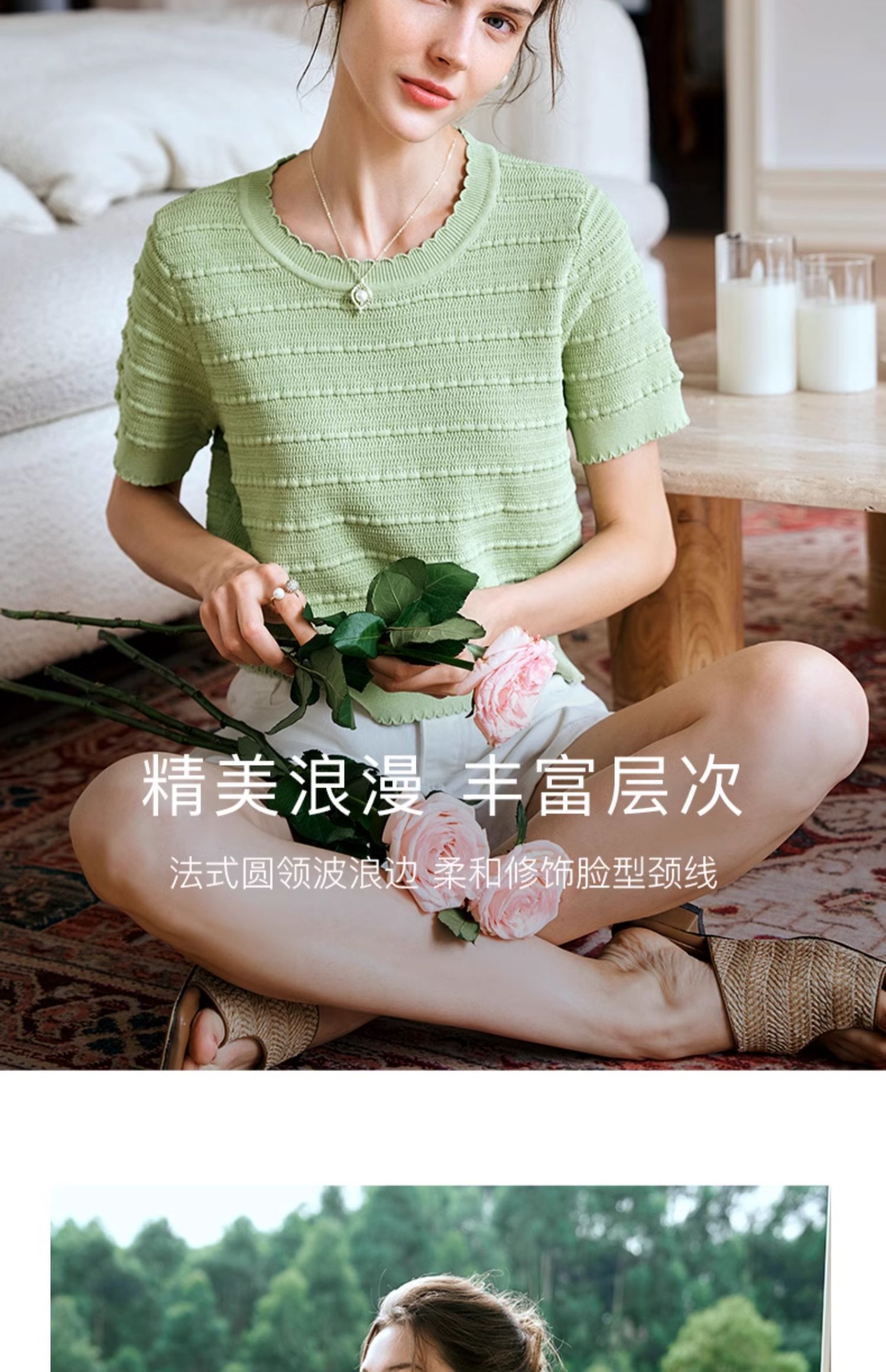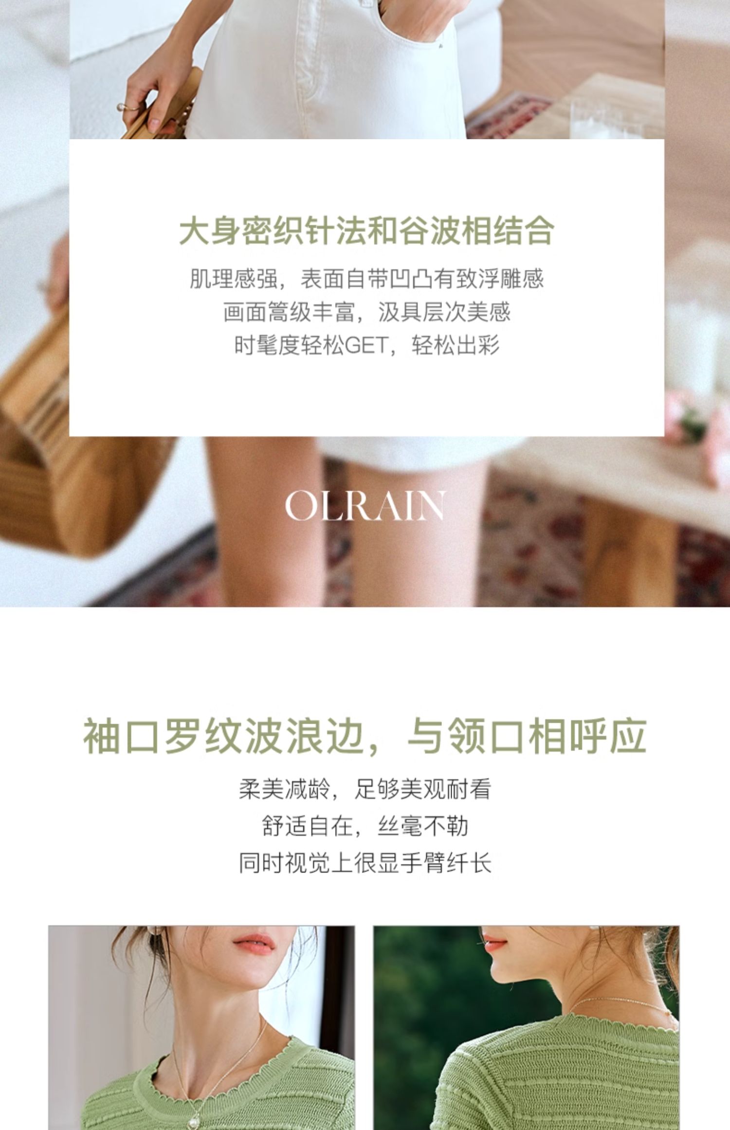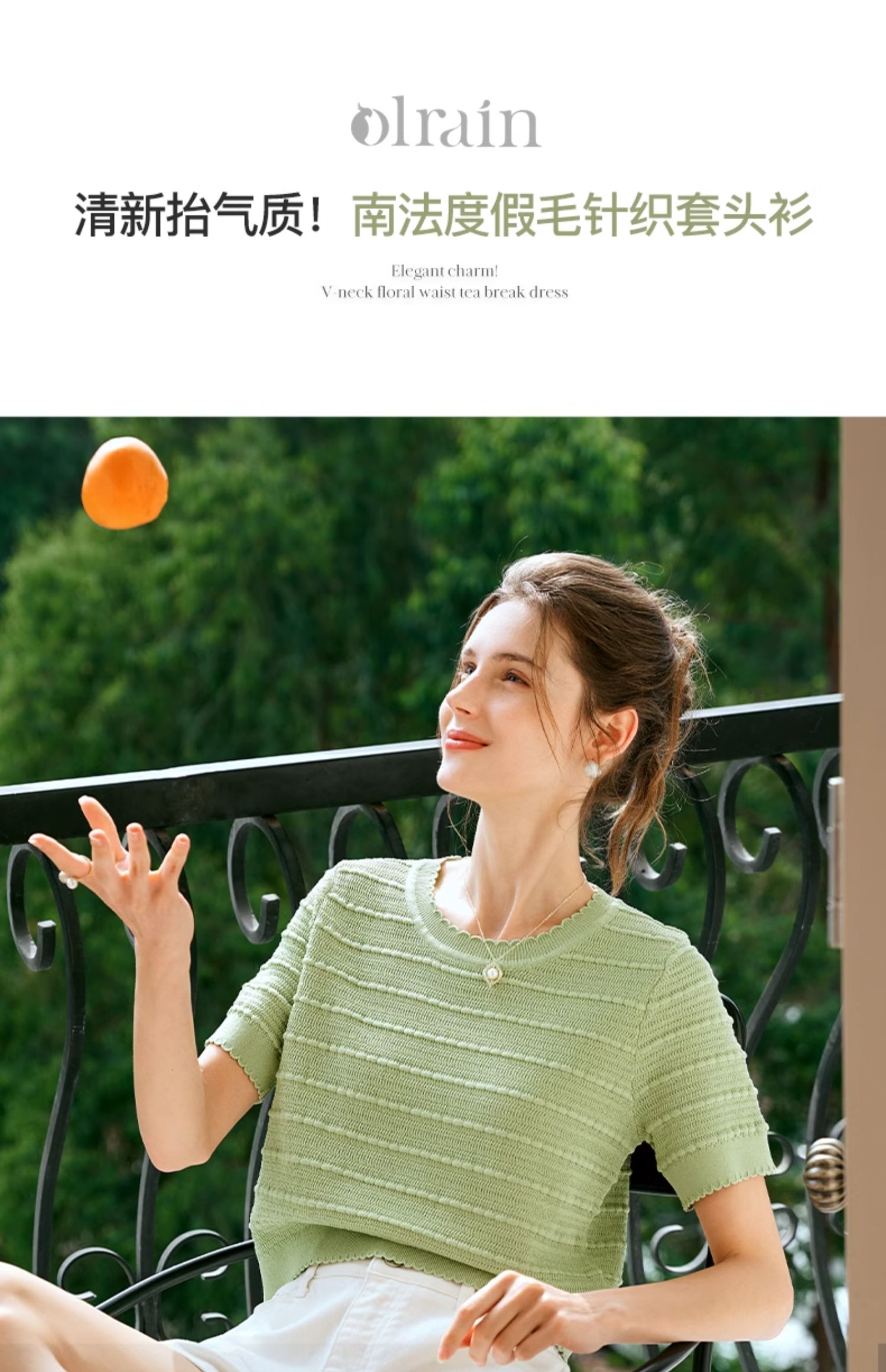 OLrain欧芮儿法式绿色针织衫女夏季2024年新款波浪边短袖套头上衣