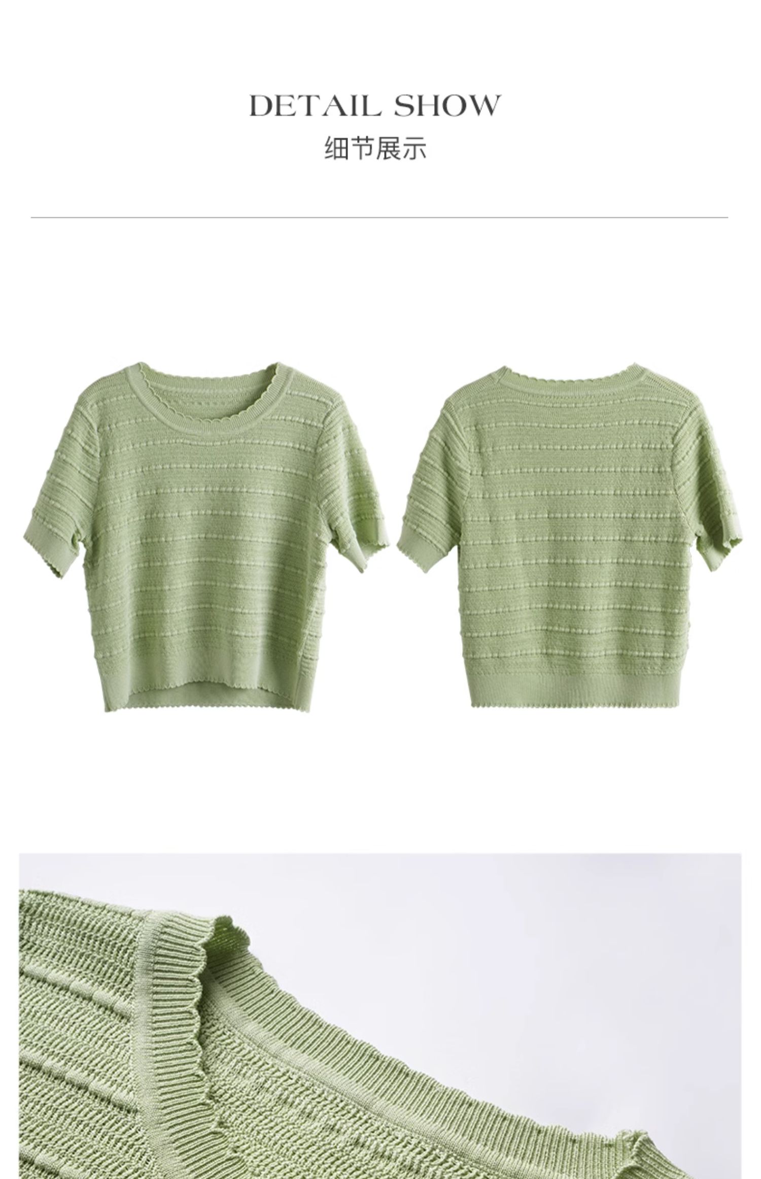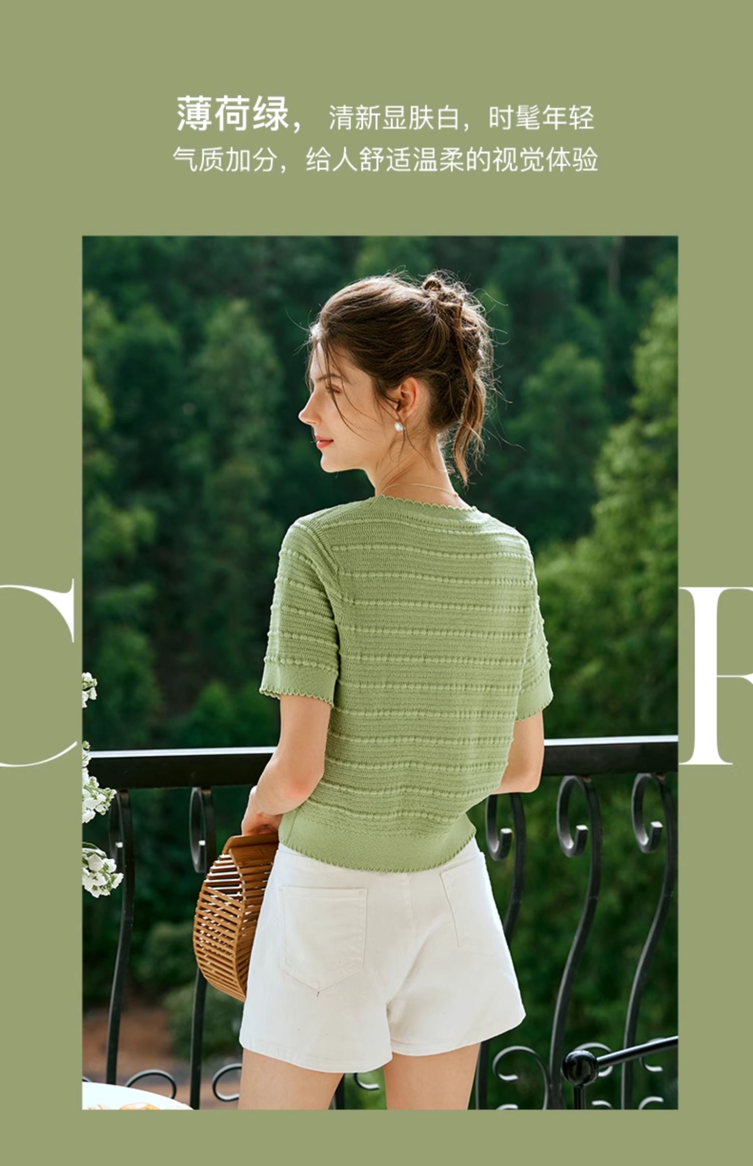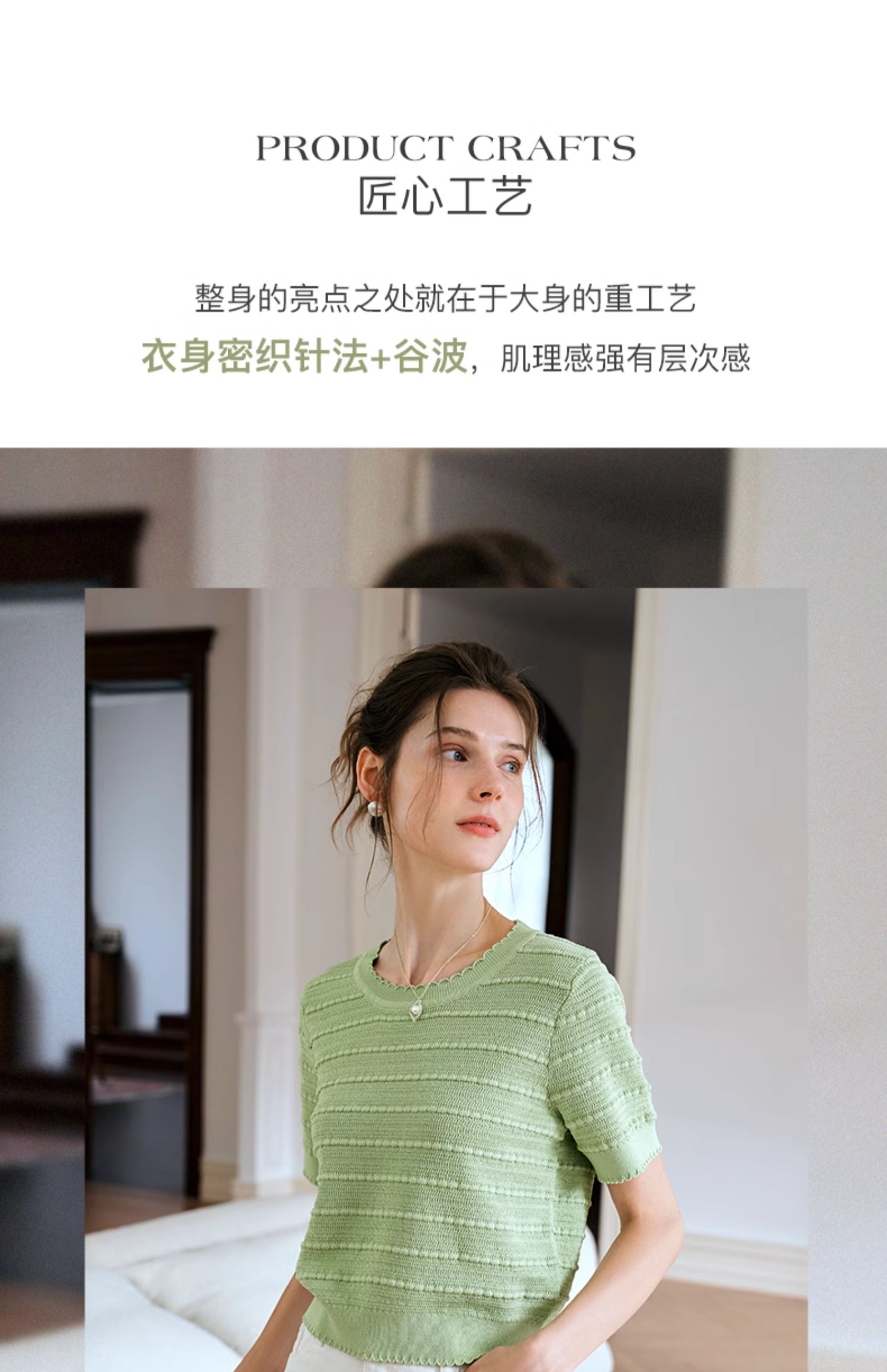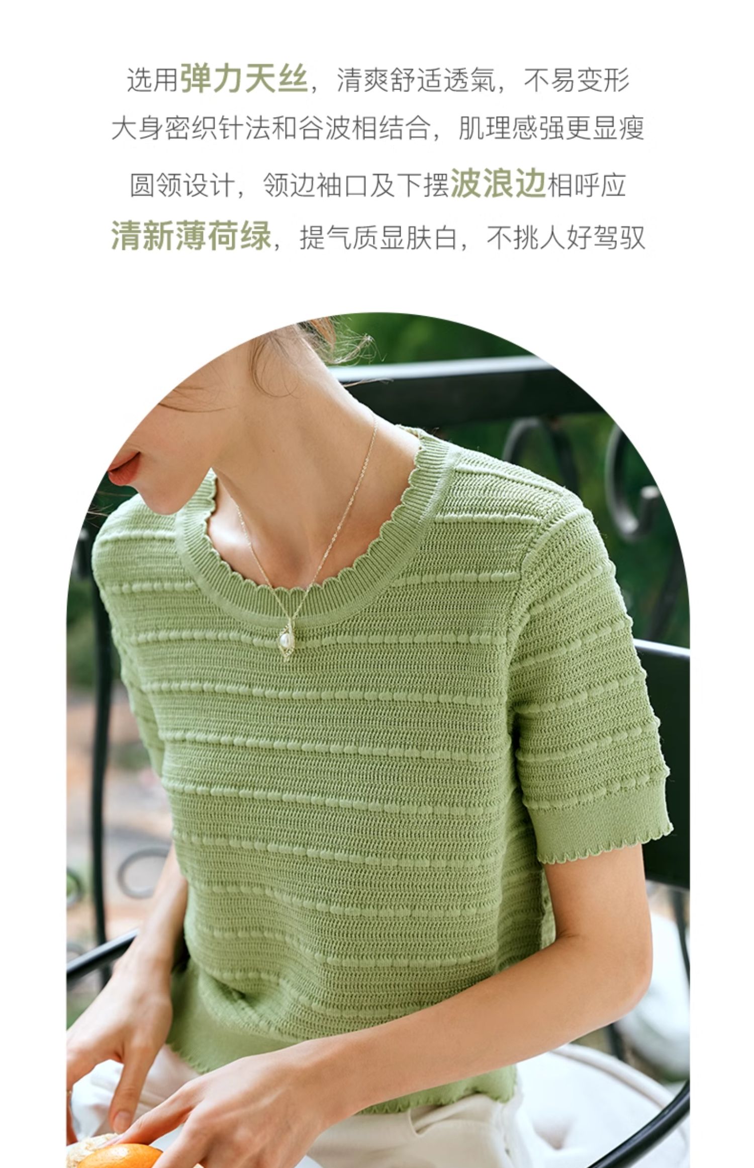 OLrain欧芮儿法式绿色针织衫女夏季2024年新款波浪边短袖套头上衣