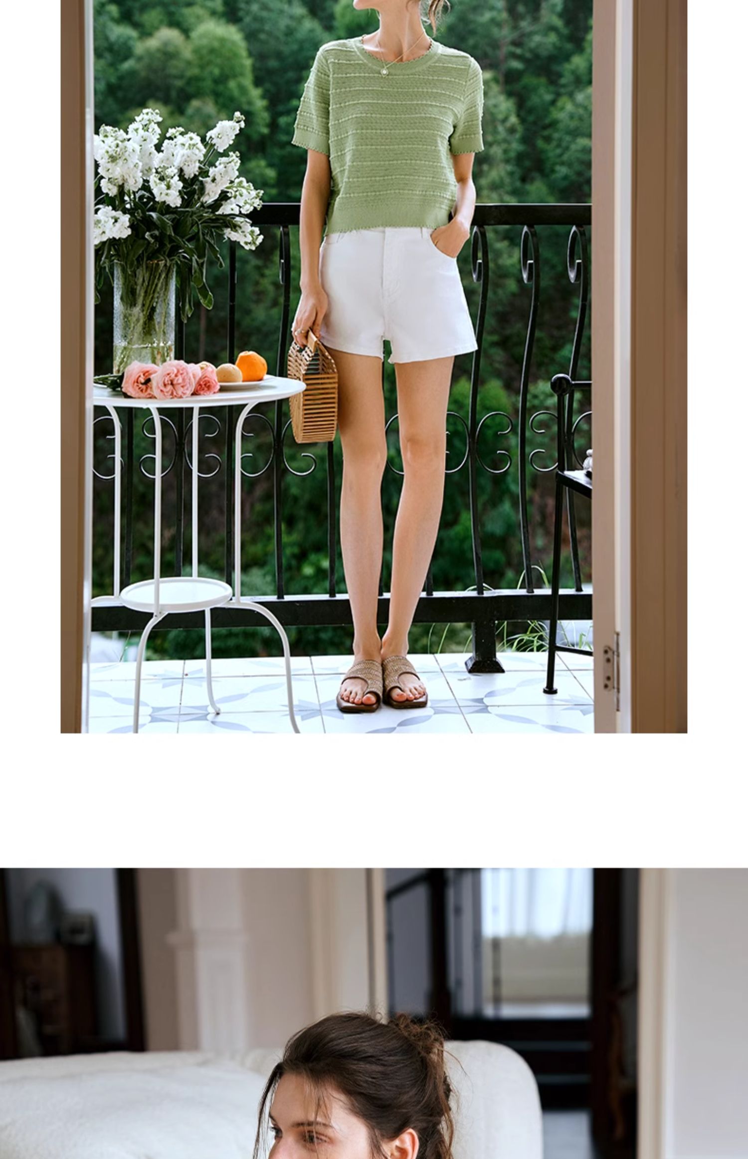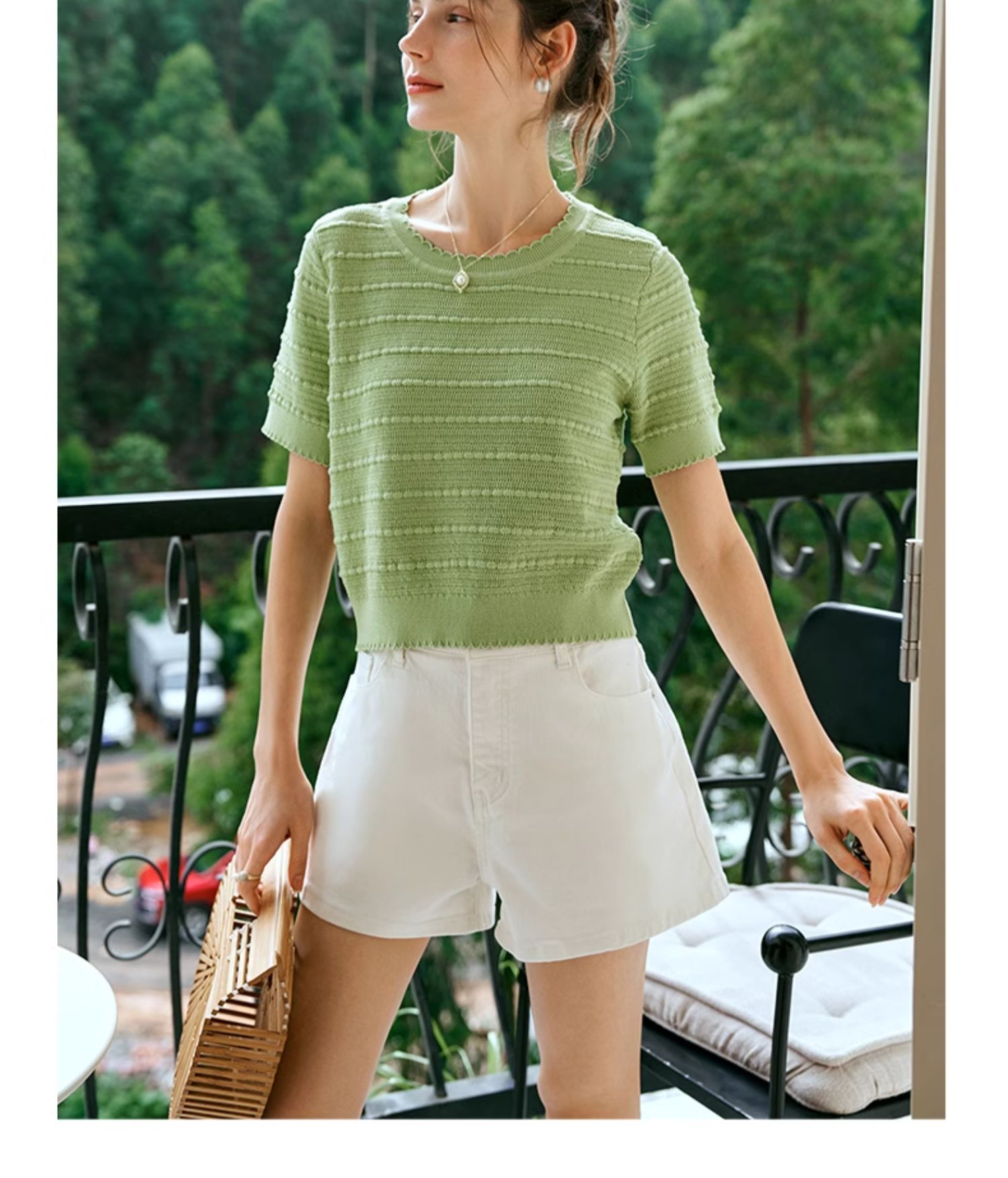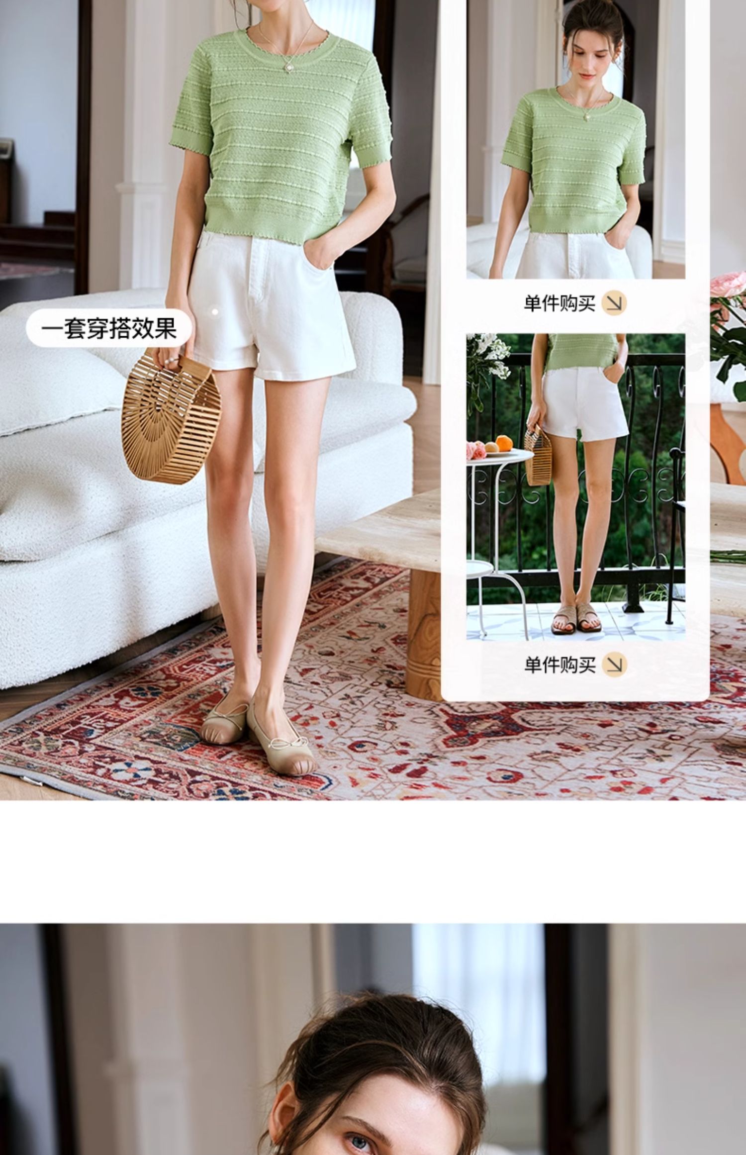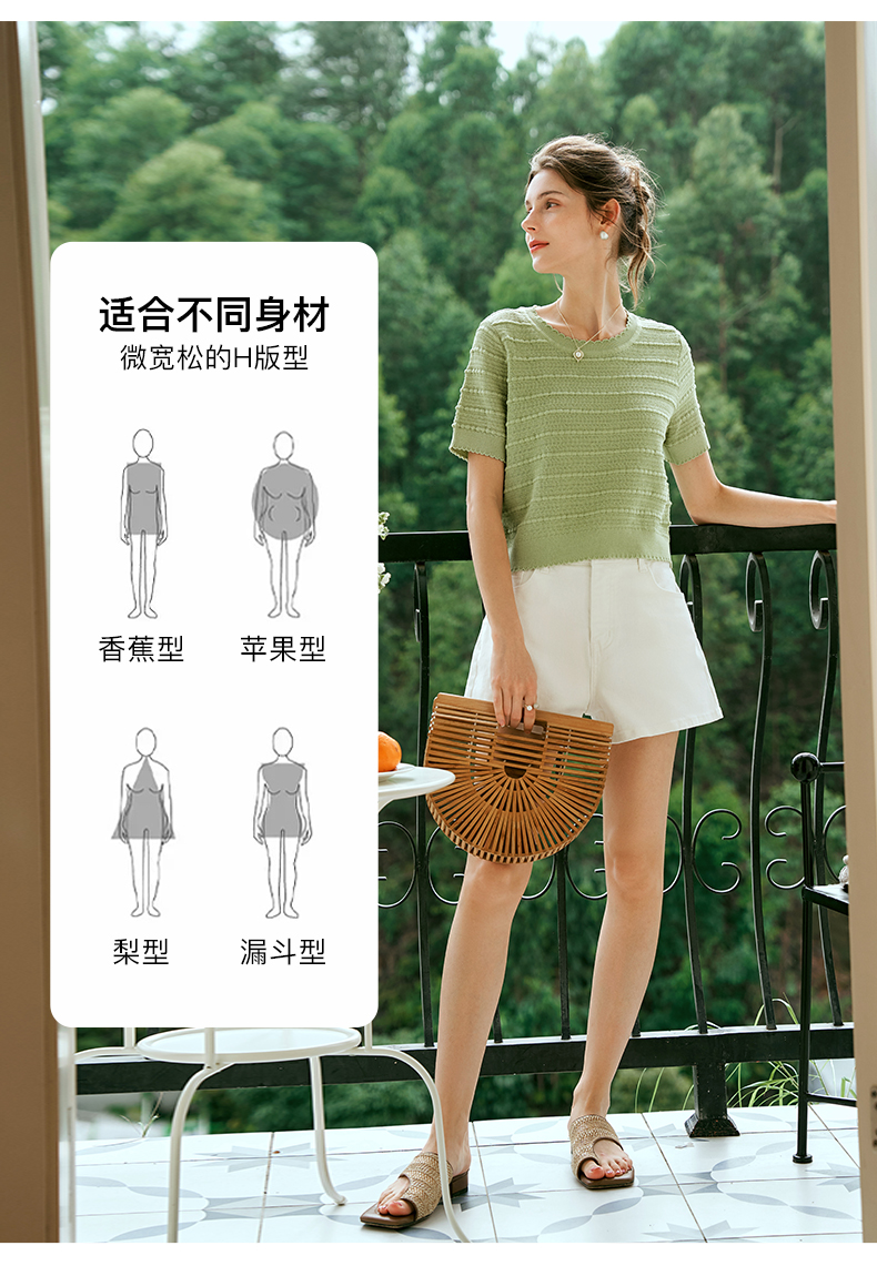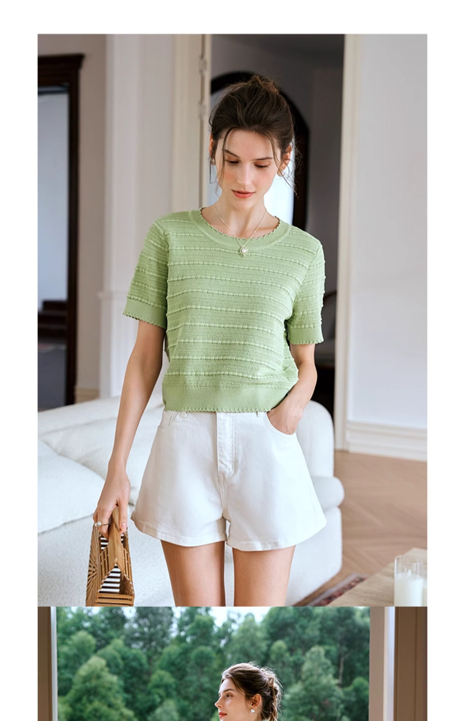 OLrain欧芮儿法式绿色针织衫女夏季2024年新款波浪边短袖套头上衣
