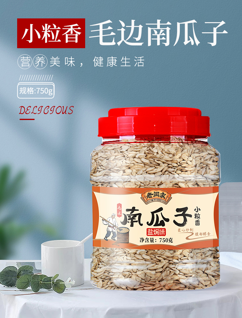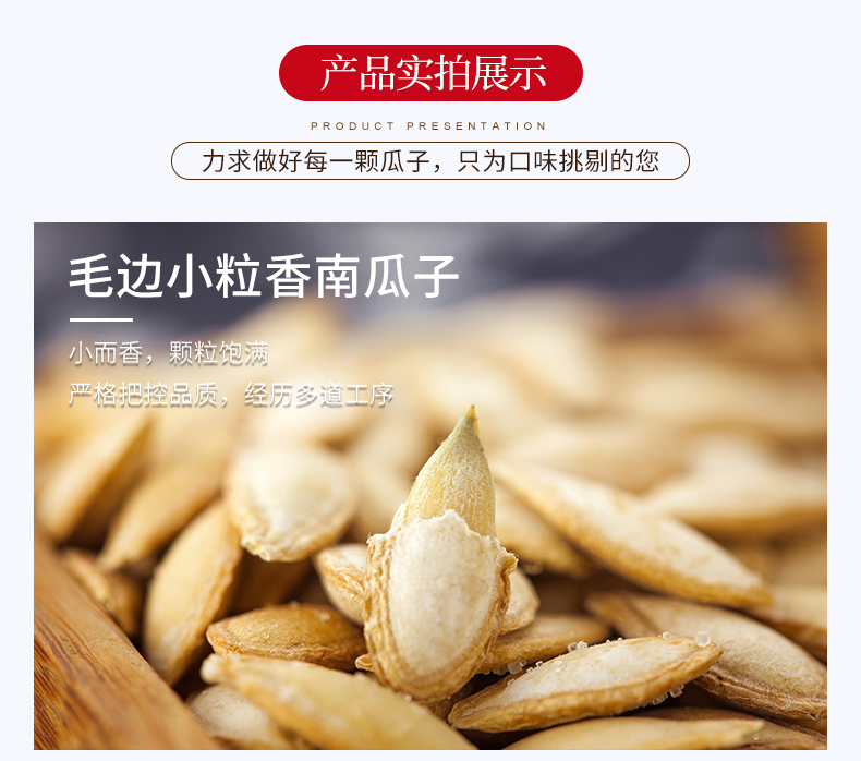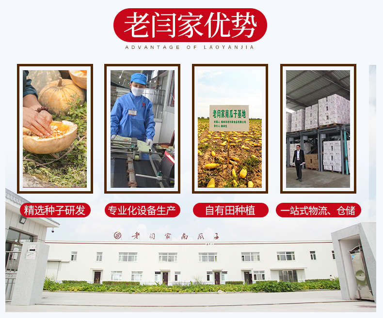 老闫家南瓜子三代人用心坚守每一颗南瓜子执行同一个标准,严选产区,15道工序,坚持古法炒制10次,层层质检严控,只为每一颗好南瓜子。