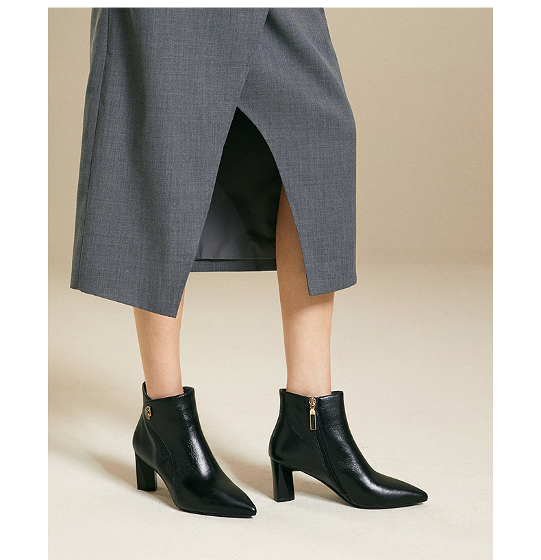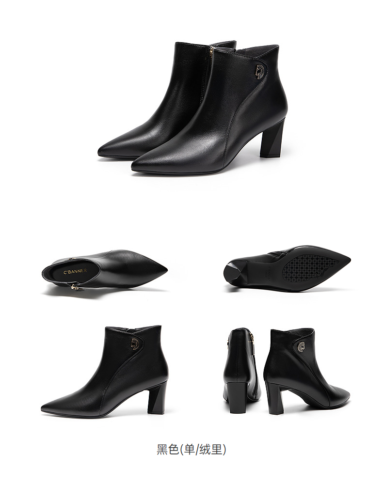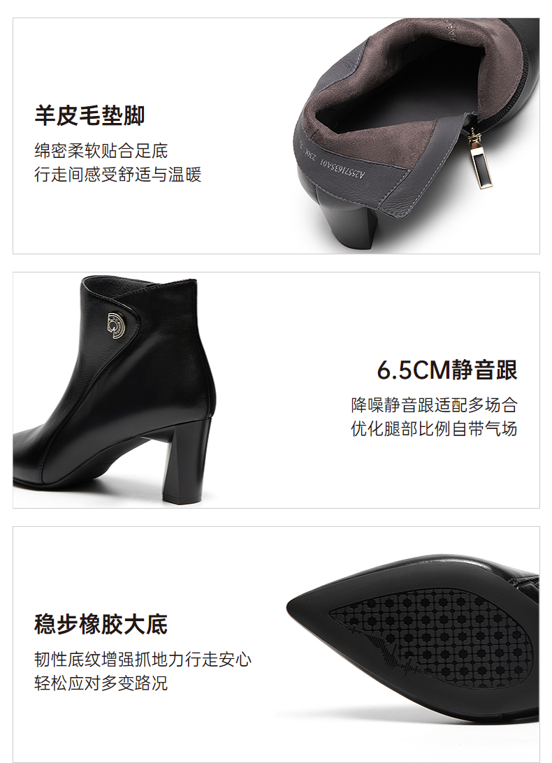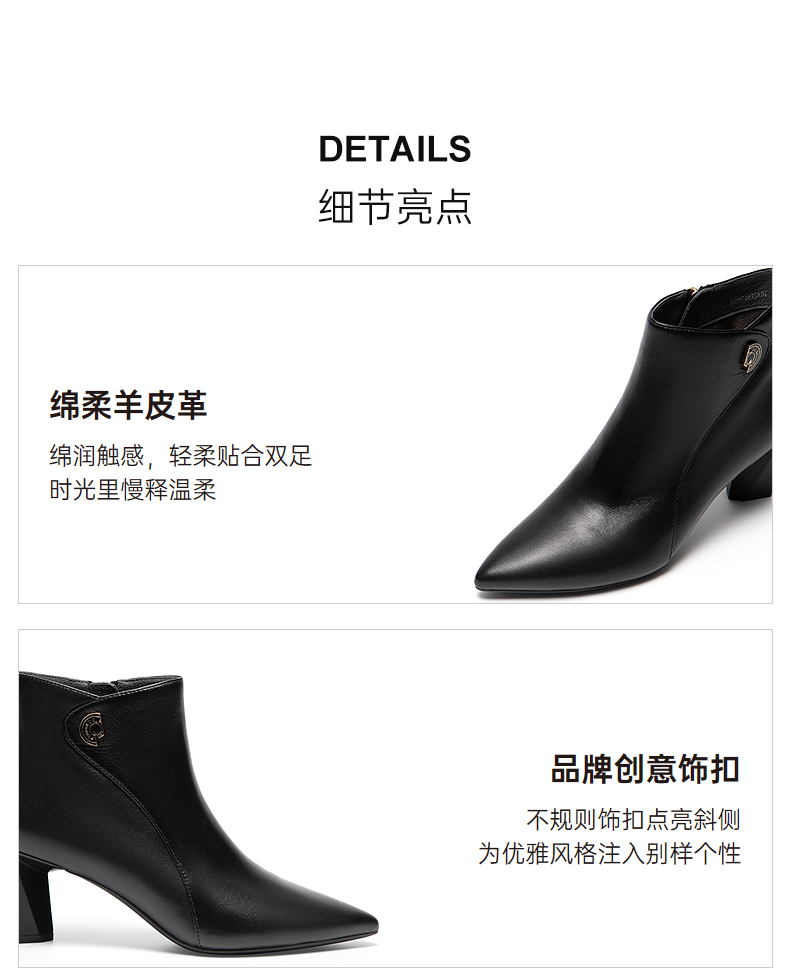 【静音系列】千百度粗高跟羊皮靴女尖头短靴时装靴A25571638