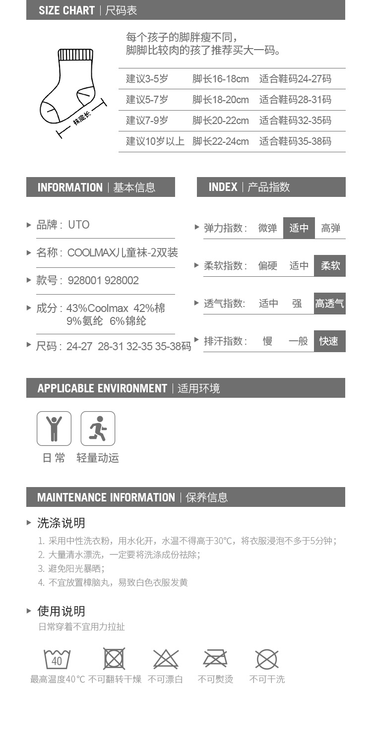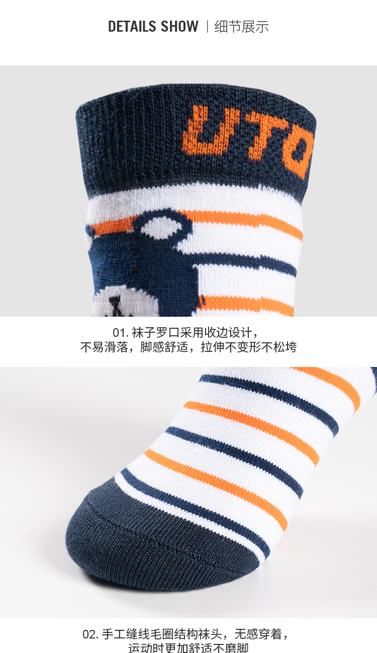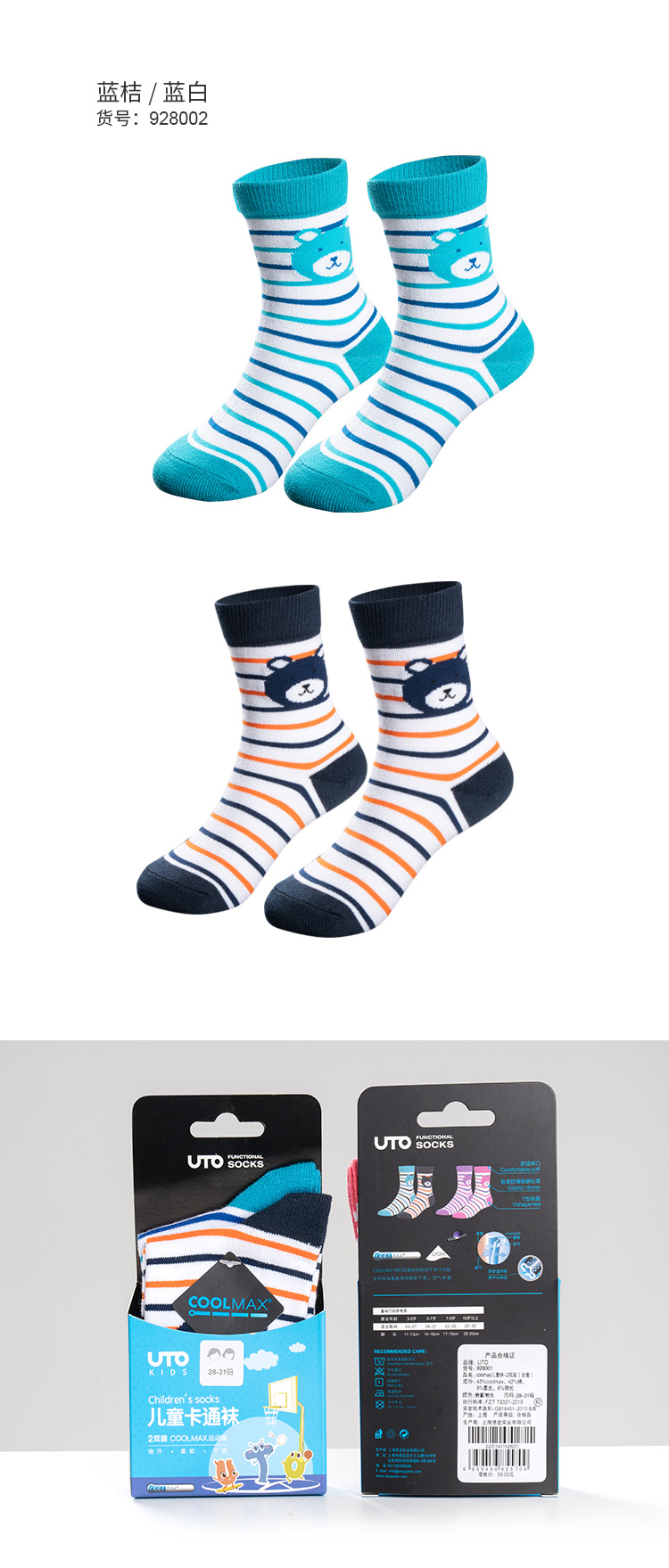 UTO/悠途儿童袜中帮运动袜男童排汗透气袜女童学校短袜【2双装】