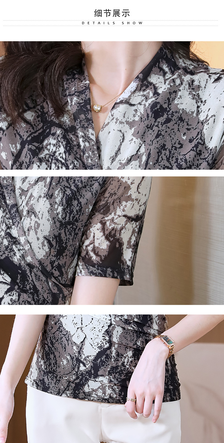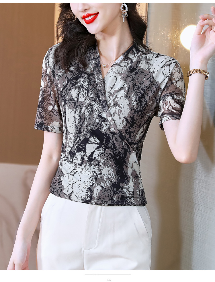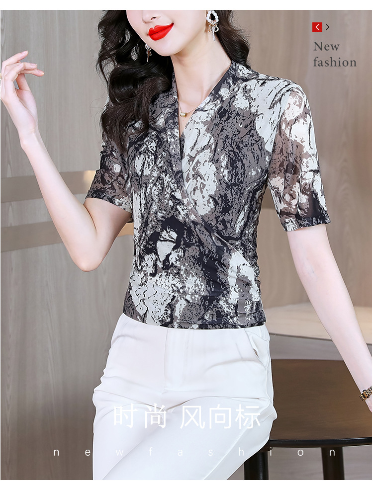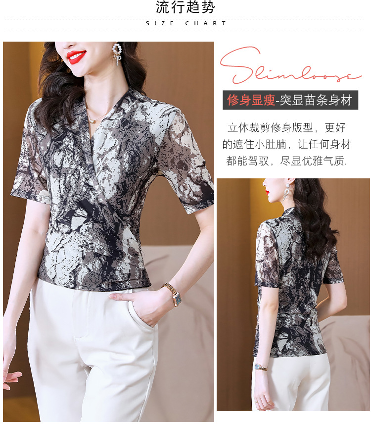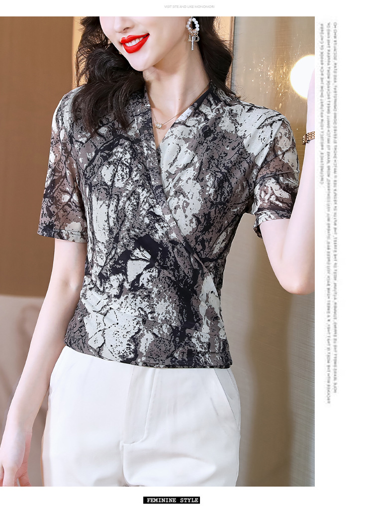 V领网纱打底衫上衣时尚印花交叉褶皱显瘦小衫KQL-460H2392