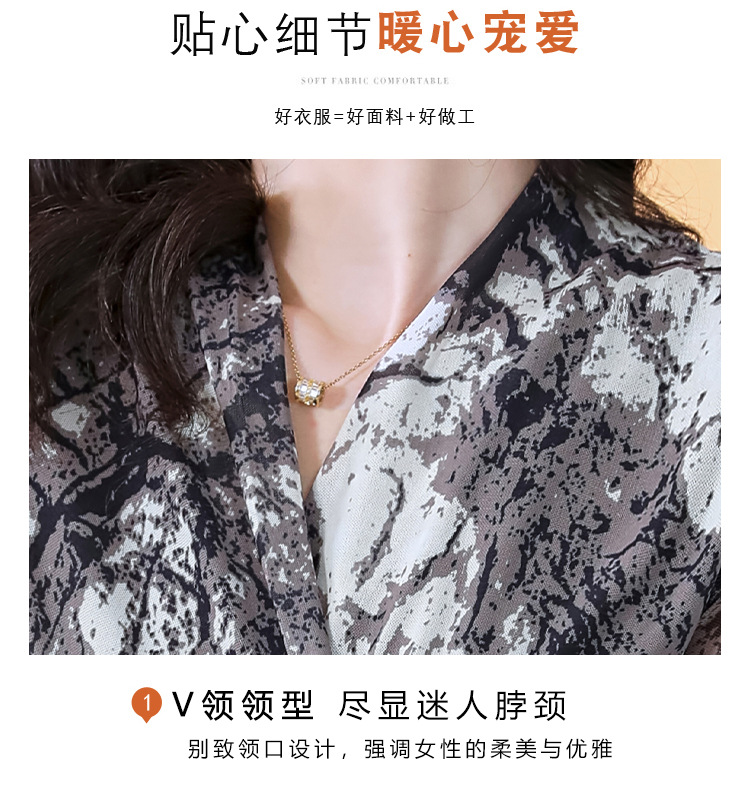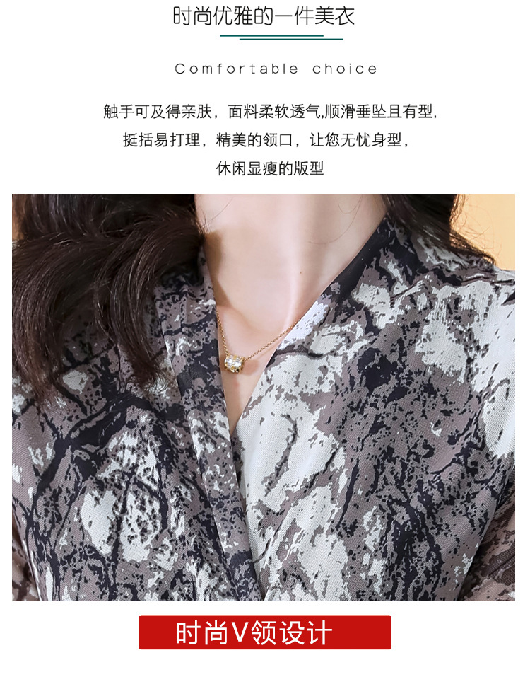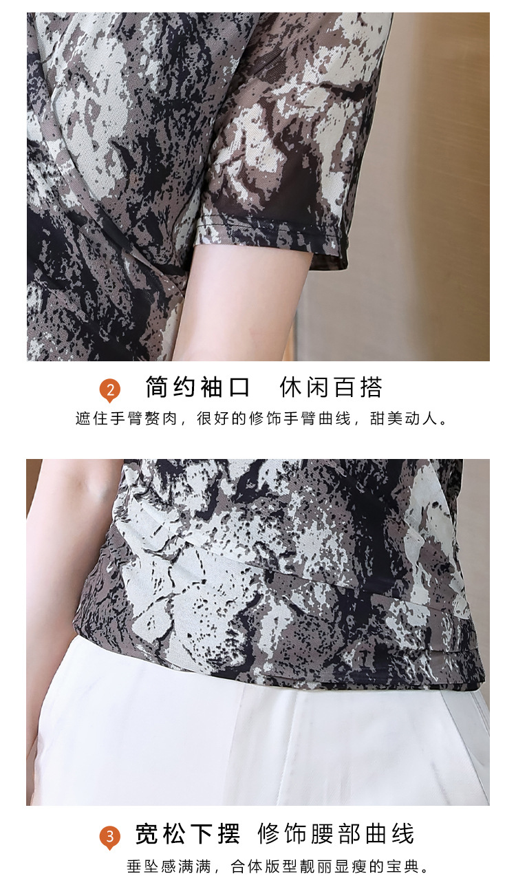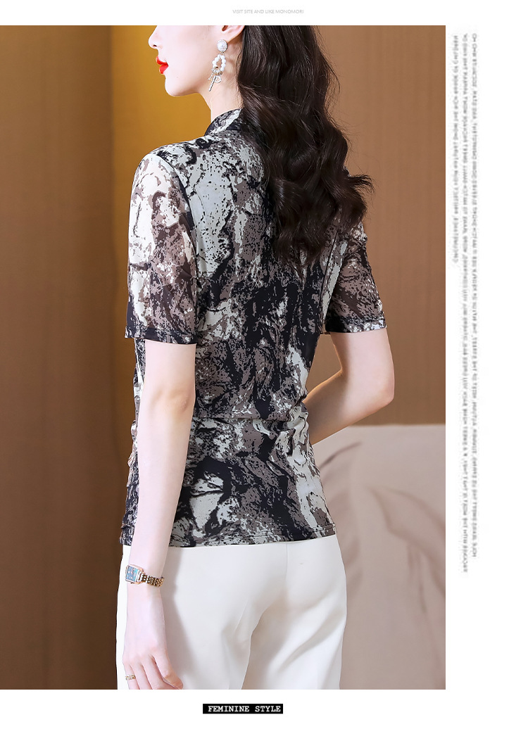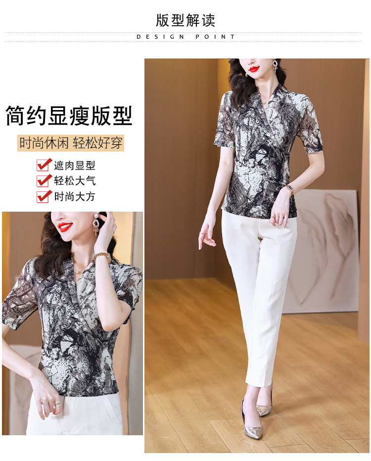 V领网纱打底衫上衣时尚印花交叉褶皱显瘦小衫KQL-460H2392