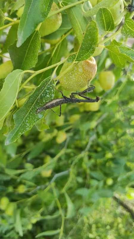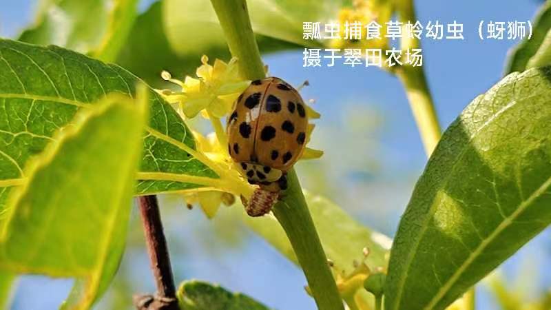 6.虫害: 多年坚持有机方式防治虫害,“天之道,损有余而补不足",天敌昆虫军团如:草蛉、瓢虫、蜘蛛、食虫虻、食蚜蝇、蚜茧蜂、步甲、蟌、各种土著蜂、赤眼蜂、小花蝽、猎蝽、螳螂等来农场繁衍生息,这是虫害防治的良好生态基础。枣粉蚧,蓟马等虫害在天敌昆虫军团围歼下,虫害整体比较可控。