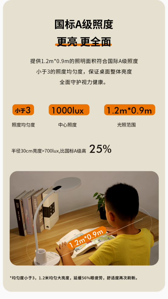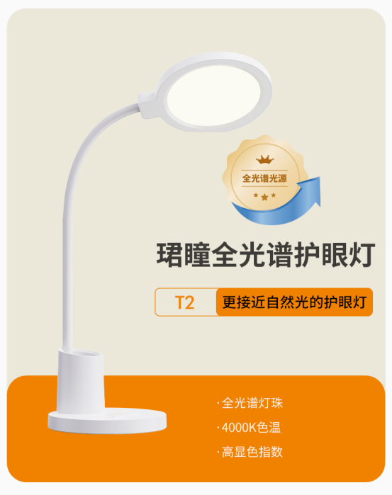 优童·珺瞳T2护眼台灯 拥有国AA级照度!外加14cm大直径! 照明更广阔,光线更柔和 像个小太阳一样,把桌面照得清清楚楚无死角! 大面积的自然光让眼睛更舒适! 就算是长时间的阅读、写字,也不会觉得眼疲劳!