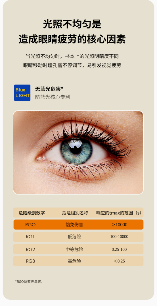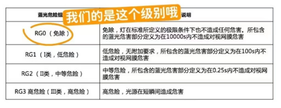 我们都知道,有害蓝光具有极高的能量, 能够穿透晶状体直达视网膜, 引起视网膜色素上皮细胞的萎缩甚至死亡, 从而导致视力下降!严重的损坏眼睛! 国际电工技术委员会(IEC) 制定的IEC62471对光源产品蓝光危害进行了安全级别分类↓