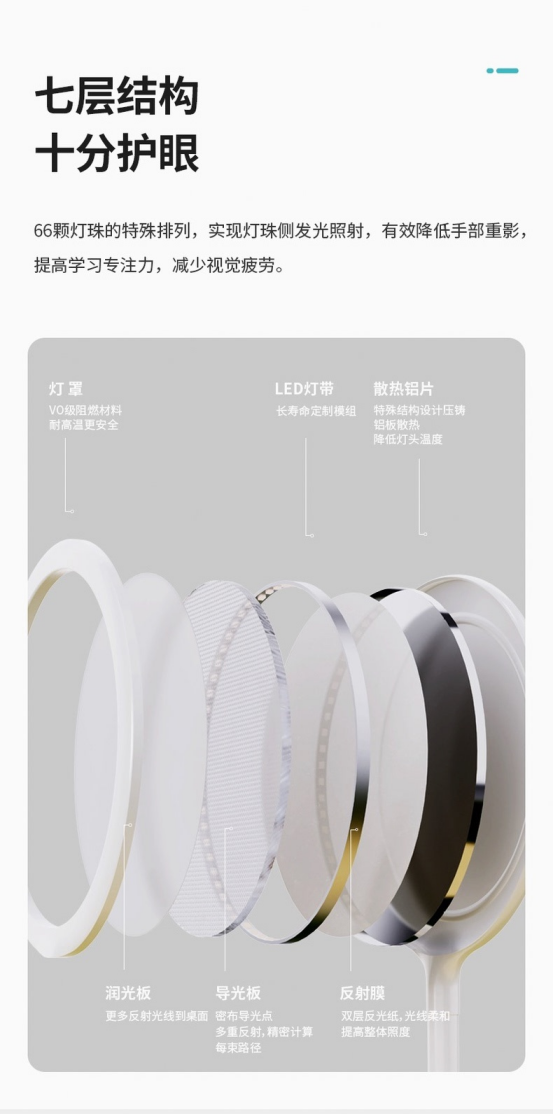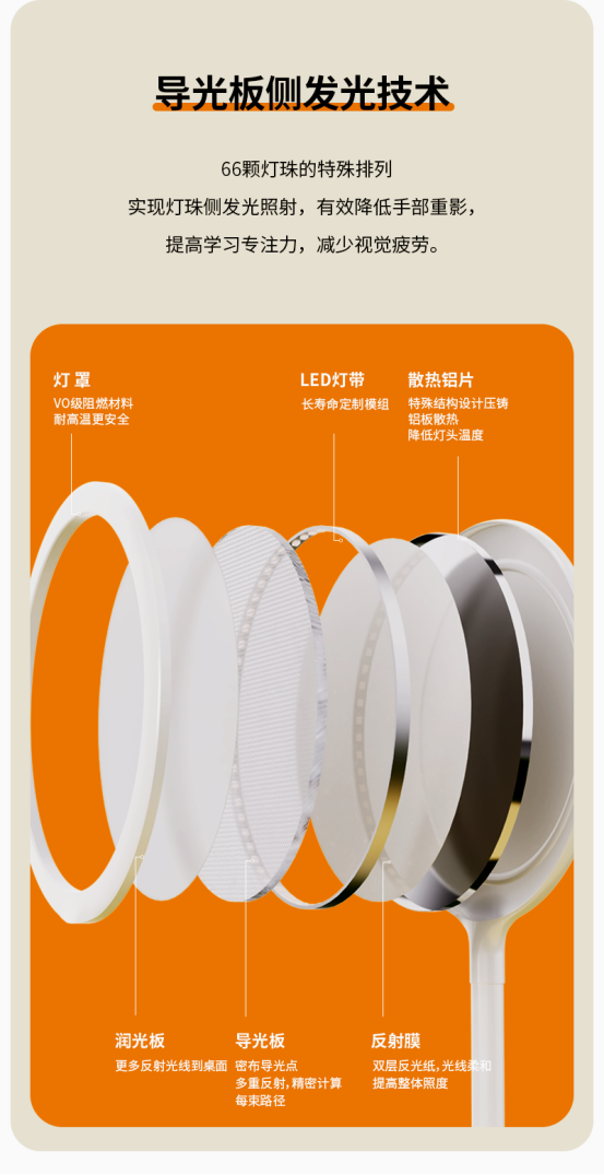 灯罩VO级阻燃材料耐高温更安全 LED灯带散热铝片长寿命定制模组,特殊结构设计压铸铝板散热降低灯头温度 更多反射光线到桌面 密布导光点多重反射,精密计算每束路径 双层反光纸,光线美提高整体照度
