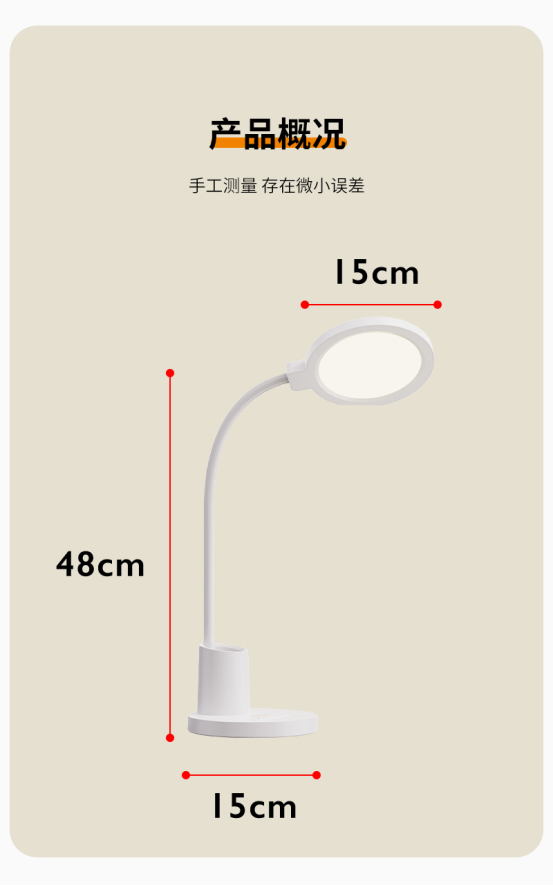硅胶软管设计,可实现360°任意角度调节 防滑地盘设计,稳固不易倾倒~ 采用了纳米润光技术, 66颗LED灯珠均匀附在面板上 面光源侧发光技术 可直视不刺眼