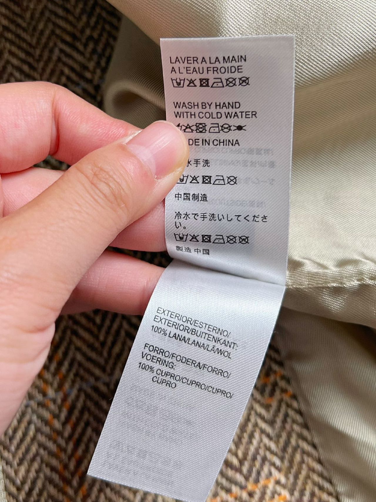 . 大衣下摆内侧以及左袖口外侧都有手工缝制的方标,这是哈里斯面料的标志,多方位展现尊贵身份!