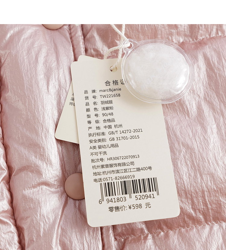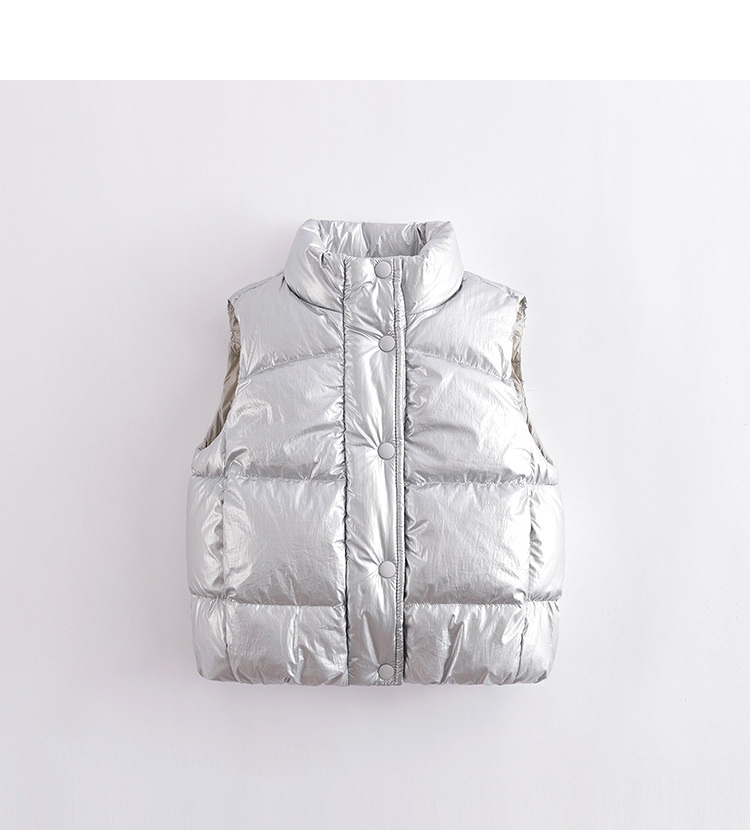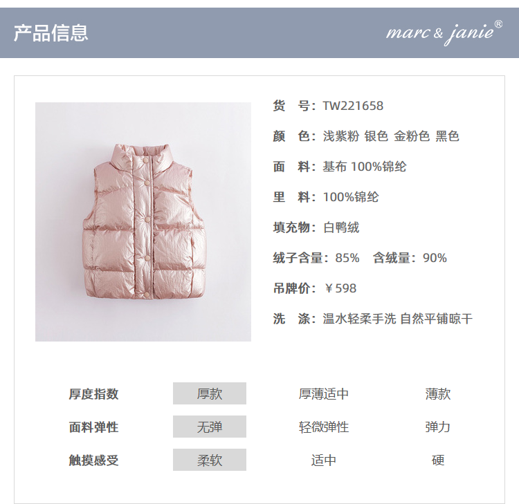 马克珍妮秋冬新款 女童金属色立领超轻保暖羽绒马甲221658