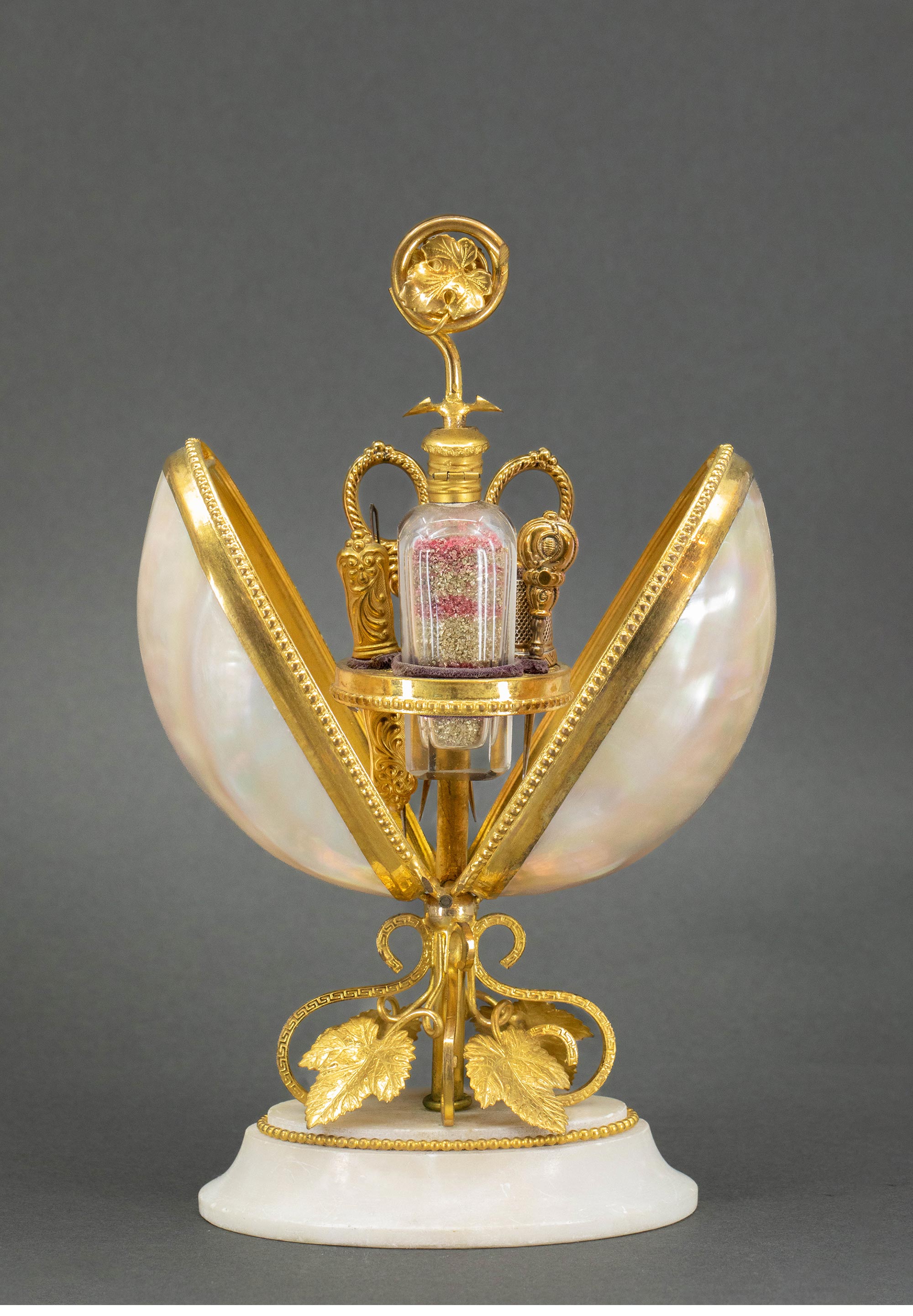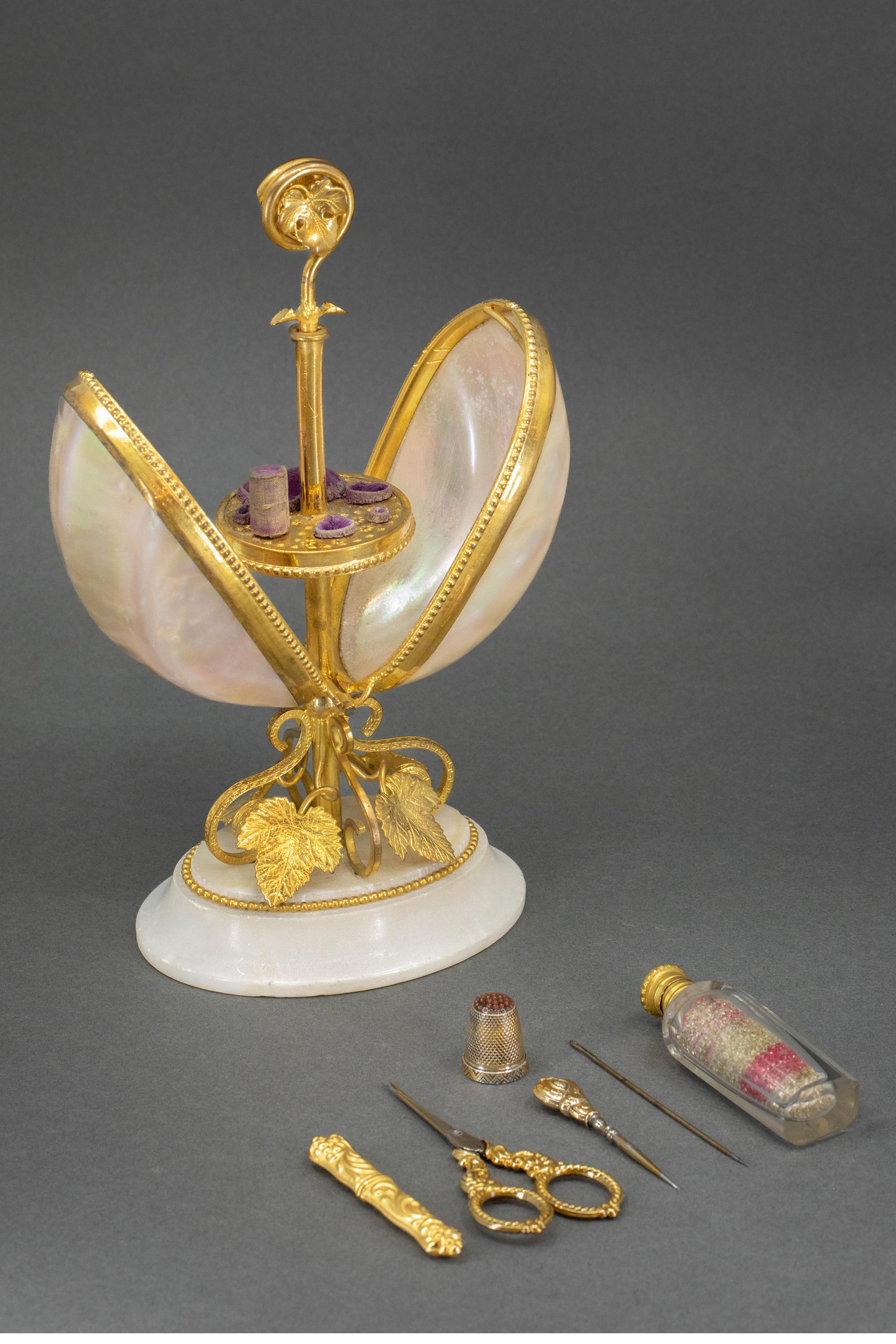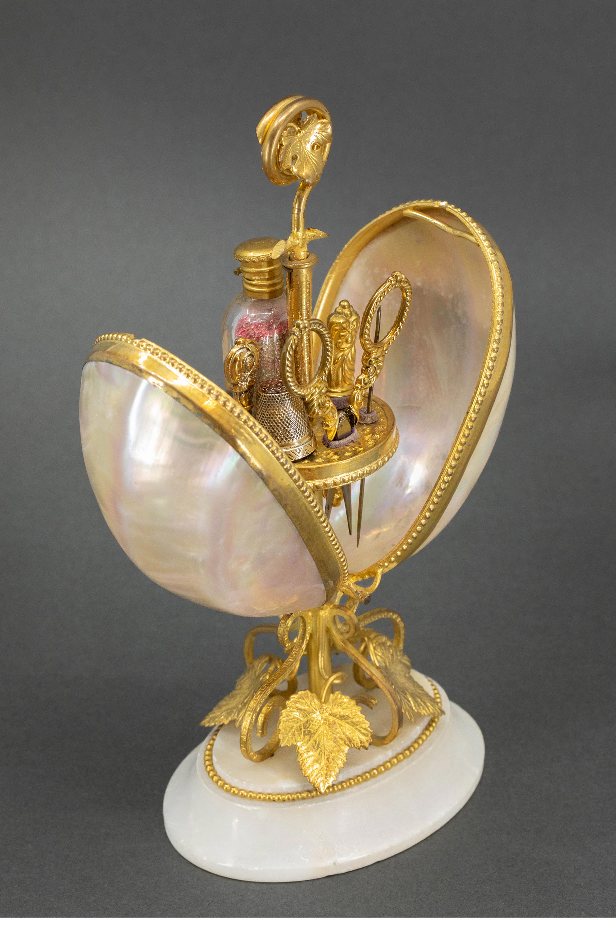 19世纪法国出品雪花大理石底座铜鎏金精雕叶纹装饰蛋形母贝外壳缝纫套件