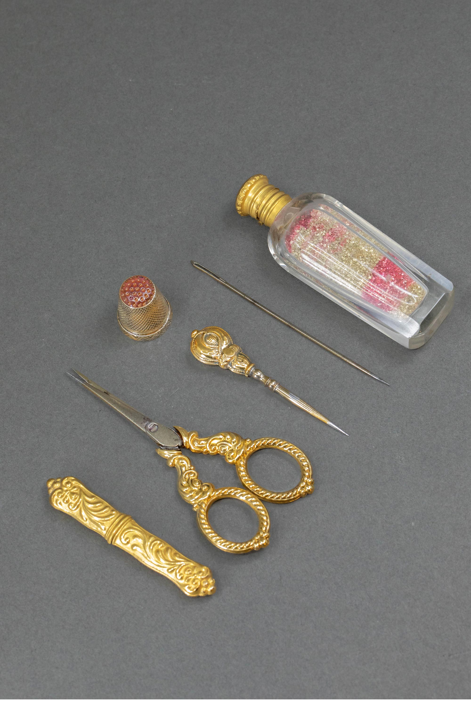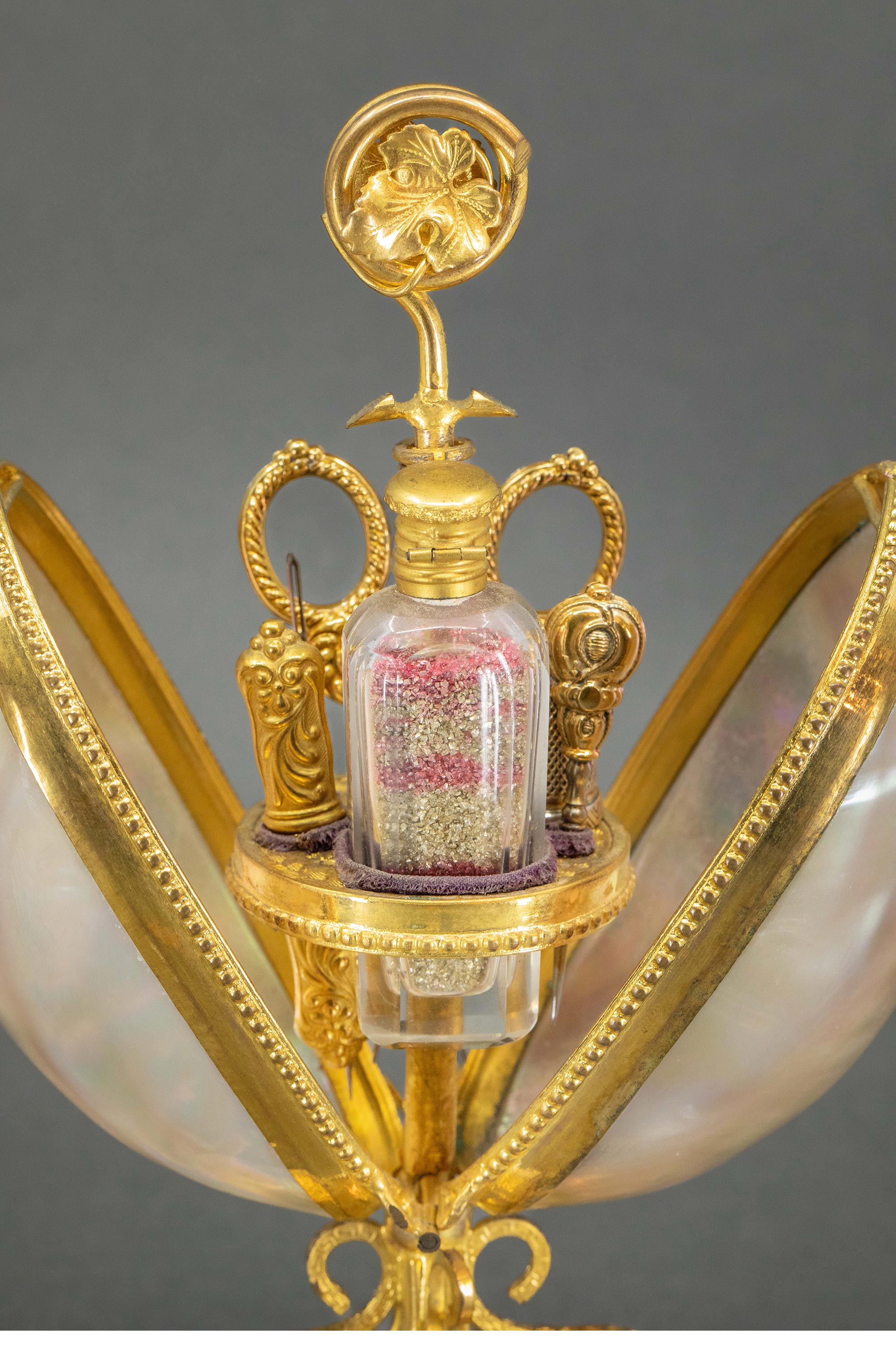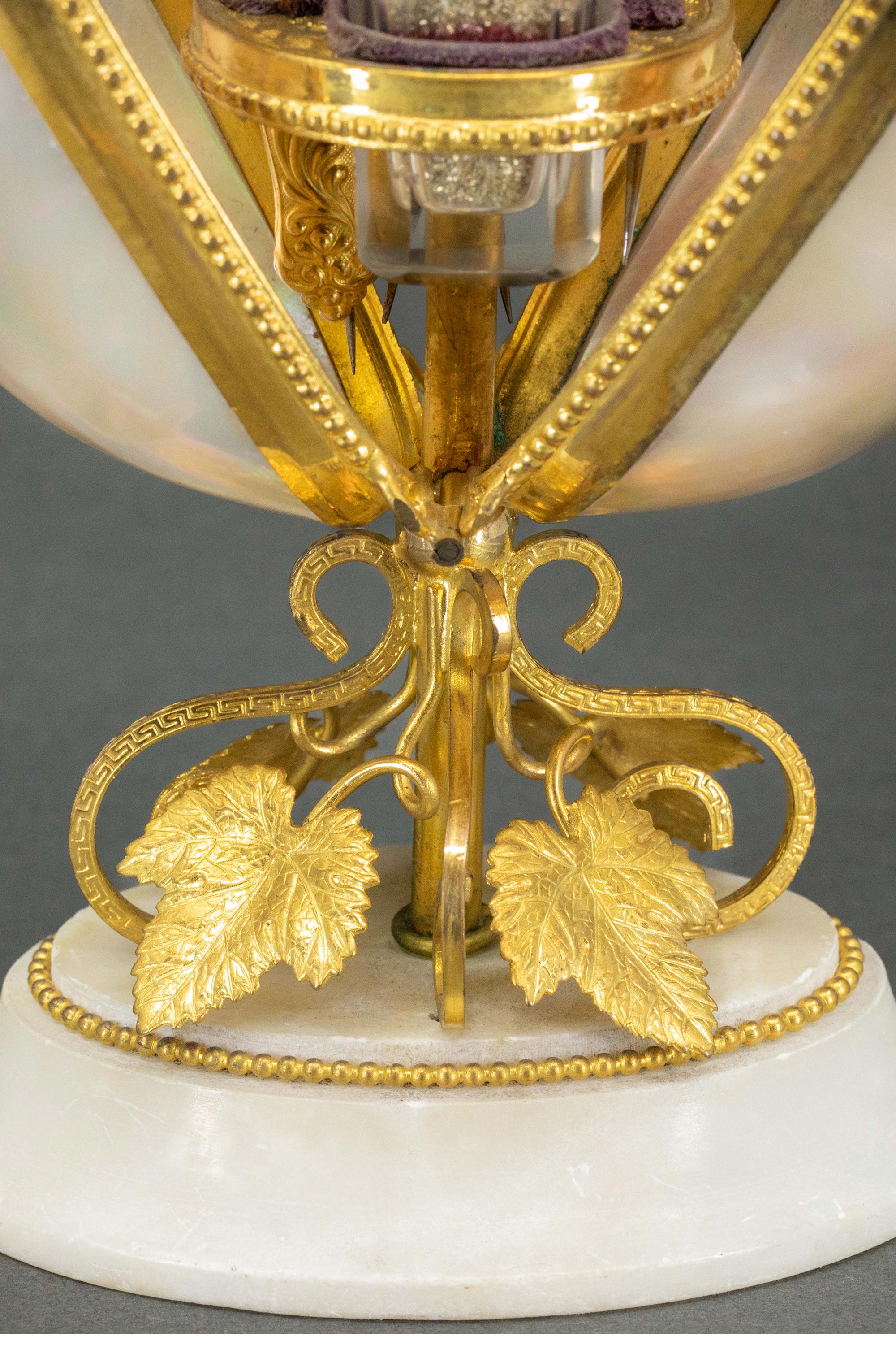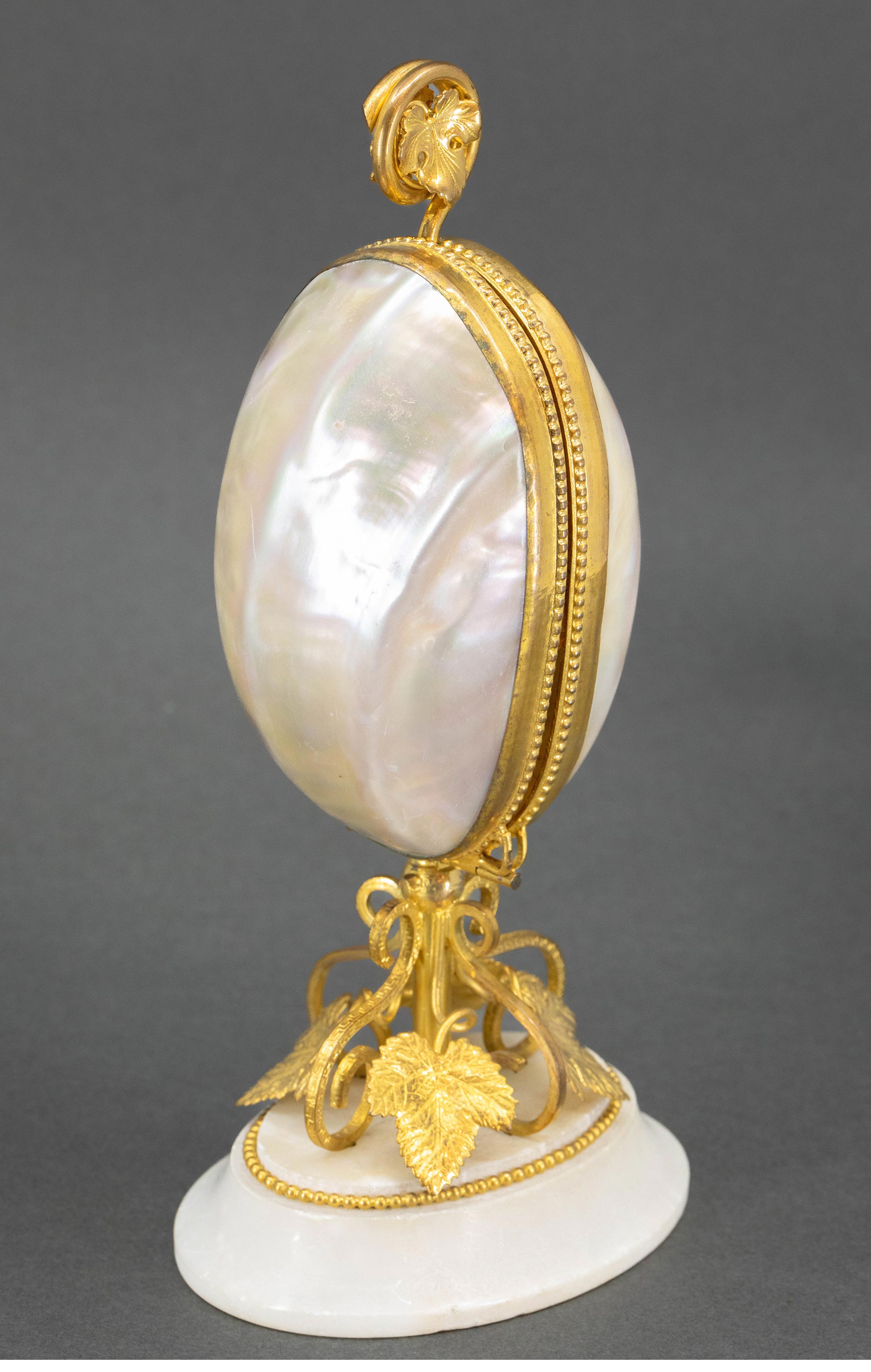 19世纪法国出品雪花大理石底座铜鎏金精雕叶纹装饰蛋形母贝外壳缝纫套件