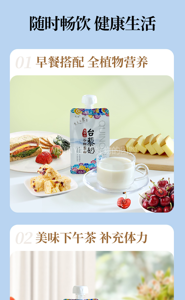 原料选用联合国粮农组织推荐的全营养食物藜麦,辅以中国人传统营养食物大豆、世界公认健康食物燕麦,按黄金比例匠心精制。