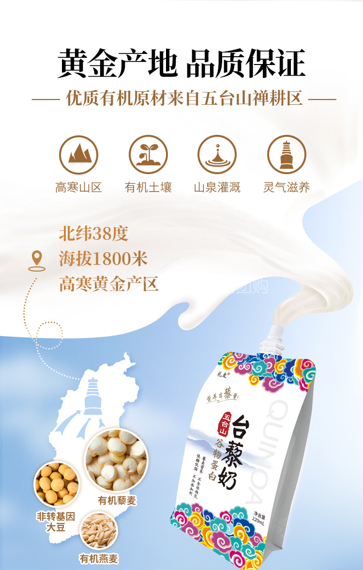 只选用当季种植的新鲜优级食材为原料,藜麦、大豆(黄豆)、燕麦, 均来自无污染的五台山大山深处。