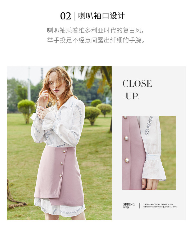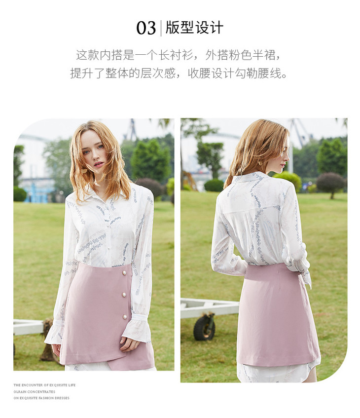 欧芮儿时尚套装女中长款印花衬衫加粉色不规则半身裙新款