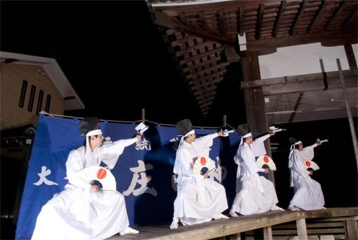 该祭典舞蹈已有 200 年以上的历史。据信这是从 1778 年开始,由当地神社祭司献给神明的舞蹈。表演者来自 12 个神乐团体,学童也会参与其中。