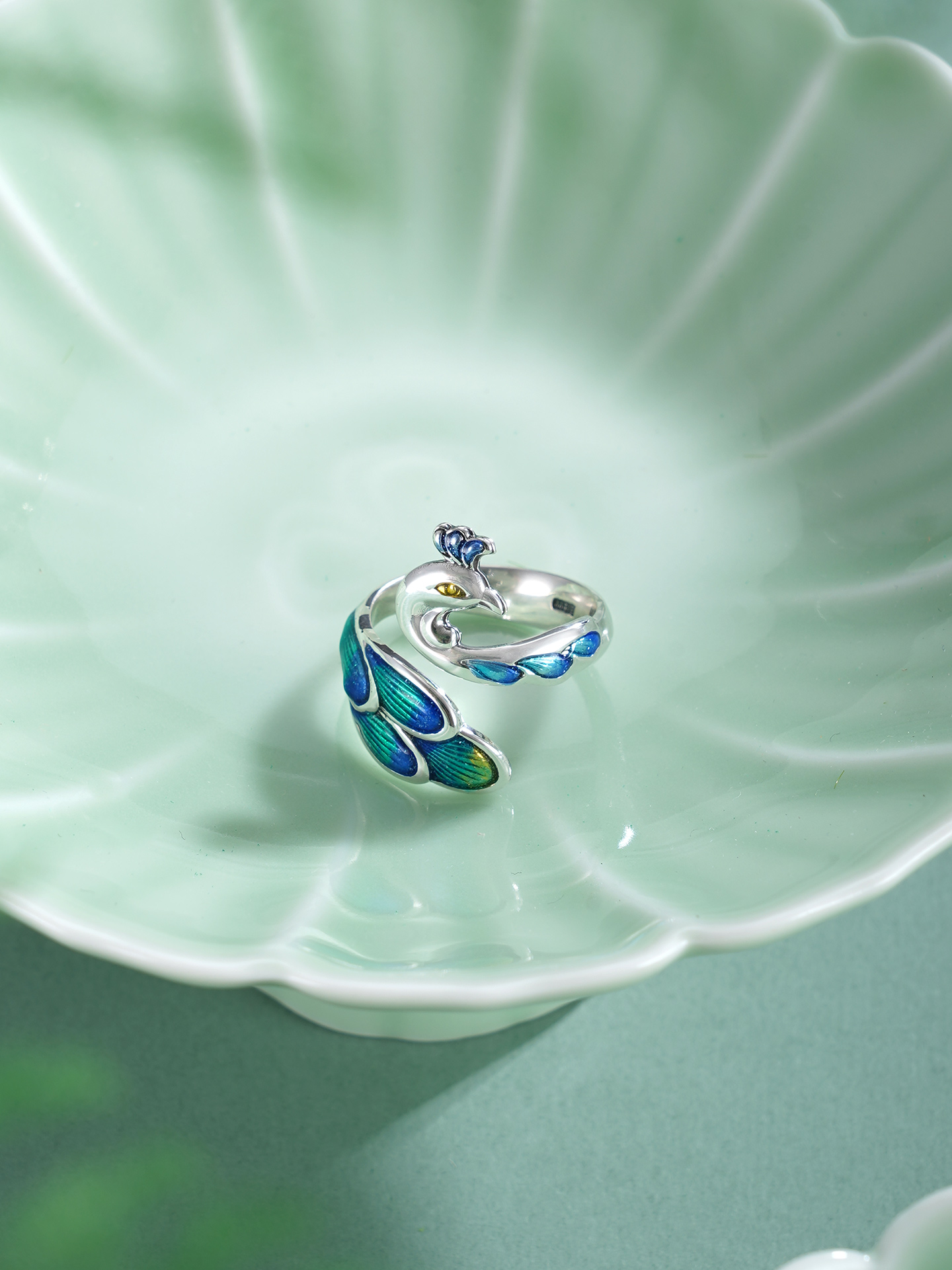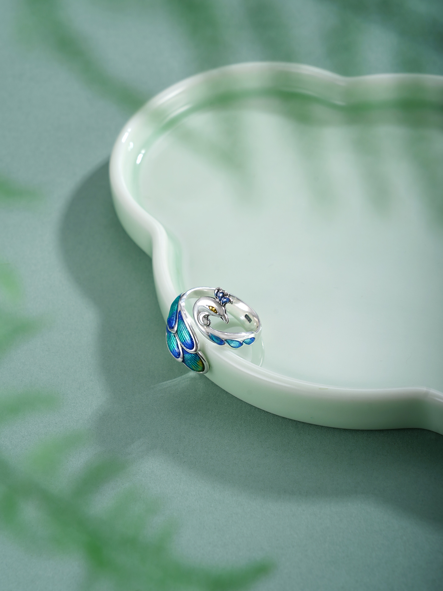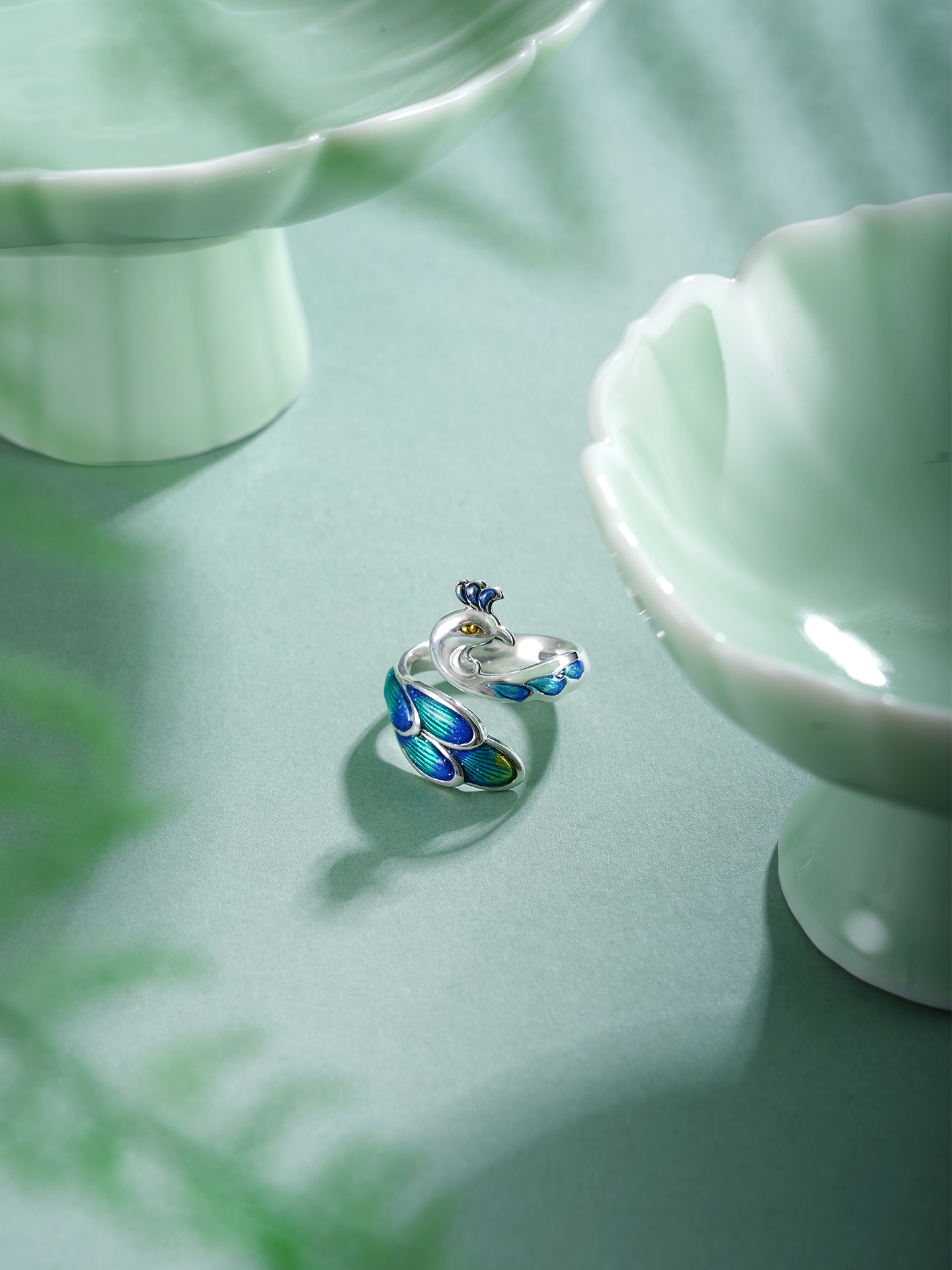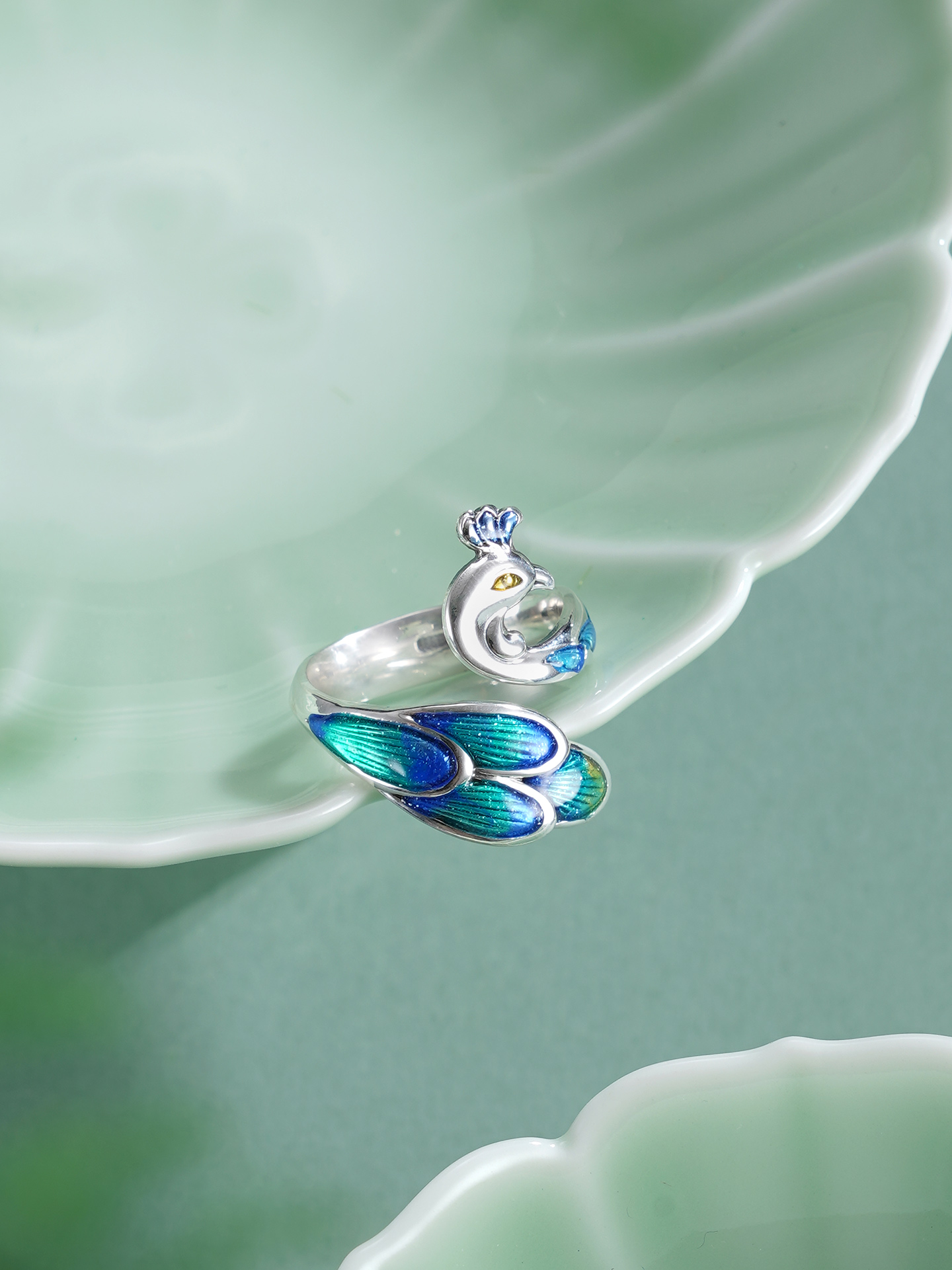 【寓意】:灵韵随风起,翠屏展翅归。戒指以孔雀为灵感设计,通过珐琅彩点染烧制,层次分明,神韵毕现。寓意孔雀开屏,吉祥降临。