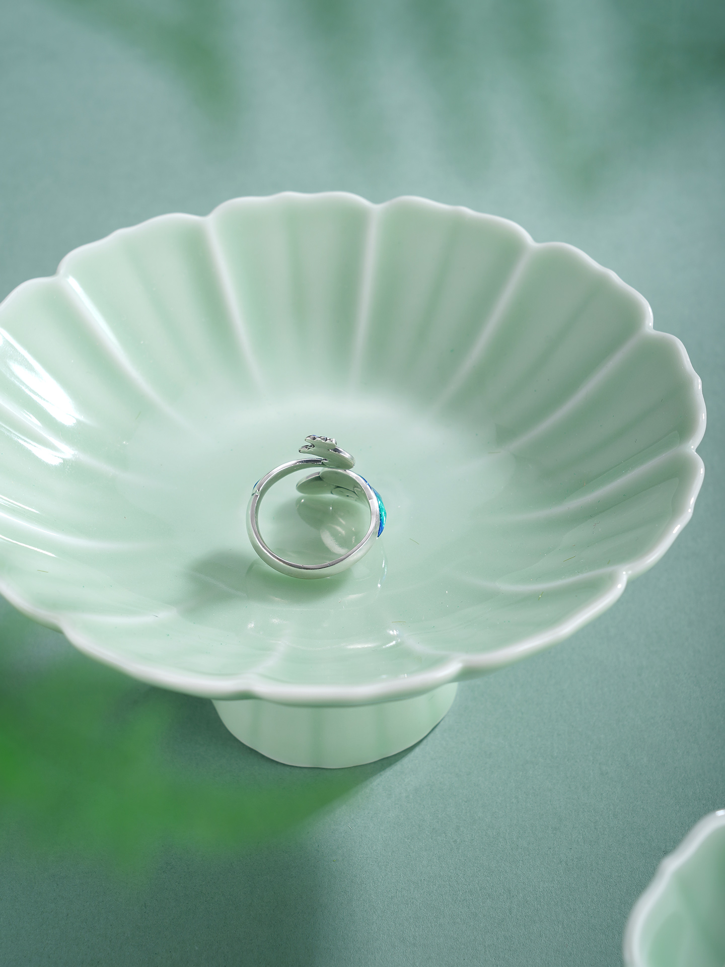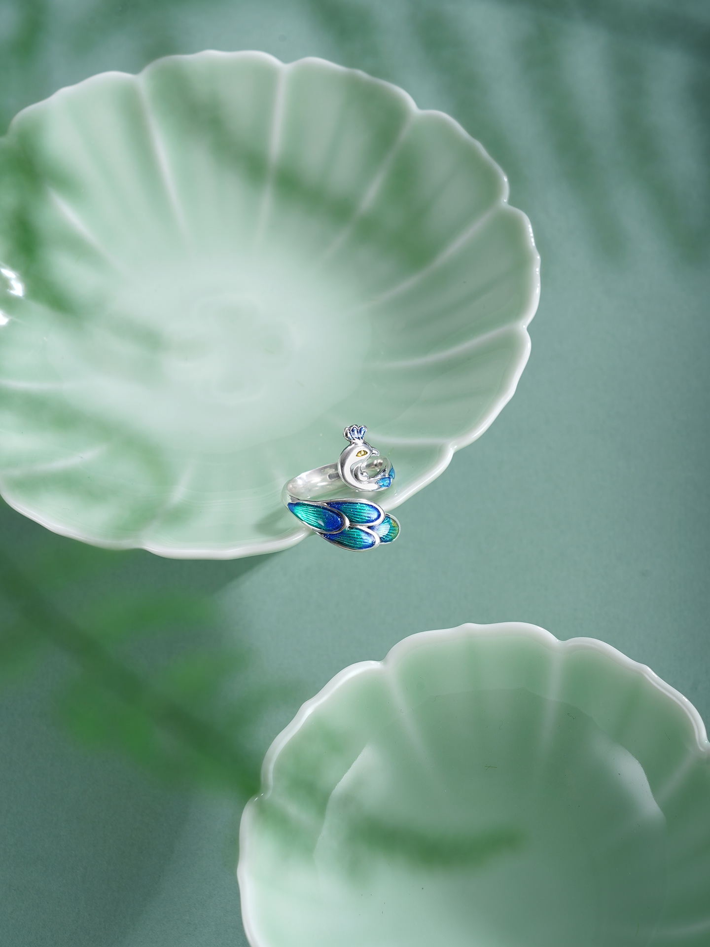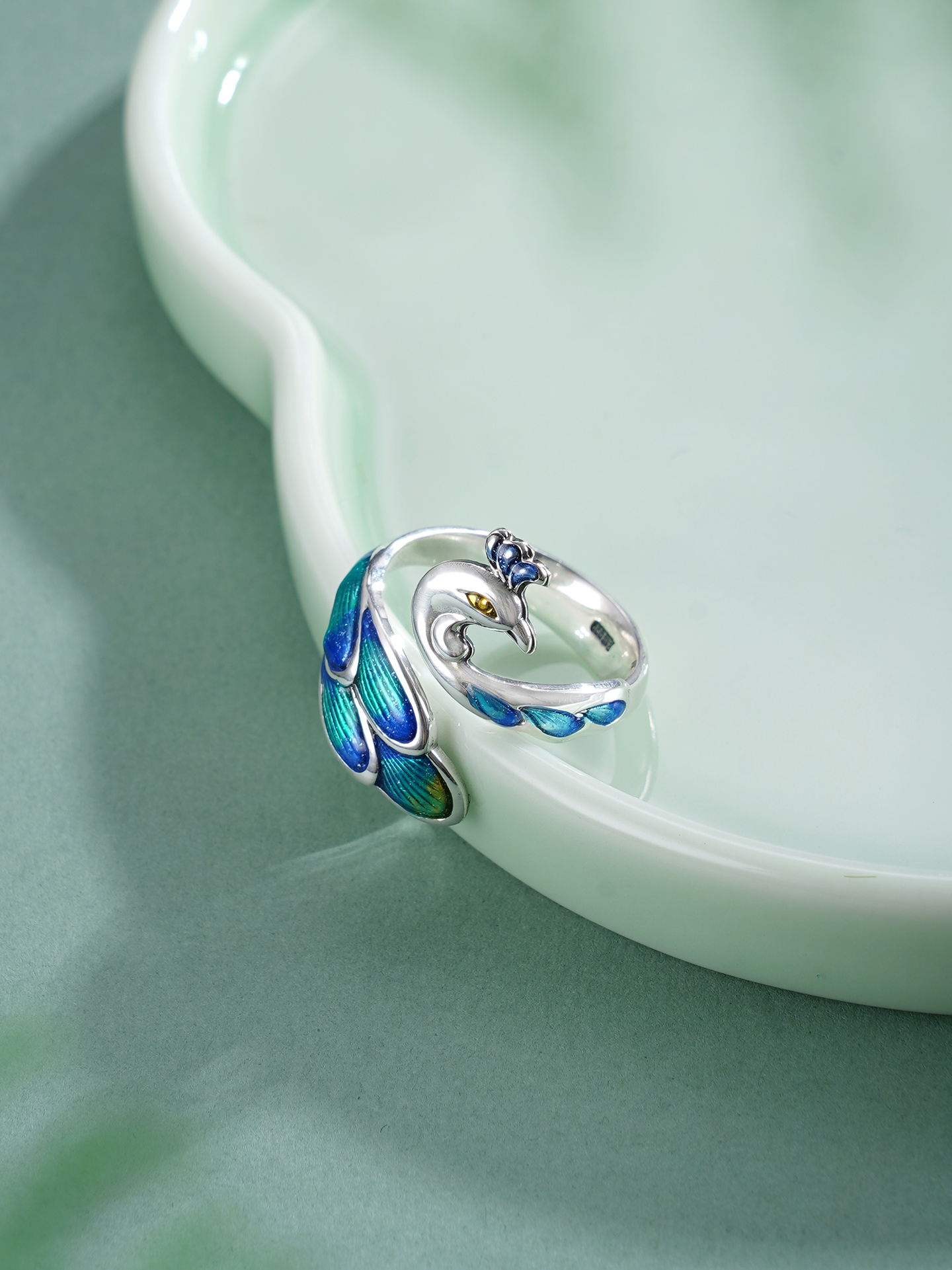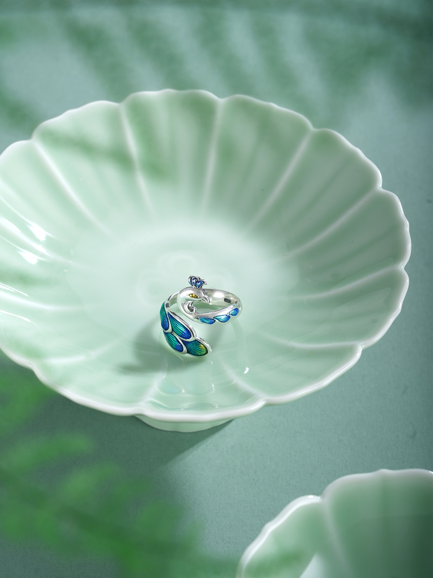【寓意】:灵韵随风起,翠屏展翅归。戒指以孔雀为灵感设计,通过珐琅彩点染烧制,层次分明,神韵毕现。寓意孔雀开屏,吉祥降临。