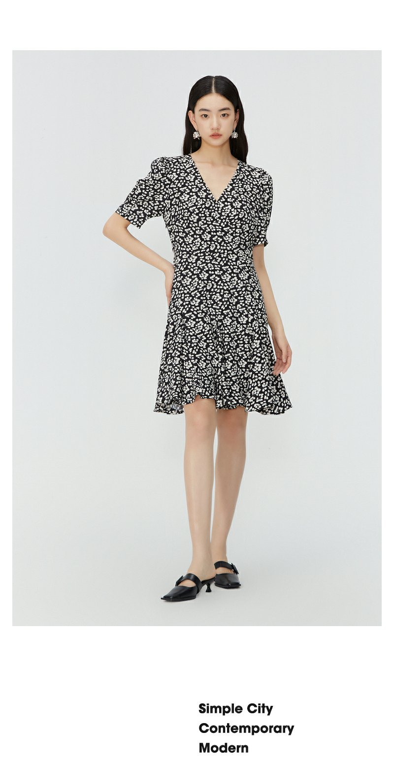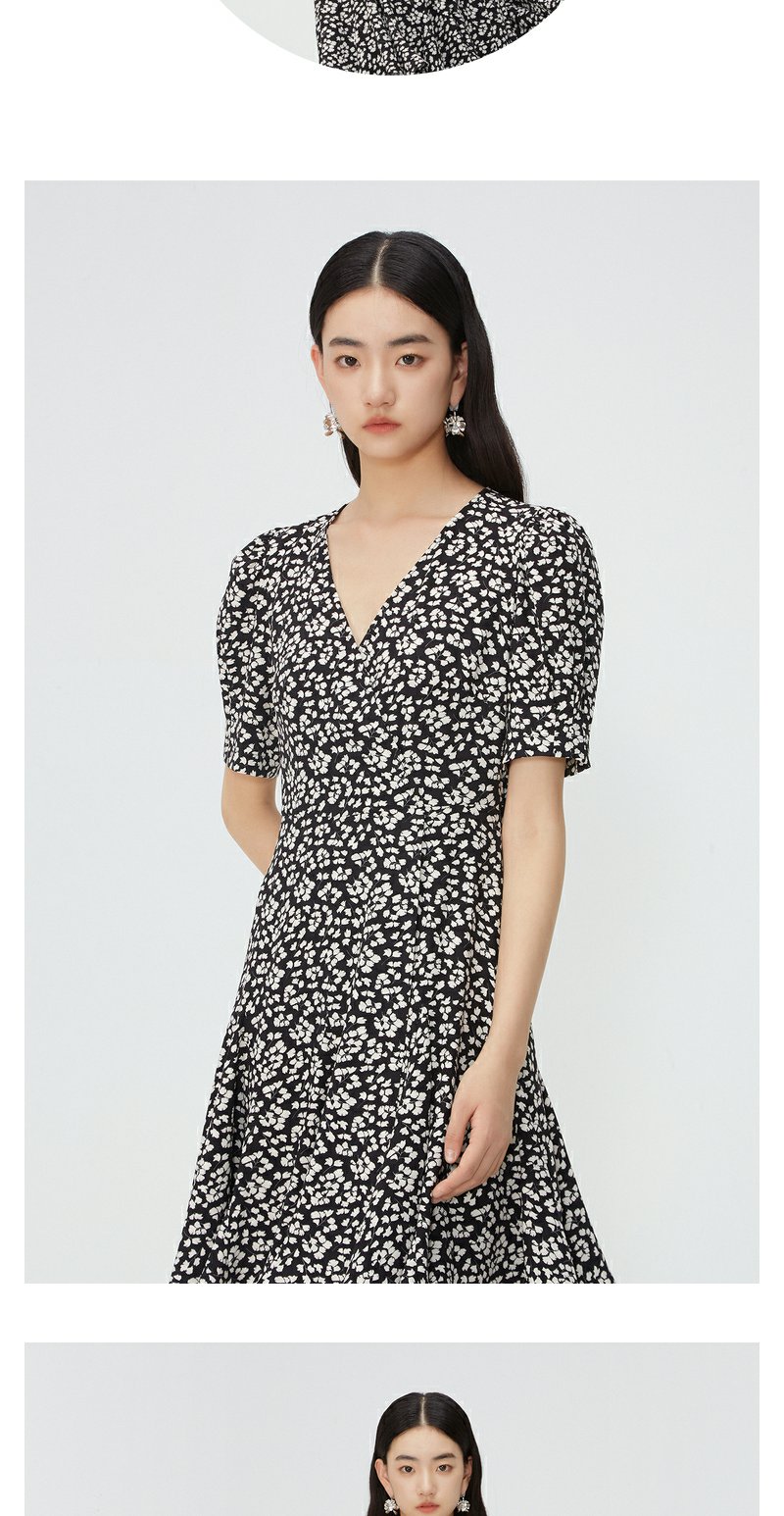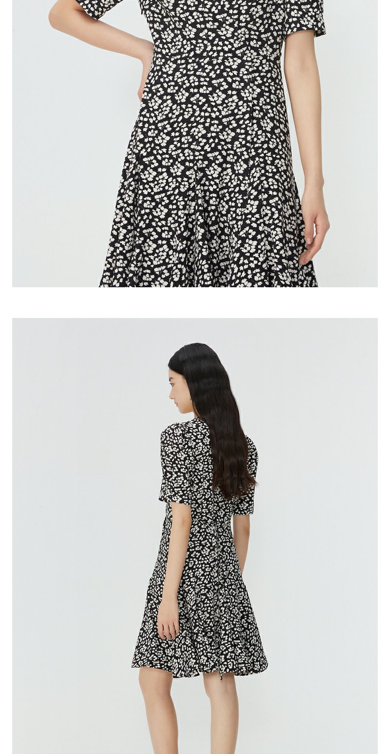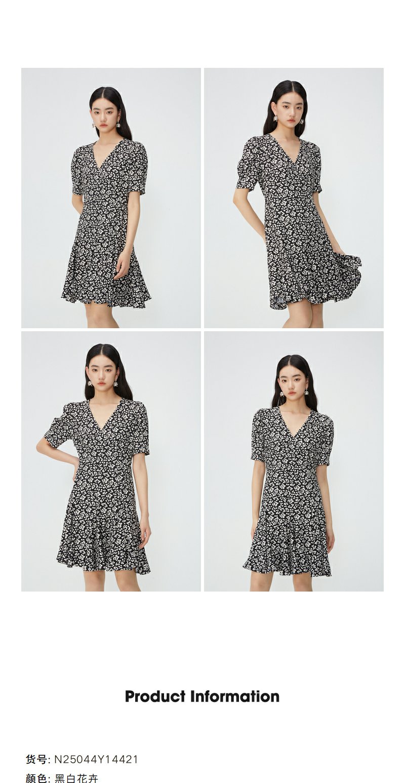 NEELLY纳俪商场同款夏新款黑白碎花连衣裙女短袖V领法式优雅长裙N25044Y14421
