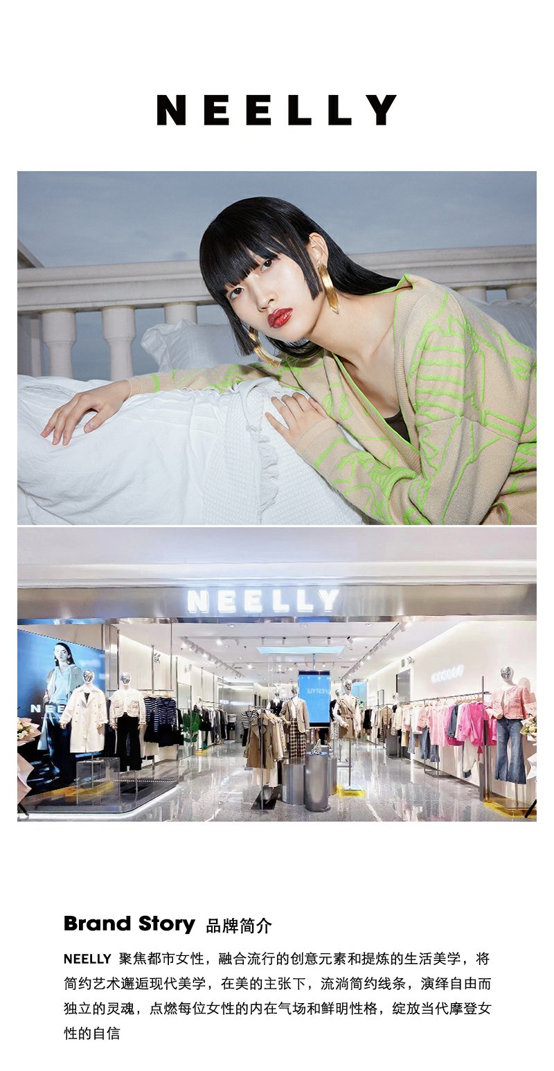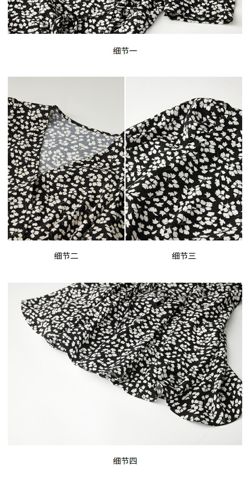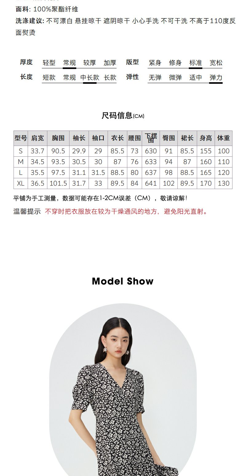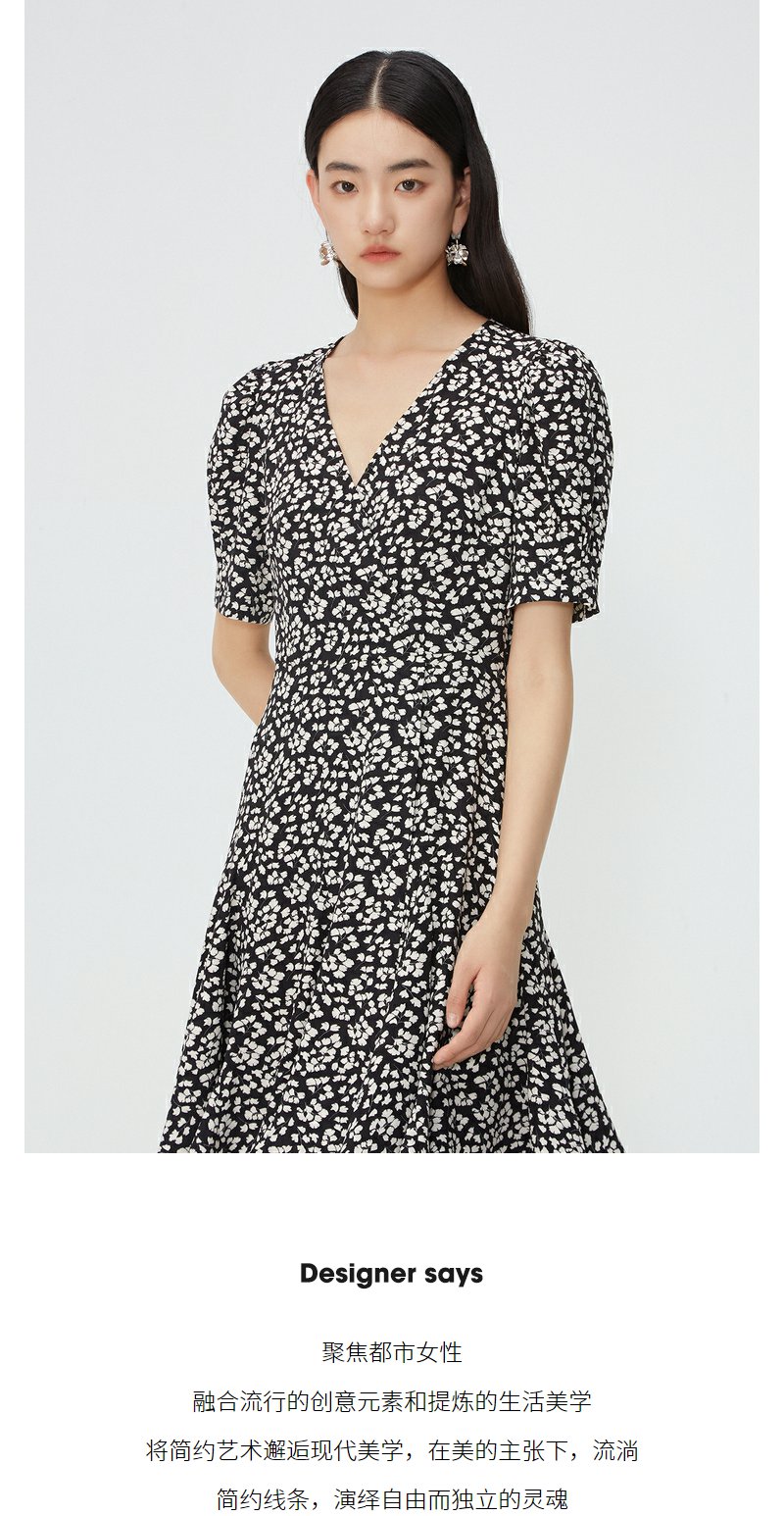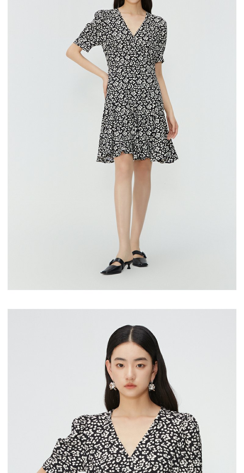 NEELLY纳俪商场同款夏新款黑白碎花连衣裙女短袖V领法式优雅长裙N25044Y14421