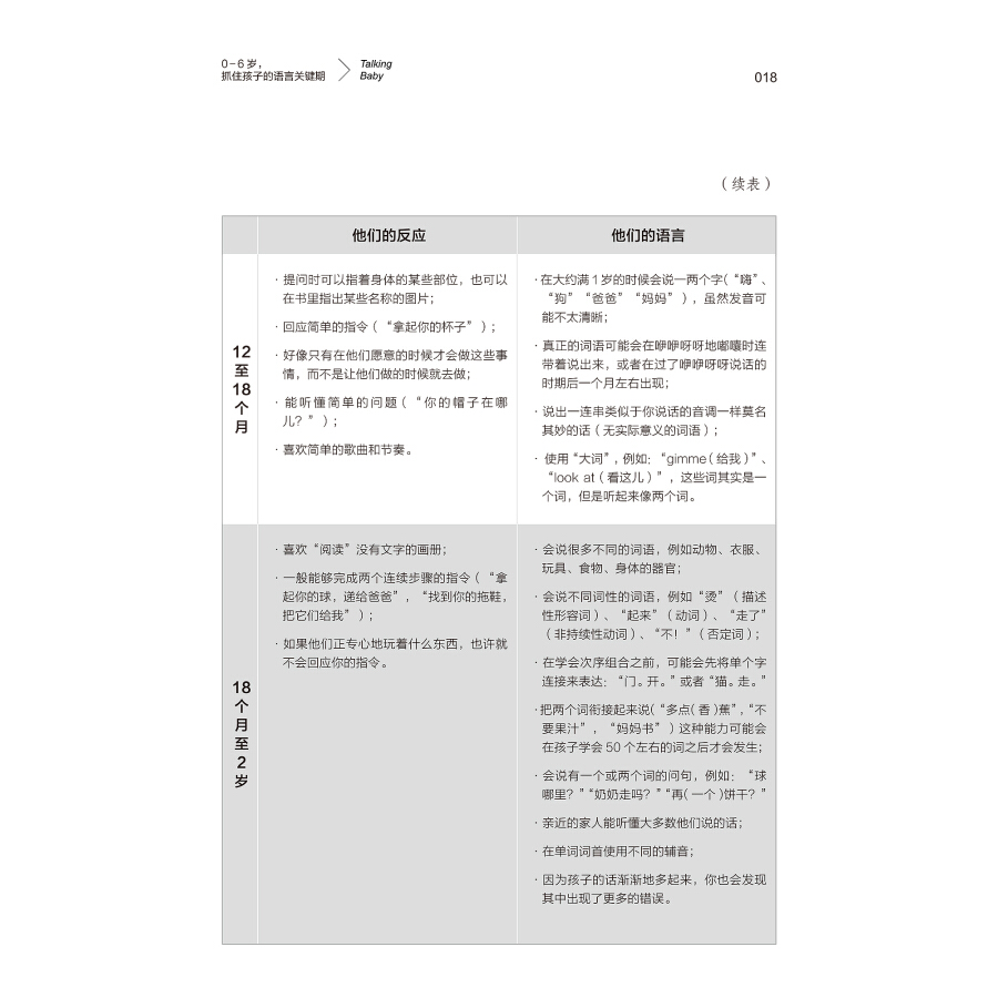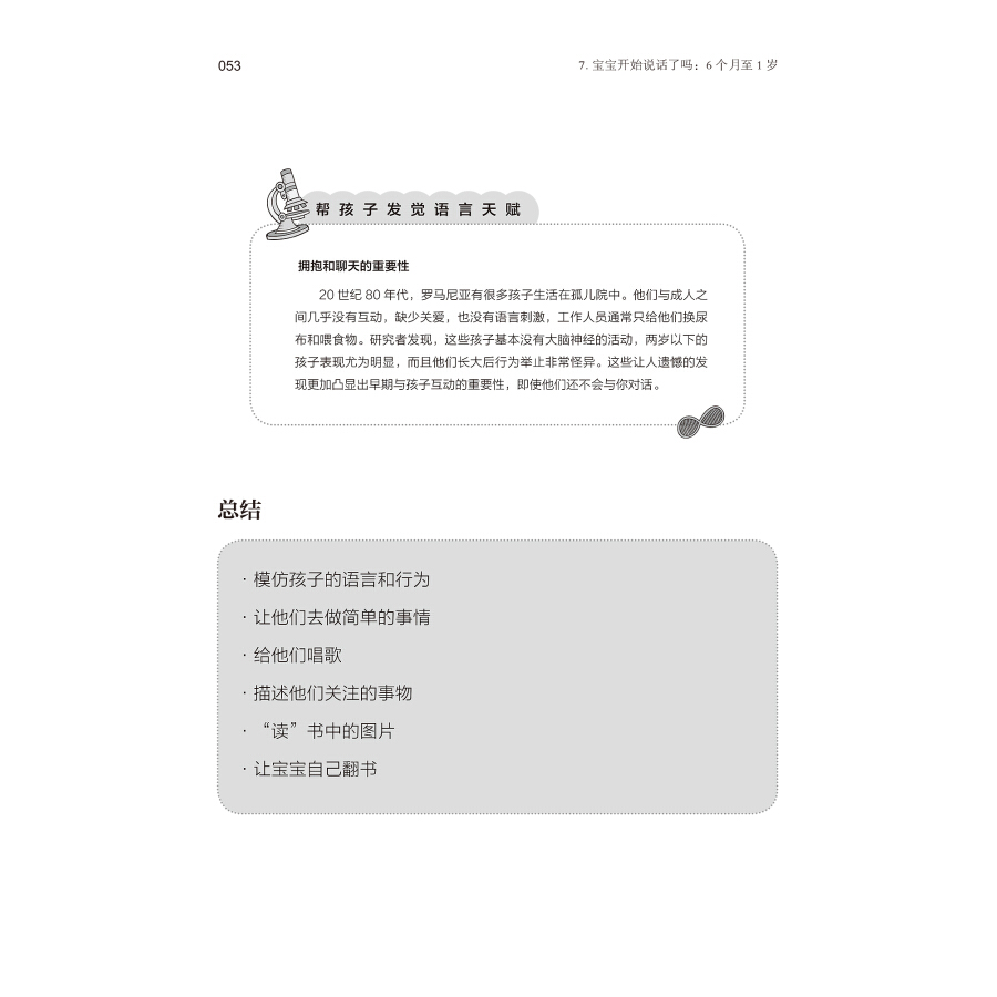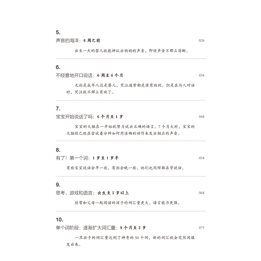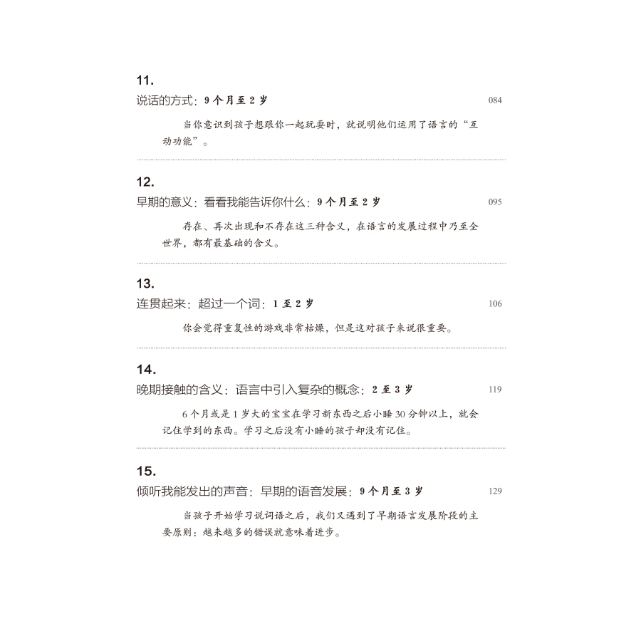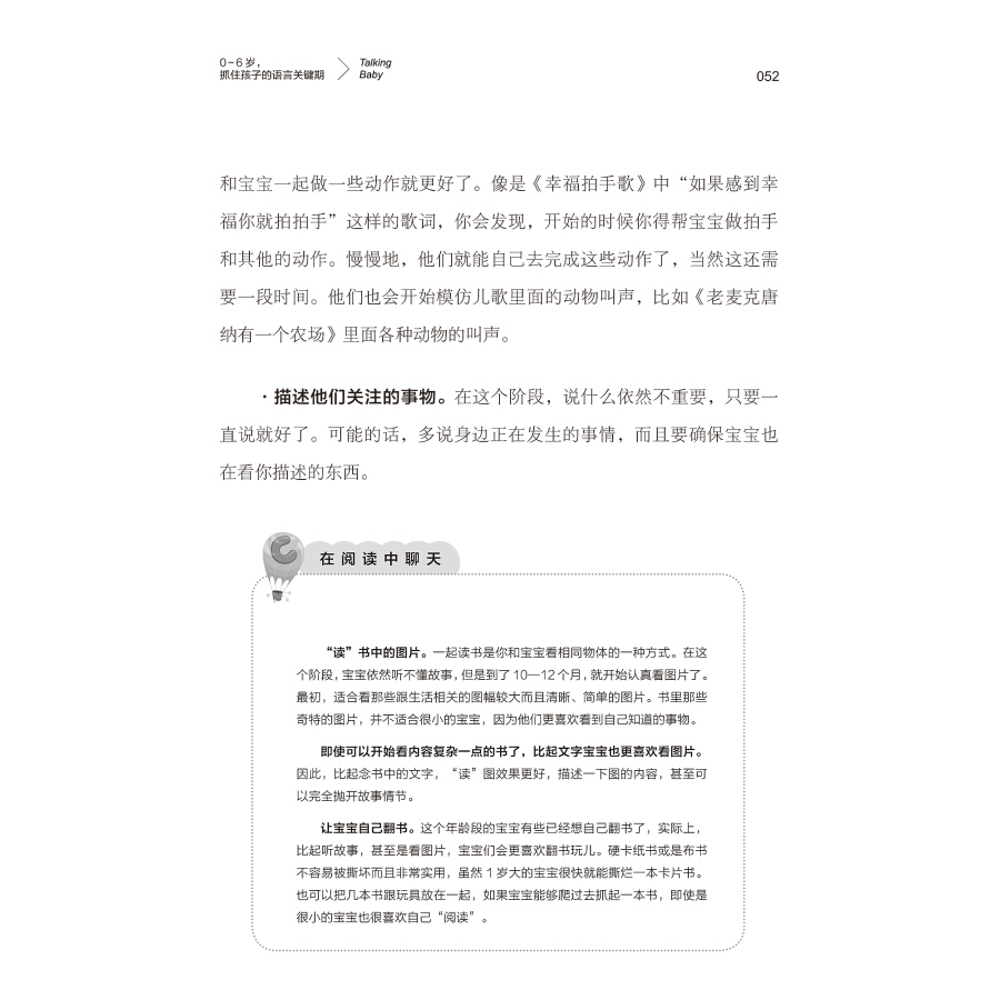 本书从婴幼儿语言发育的规律出发,帮助父母们理解并培养孩子自然地发展语言能力。书中认为,在新生儿出生开始对他们说话,而且一直到学龄前都要与孩子一起欢笑、进行简单的对话、一起阅读以及游戏的重要性。