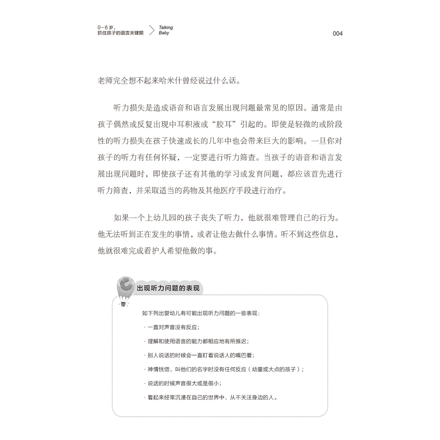 听力损失是造成语音和语言发展出现问题常见的原因。通常是由孩子偶然或反复出现中耳积液或"胶耳"引起的。即使是轻微的或阶段性的听力损失在孩子快速成长的几年中也会带来巨大的影响。一旦你对孩子的听力有任何怀疑,一定要进行听力筛查。当孩子的语音和语言发展出现问题时,即使孩子还有其他的学习或发育问题,都应该首先进行听力筛查,并采取适当的药物及其他医疗手段进行治疗。