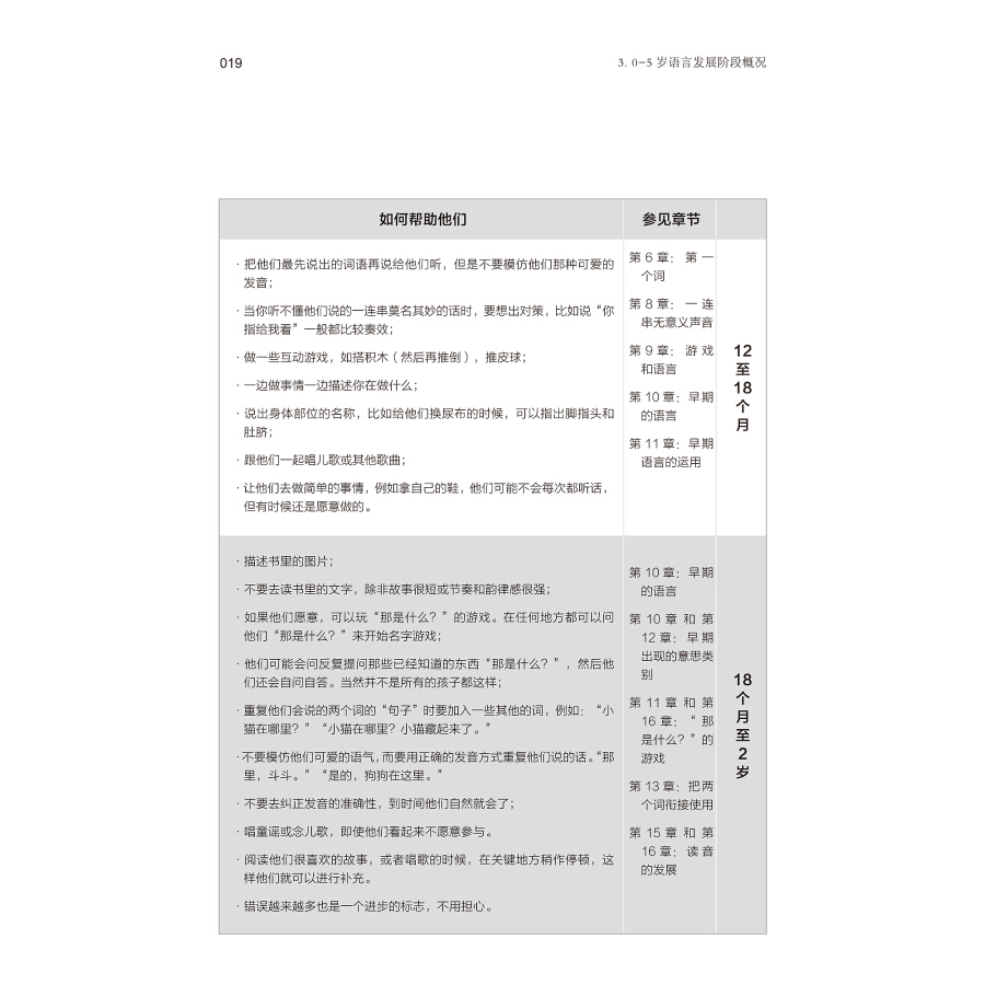 幼儿教师、医生以及其他教育和健康专家都了解孩子成长发育不同阶段的细节特征和里程碑式事件。这让他们能认识到每个孩子独特的行为模式,并判断出孩子是否有什么问题,以及是否需要专业人士帮助。我们在表1(di16-21 页)中列出了一系列语音和语言的发展阶段,在表2(di68-71 页)中列出了行为的发展阶段,并且在表4(di132 页)中还列出了辅音发音发展的典型年龄。