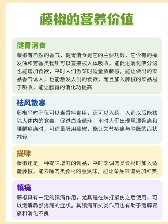 藤椒不仅味道好,营养价值也很在线 能促进消化,还可以入药,祛风散寒 藤椒中还有多种天然的灭菌成分,解毒杀菌 还能去除肉类食材的腥臭味 让做好的菜品味道更加鲜 可以说藤椒是四川家家户户的宝藏食材~⭐